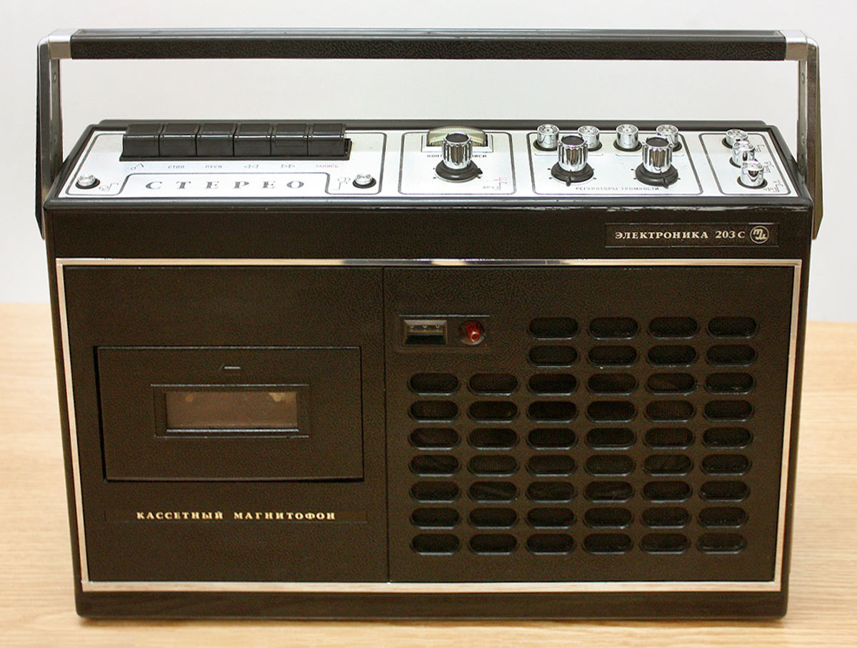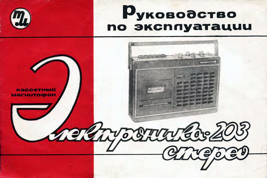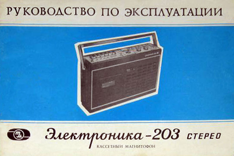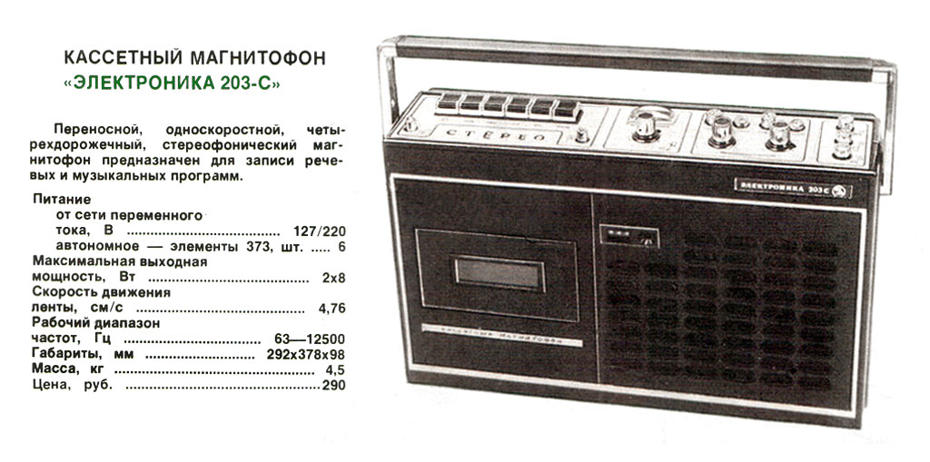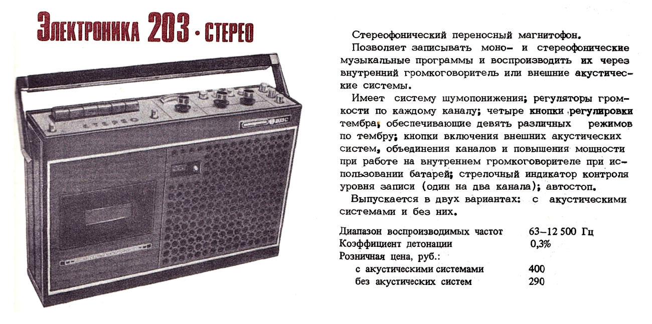 Стереофонический кассетный магнитофон *Электроника-203-стерео* с 1980 года выпускал Зеленоградский завод ТочМаш. Магнитофон рассчитан на запись или воспроизведение фонограмм с кассет типа МК-60. Магнитофон имеет динамический шумоподавитель, отключаемую систему АРУЗ, автостоп при окончании ленты в кассете, счётчик расхода магнитной ленты. Магнитофон может работать на встроенный громкоговоритель типа 2ГД-40 или на выносные АС, в каждой из которых установлено две головки 6ГД-6 и ЗГД-31. Питается магнитофон от шести элементов А-373 или от электрической сети через блок питания БП-203, вставляемый в отсек питания. Номинальная выходная мощность на громкоговоритель - 1 Вт, на внешние АС - 2х2 Вт. Рабочий диапазон звуковых частот на линейном выходе 63...12500 Гц, на собственном громкоговорителе 100...1000 Гц, на АС - 75...12500 Гц. Коэффициент детонации ± 0,3%. Габариты магнитофона - 305х390х108 мм. Вес с АС - 4,5 кг. Цена с АС 360 рублей. Первая партия магнитофонов выпускалась с кнопками тембров, которые впоследствии заменены регуляторами на сопротивлениях.