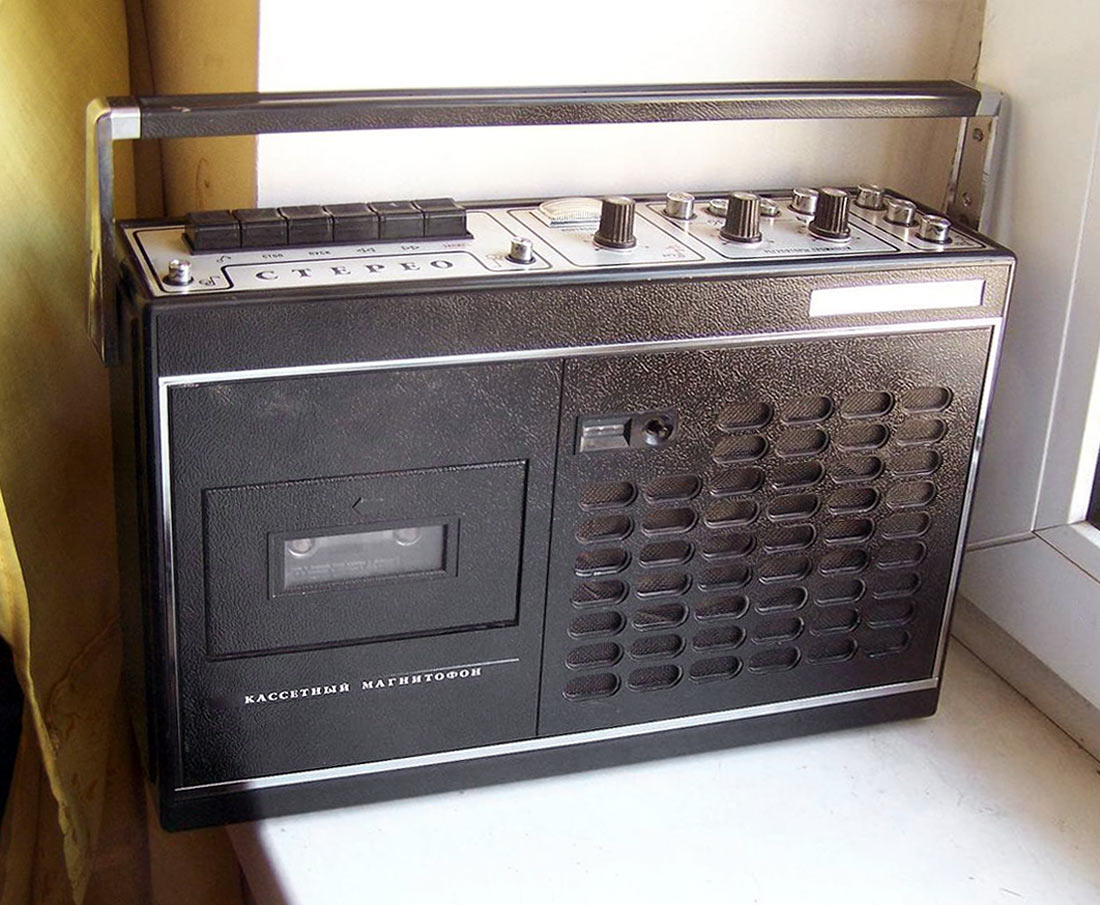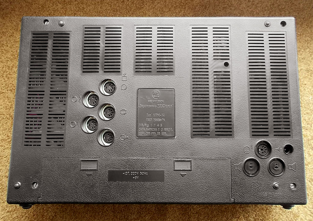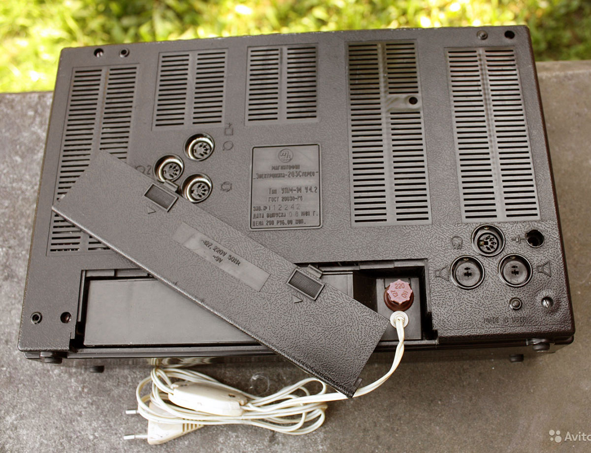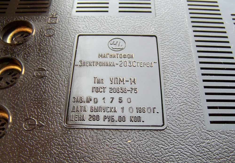 Стереофонический кассетный магнитофон *Электроника-203-стерео* с 1980 года выпускал Зеленоградский завод ТочМаш. Магнитофон рассчитан на запись или воспроизведение фонограмм с кассет типа МК-60. Магнитофон имеет динамический шумоподавитель, отключаемую систему АРУЗ, автостоп при окончании ленты в кассете, счётчик расхода магнитной ленты. Магнитофон может работать на встроенный громкоговоритель типа 2ГД-40 или на выносные АС, в каждой из которых установлено две головки 6ГД-6 и ЗГД-31. Питается магнитофон от шести элементов А-373 или от электрической сети через блок питания БП-203, вставляемый в отсек питания. Номинальная выходная мощность на громкоговоритель - 1 Вт, на внешние АС - 2х2 Вт. Рабочий диапазон звуковых частот на линейном выходе 63...12500 Гц, на собственном громкоговорителе 100...1000 Гц, на АС - 75...12500 Гц. Коэффициент детонации ± 0,3%. Габариты магнитофона - 305х390х108 мм. Вес с АС - 4,5 кг. Цена с АС 360 рублей. Первая партия магнитофонов выпускалась с кнопками тембров, которые впоследствии заменены регуляторами на сопротивлениях.