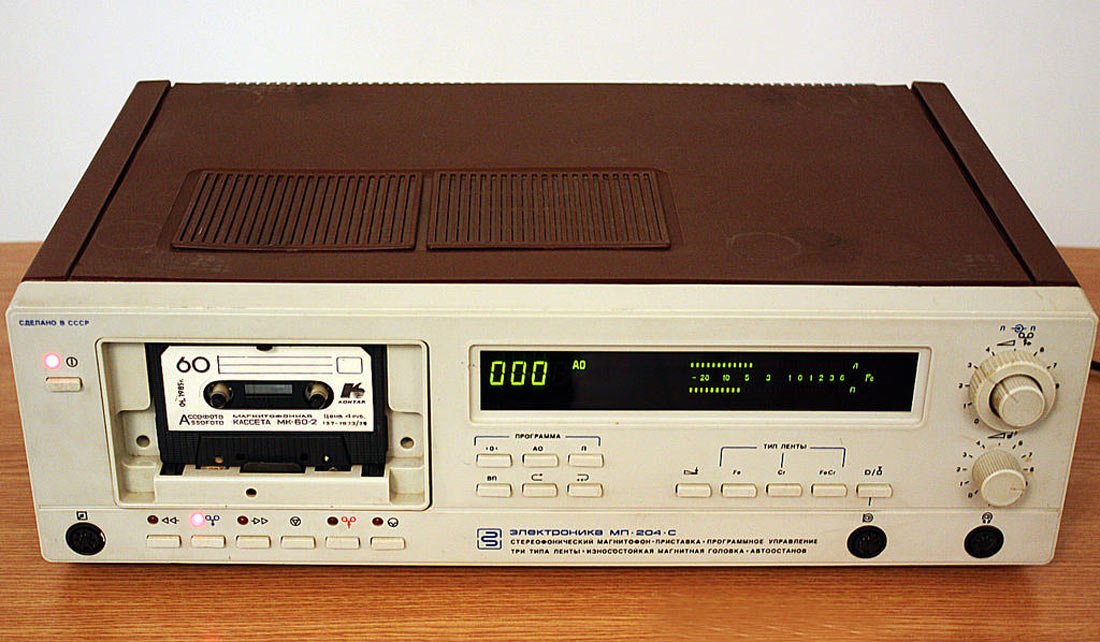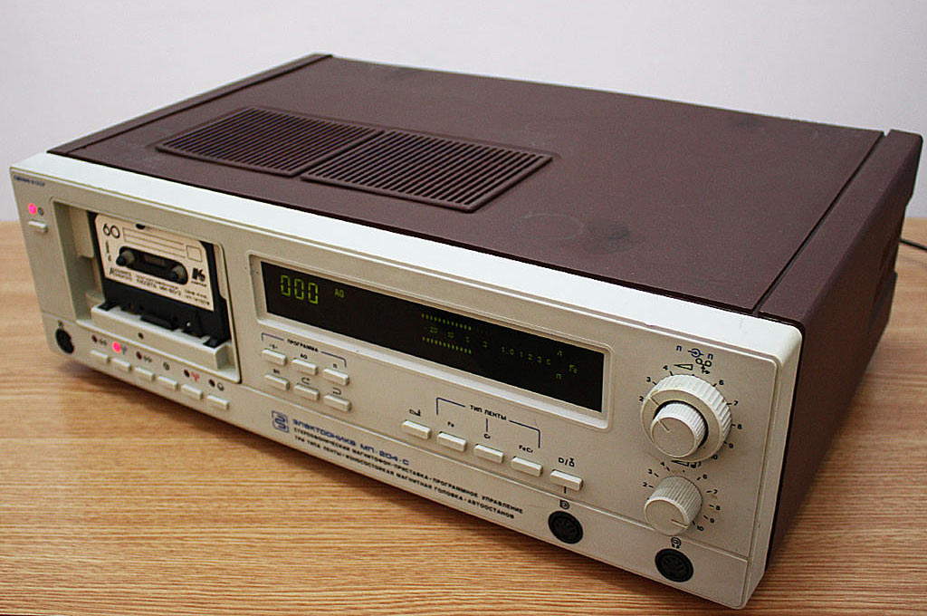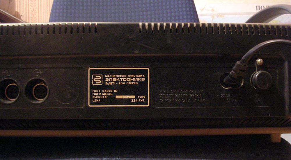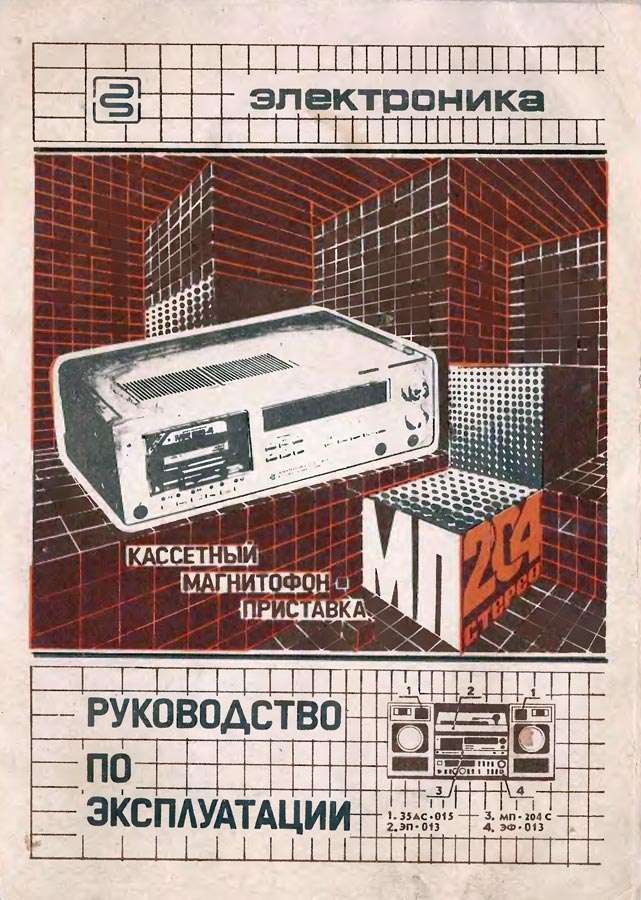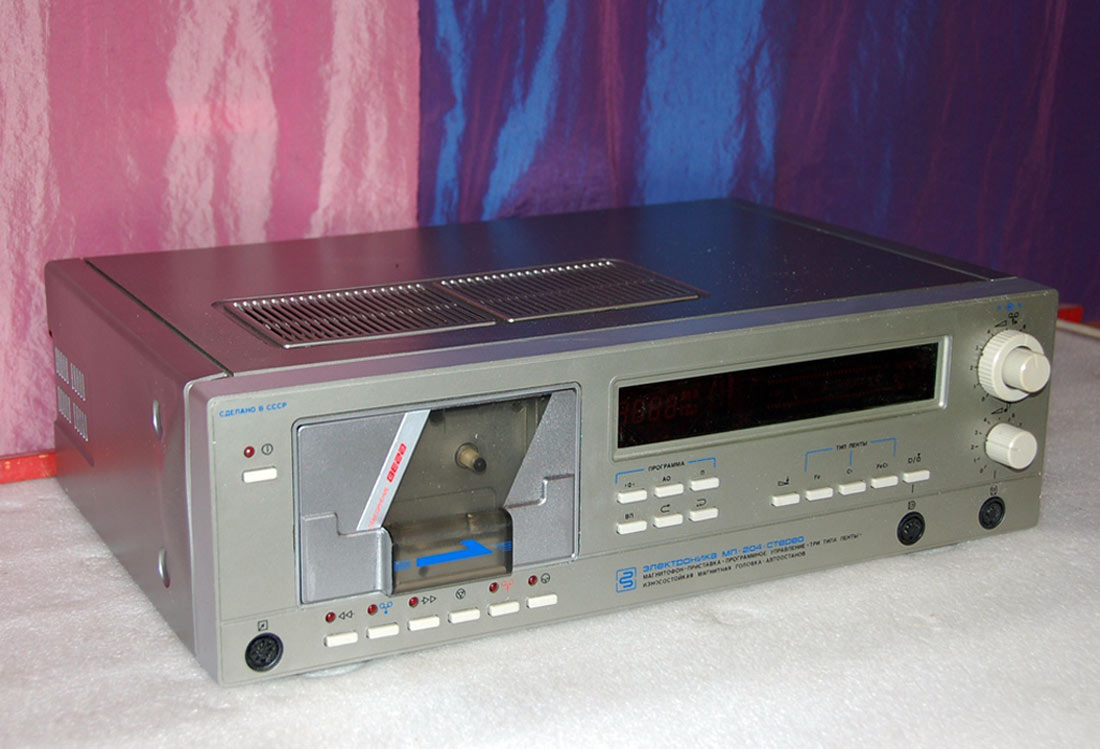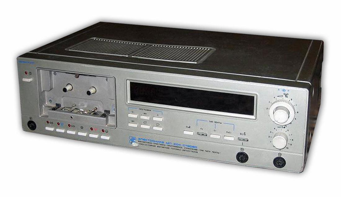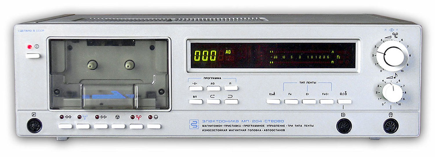 Магнитофон-приставку *Электроника-204-стерео* с 1987 года выпускал Полтавский завод специального технологического оборудования. МП предназначена для записи моно или стереофонических фонограмм на магнитную ленту в кассетах МК и последующего их воспроизведения с помощью внешнего усилителя и АС. В приставке применено электронно-логическое квазисенсорное устройство управления режимами работ, электролюминесцентный индикатор уровня записи и воспроизведения, шумопонижающий фильтр *Маяк*. Есть световая индикация режимов работы, расхода ленты, включения, индикация среднего уровня записи и воспроизведения, перегрузок, контроль записываемого сигнала прослушиванием, электронно-логическое управление ЛПМ по сигналам **Память** (поиск фрагмента записи по паузам между фонограммами) и **Автостоп** (останов ЛПМ по окончании и обрыве ленты). Совместно с МП может работать устройство ДУ основными режимами работы. Скорость движения ленты 4,76 см/с. Коэффициент детонации ±0,2%. Диапазон частот звука при использовании ленты из гамма-окиси железа - 40...12500 Гц, двуокиси хрома - 40...14000 Гц, металлической - 40...16000 Гц. Относительный уровень шумов и помех -54 дБ. Потребляемая мощность 40 Вт. Габариты МП 460х130х360 мм. Масса 8,5 кг. Цена 320 рублей. С 1989 года МП именовался как **Электроника МП-204-cтерео**.