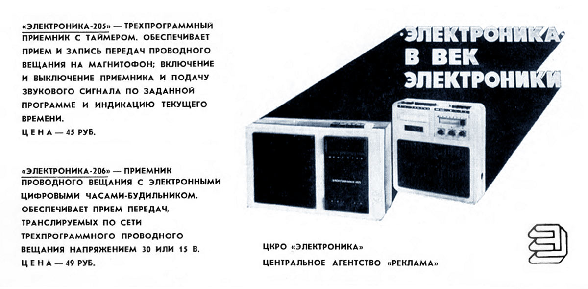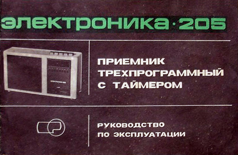 Приёмник трёхпрограммный *Электроника-205* с 1985 года выпускал Богородицкий завод *Ресурс*. Приёмник проводного вещания **Электроника ПТ-205** (с 1987 года *Электроника ПТ-205*) предназначен для работы в уплотнённых радиосетях. ПТ имеет: электронные часы с будильником и таймером; возможность автоматического включения программ. При отсутствии напряжения в сети обеспечивается приём первой НЧ программы по НЧ каналу. Имеется резервное питание часов ПТ от элемента **Крона**. ПТ выпускали как с ползунковыми регуляторами уровня громкости, так и с угловыми. Напряжение сети проводного радиовещания 30 В. Номинальная выходная мощность 0,5 Вт. Диапазон воспроизводимых звуковых частот по каналам РЧ - 160...6300 Гц, по НЧ каналу 100...12500 Гц. Потребляемая мощность 4 Вт. Габариты ПТ - 320 х 195 х 105 мм. Масса 2,4 кг.