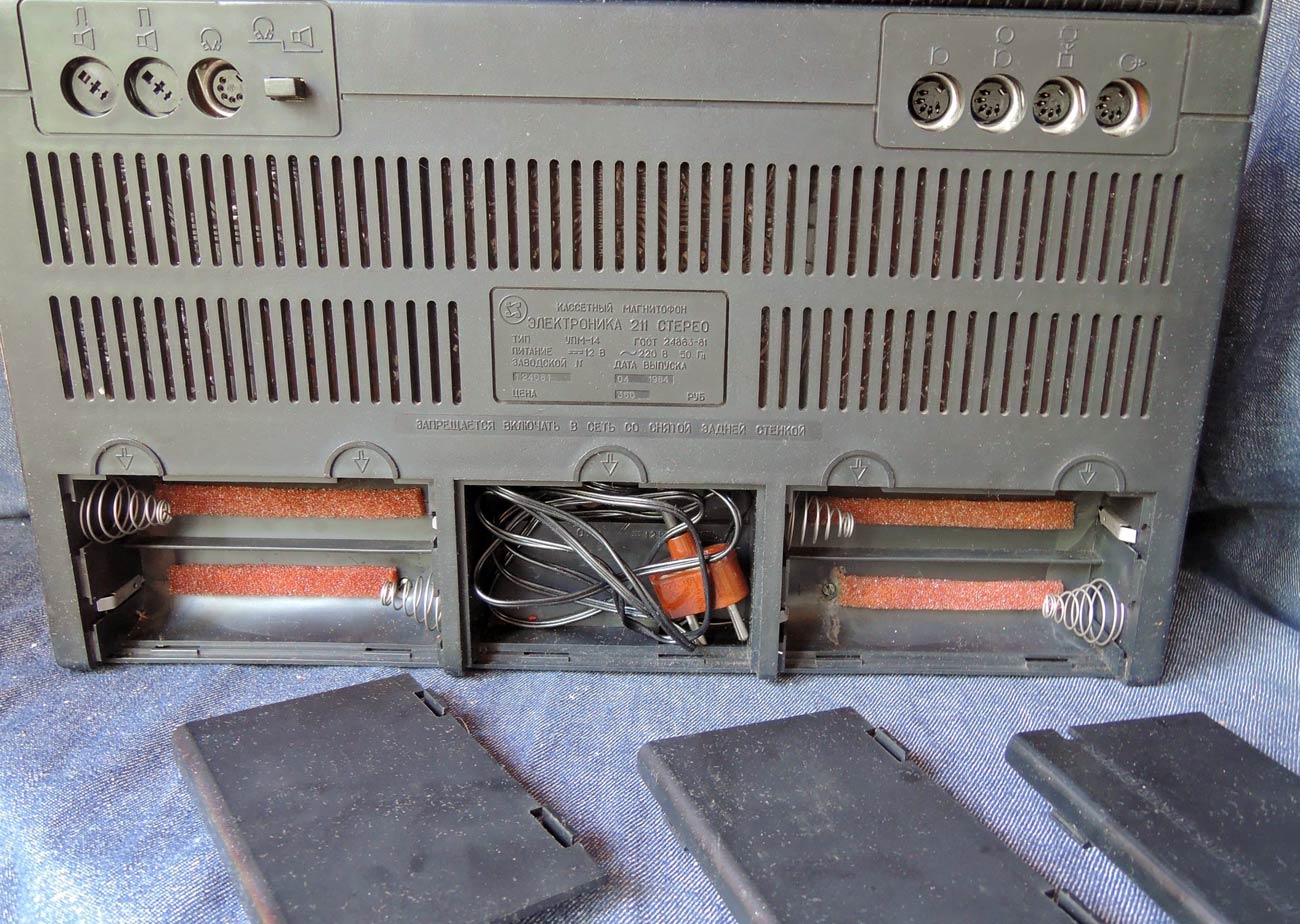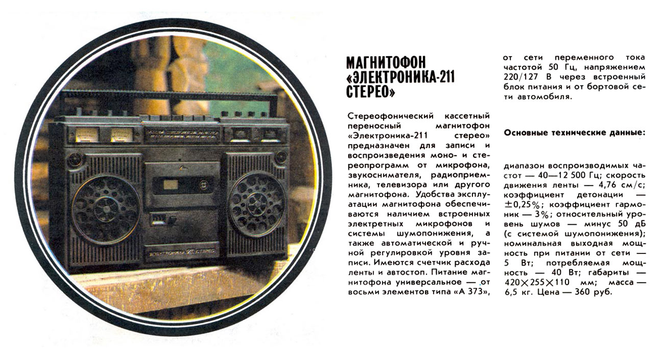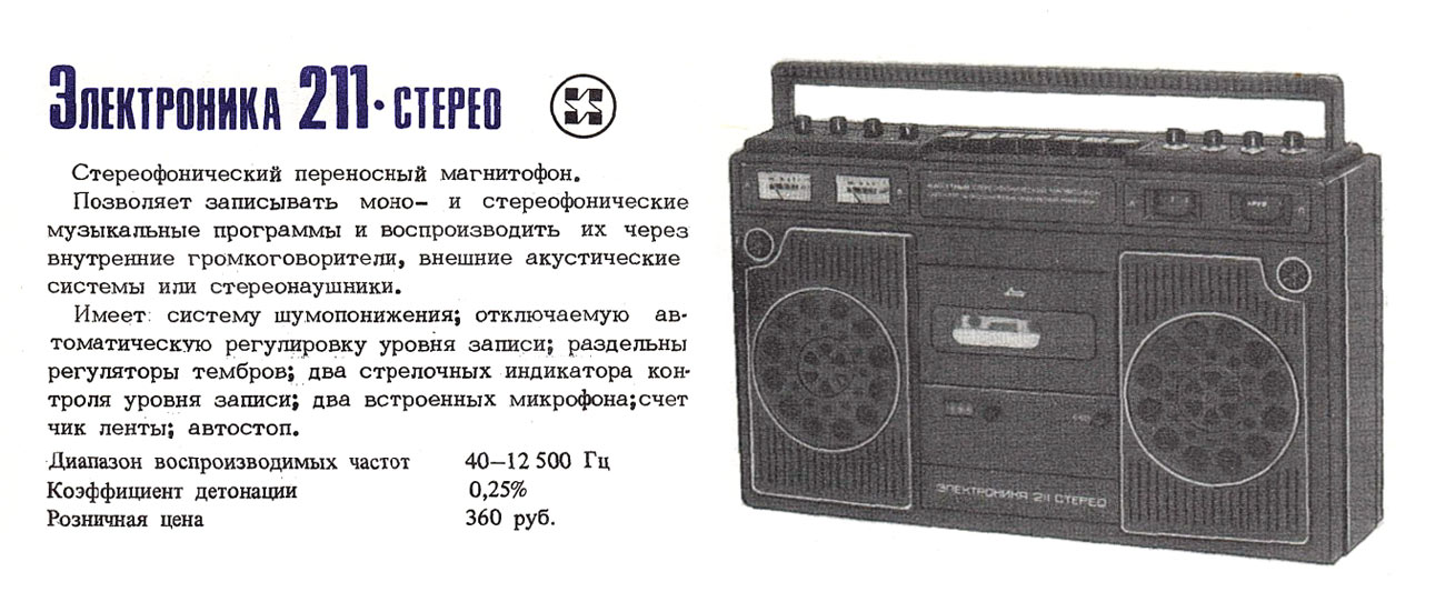Переносной кассетный магнитофон *Электроника-211-стерео* с 1982 года выпускал Нововоронежский завод *Алиот*. Магнитофон предназначен для записи и воспроизведения звуковых программ с микрофона, приёмника, звукоснимателя, телевизора и другого магнитофона. В магнитофоне предусмотрены ручная и автоматическая регулировка уровня записи, автостоп, устройство шумопонижения, раздельные регуляторы тембра НЧ и ВЧ, счётчик расхода ленты, два микрофона. Питание универсальное: от 8 элементов А-373, бортовой сети автомобиля или от сети переменного тока. Скорость движения ленты 4,76 см/сек. Коэффициент детонации ±0,25%. Номинальная выходная мощность при питании от электросети 2х5 Вт. Коэффициент гармоник 3%. Рабочий диапазон частот на ЛВ - 40...12500 Гц. Относительный уровень шумов с системой ШП -50 дБ. Мощность, потребляемая от сети не более 40 Вт. Габариты магнитофона - 420х255х110 мм. Масса 6,5 кг.