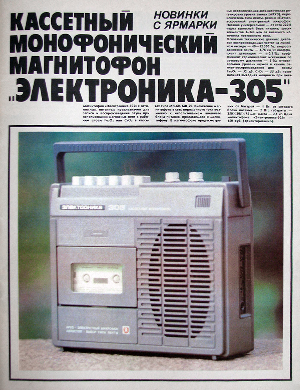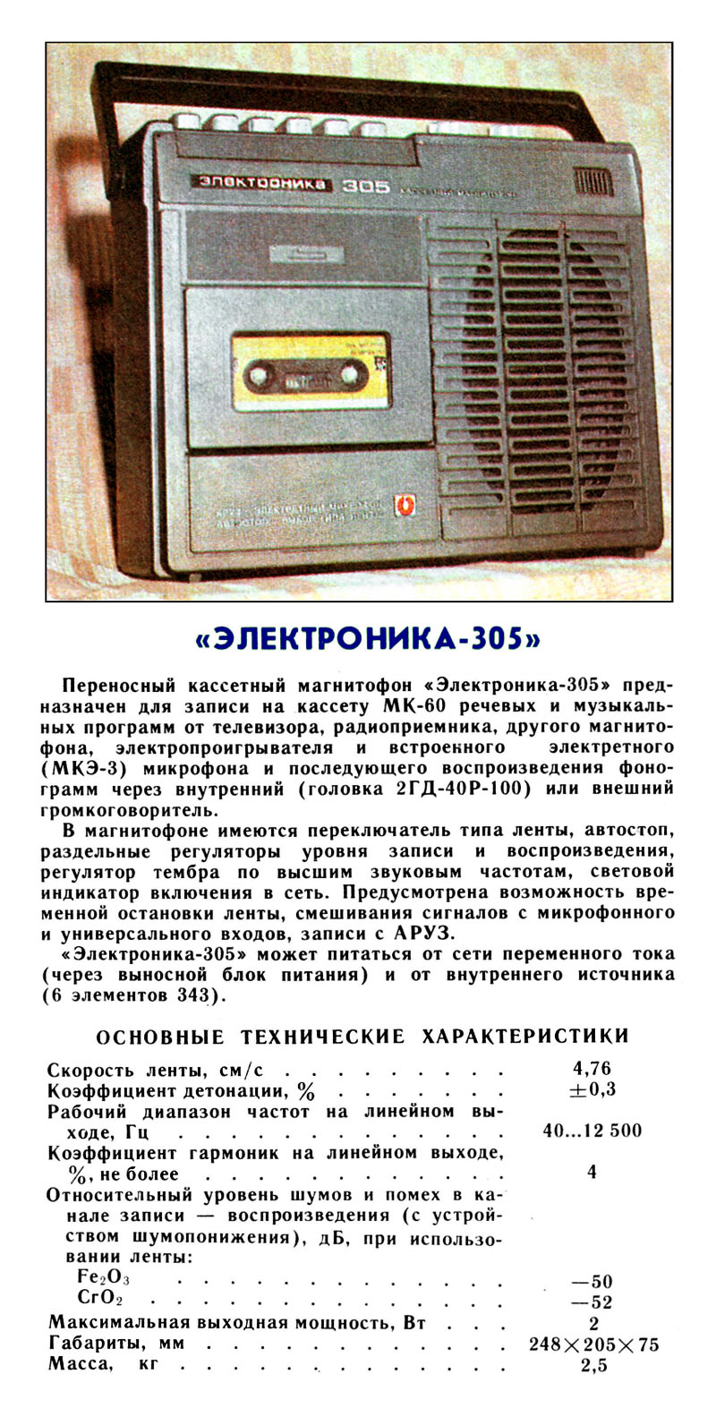 Переносный кассетный магнитофон *Электроника-305* подготовил к выпуску с 1983 года Саратовский завод *Корпус*. Магнитофон предназначен для записи на кассету МК-60 звуковых программ от телевизора и радиоприёмника, другого магнитофона, электропроигрывателя, встроенного электретного микрофона и воспроизведения записанных фонограмм через внутренний громкоговоритель типа 2ГД-40Р или внешнюю АС. В магнитофоне имеется переключатель типа ленты, автостоп, раздельные регуляторы уровня записи и воспроизведения, регулятор тембра по ВЧ световой индикатор включения в электрическую сеть. Имеется кнопка временной остановки ленты, смешивания сигналов с микрофонного и других входов, записи с АРУЗ. Магнитофон питается от сети 220 вольт через выносной блок питания или от 6 элементов 343. Скорость протяжки ленты 4,76 см/с. Коэффициент детонации ЛПМ - ±0,3%. Диапазон частот звука на линейном выходе 40...12500 Гц. Коэффициент гармоник на линейном выходе 4%. Относительный уровень шумов и помех в канале З/В с устройством ШП -50 дБ. Максимальная выходная мощность 2 Вт. Габариты магнитофона - 248х205х75 мм. Масса 2,5 кг. Ориентировочная цена от 150 до 172 рублей. Магнитофон разработан в нескольких вариантах оформления. Нет информации что магнитофон выпускался серийно.