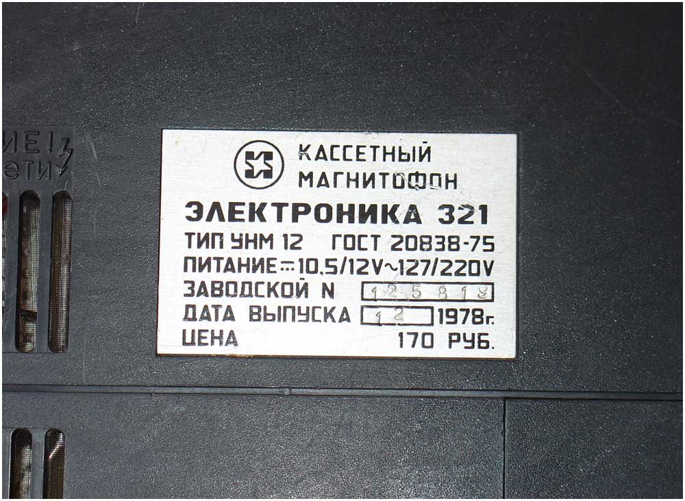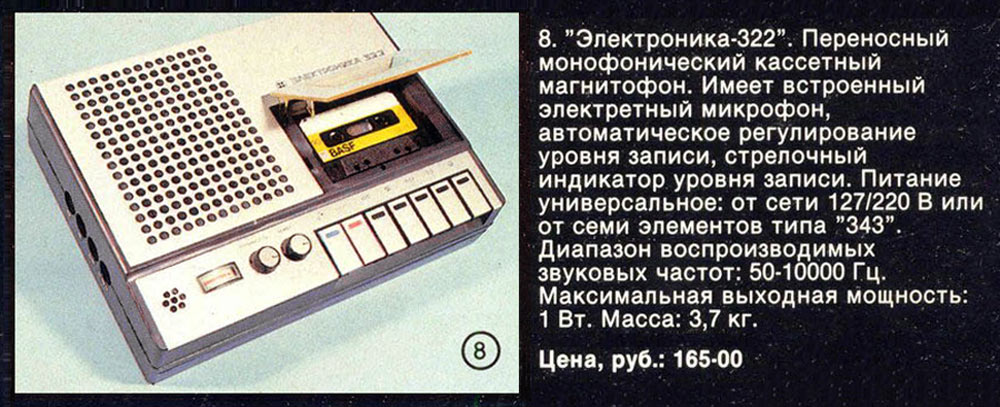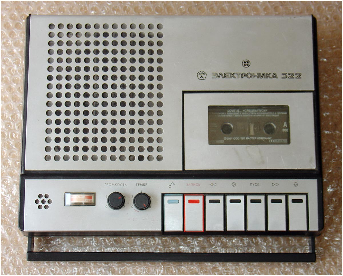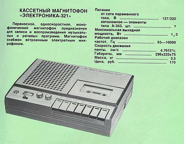 Портативные кассетные магнитофоны *Электроника-321* и *Электроника-322* с 1978 года выпускал Нововоронежский завод *Алиот*. Магнитофоны разработаны на базе ЛПМ магнитофона **Весна-305**. Здесь модернизирован привод фрикционного приёмного узла, установлены направляющие стойки для компакт-кассет и фиксаторы блока магнитных головок в вертикальном направлении. В **Электронике-321** применён встроенный электретный микрофон, ручная и автоматическая регулировка уровня записи, тонкомпенсированная регулировка громкости, громкоговоритель типа 1ГД-40. **Электроника-322** отличается тем, что в нём применён выносной микрофон МД-64М. Питание от сети или от 7 элементов 343. Магнитная лента А4203-3. Скорость протяжки ленты - 4,76 см/с. Коэффициент детонации ±0,35 %. Максимальная выходная мощность 1,8 Вт. Диапазон частот на ЛВ - 40...10000 Гц, громкоговорителе 100...8000 Гц. Габариты МГ- 296х220х75. Вес 3,8 кг.