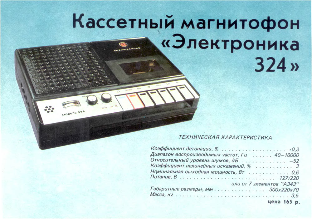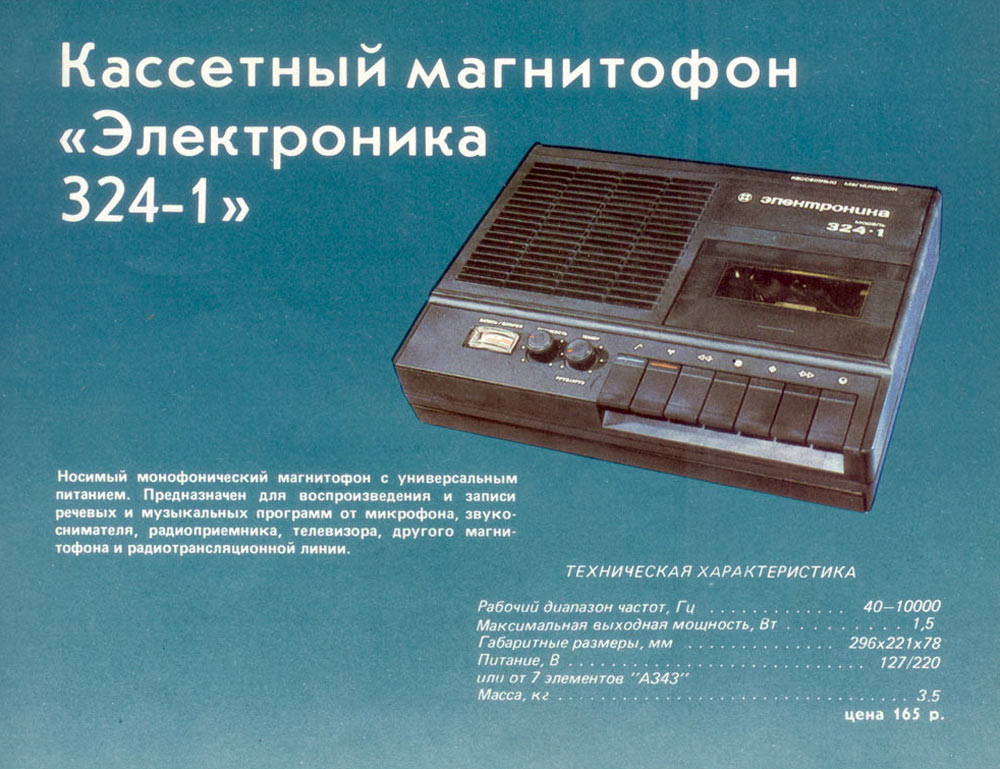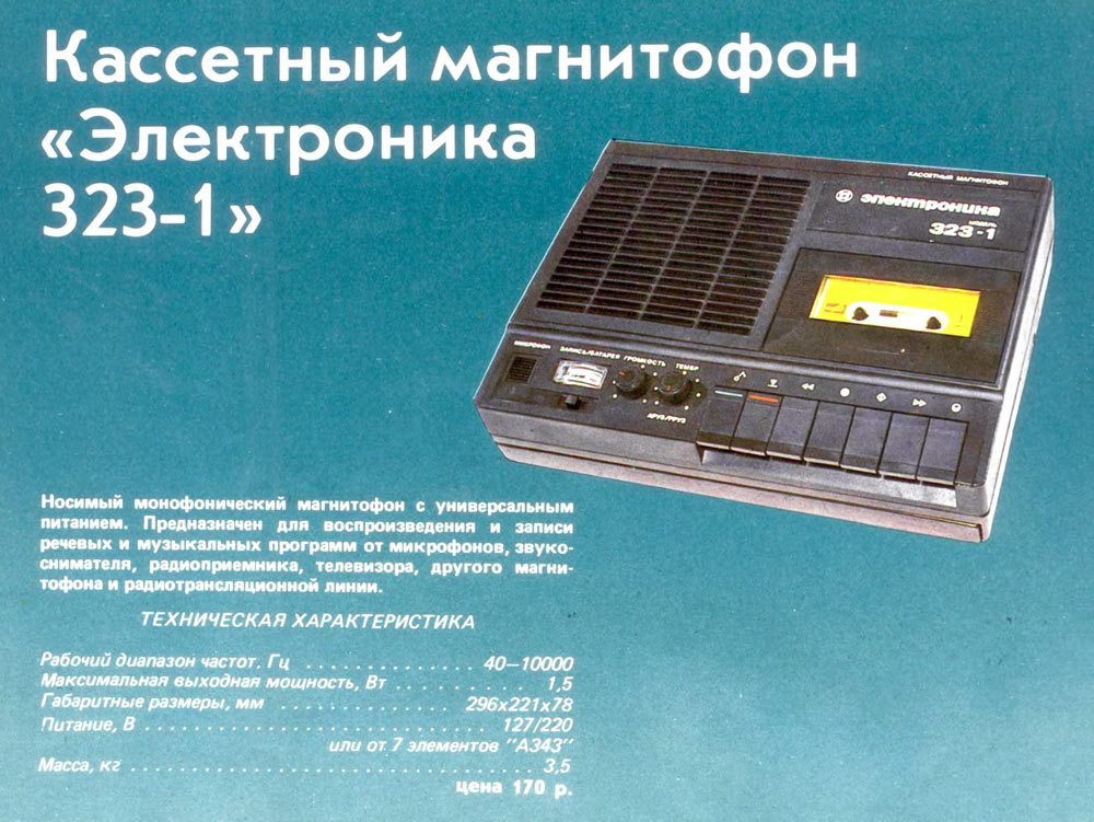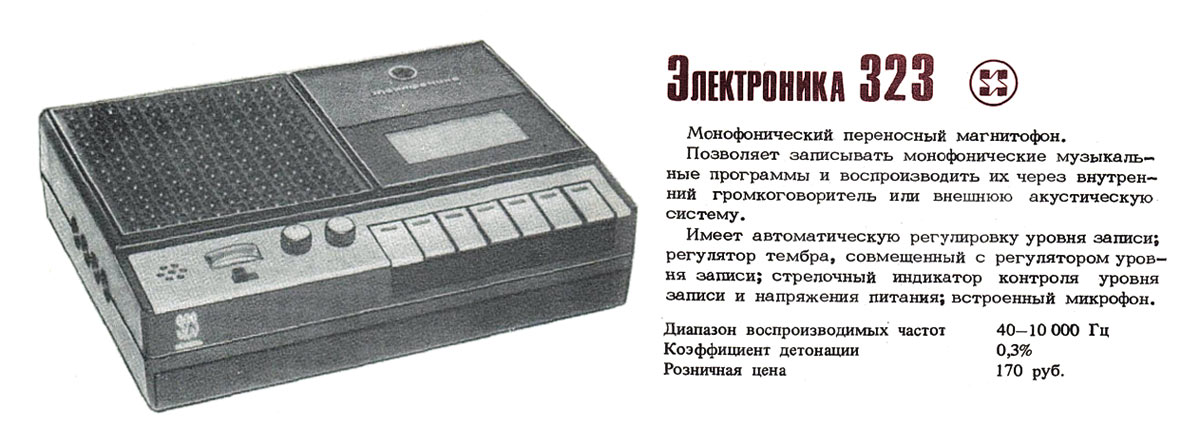 Портативные кассетные магнитофоны *Электроника-323*, *Электроника-323-1*и *Электроника-324*, *Электроника-324-1* с 1981 года (без цифры *1*) и с 1987 года (с цифрой *1*) выпускал Нововоронежский завод *Алиот*. Магнитофоны предназначены для записи и воспроизведения звуковых фонограмм. Встроенный сетевой блок питания, питание от батарей и аккумулятора автомобиля, делает магнитофоны удобными в применении. По схеме и конструкции магнитофоны схожи, отличие в отсутствии встроенного электретного микрофона в магнитофоне **Электроника-324**. С 1987 года выпускались модернизированные магнитофоны **Электроника-323-1** и **Электроника-324-1** кроме оформления не отличаются от базовых. В отдельных сериях модернизированных магнитофонов в предварительные усилители вместо транзисторов ставили микросхему серии К118УН.