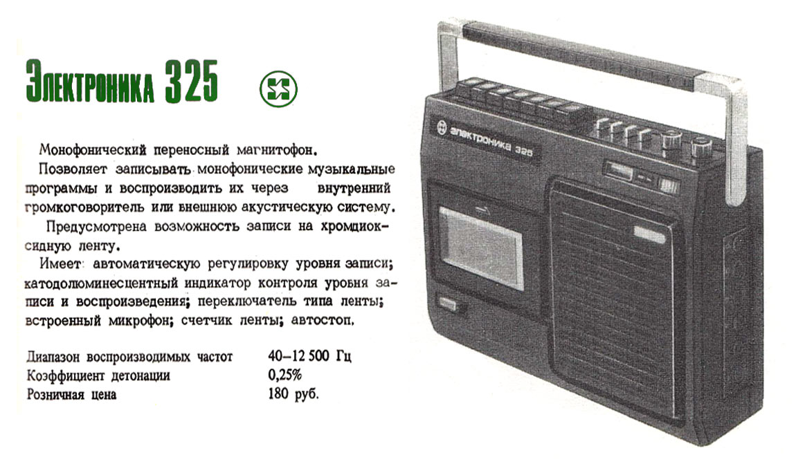 Портативный кассетный магнитофон *Электроника-325* (Электроника МФ-325) разработал и подготовил к выпуску с начала 1985 года Нововоронежский завод *Алиот*. В производство по каким-то причинам магнитофон не запущен, было изготовлено только несколько опытных экземпляров. Описание магнитофона *Электроника-325* и его технические характеристики ниже, в рекламных проспектах.