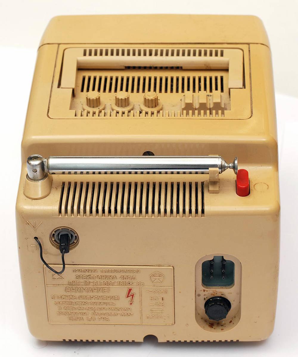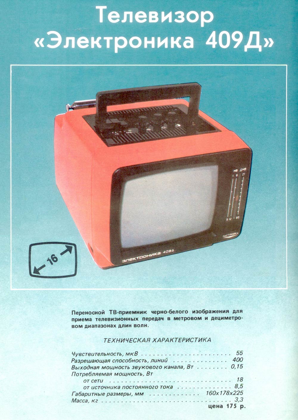 Телевизионный приёмник чёрно-белого изображения *Электроника-409/Д* с 1988 года выпускал Хмельницкий завод *Катион*. **Электроника-409/Д** - малогабаритный полупроводниковый телевизор с применением интегральных схем. В модели применен кинескоп типа 16ЛК8Б с размером экрана по диагонали 16 см и углом отклонения электронного луча 70°. Телевизор обеспечивает приём телевизионных передач на любом из 12 каналов МВ диапазона, а телевизор с индексом **Д** и на любом иэ 40 каналов ДМВ диапазона; прослушивание звукового сопровождения на головные телефоны, при включенной АС. Эффективная АРУ обеспечивает устойчивое изображение. Модель состоит из нескольких функциональных узлов размещённых в пластмассовом корпусе. Монтаж печатный выполнен на 3-х поворотных платах. В телевизоре применена электронная настройка на принимаемый канал ручкой **Настройка**, расположенной на передней панели телевизора. Размер изображения 98х120 мм. Чувствительность модели в диапазоне МВ - 40, ДМВ - 70 мкВ. Разрешающая способность 400 линий. Номинальная выходная мощность 0,15 Вт. Потребляемая мощность от сети 17 Вт, от источника 12 В. 8 Вт. Габариты телевизора 178х160х525. Масса 3,15 кг. С 1990 года Хмельницкий завод *Катион* и Раховский завод *Конденсатор* на основе телевизора выпускали видеоконтрольное устройство *Электроника-409 ВКУ* рассчитанное на работу с видеокамерой *Электроника Л-50*.