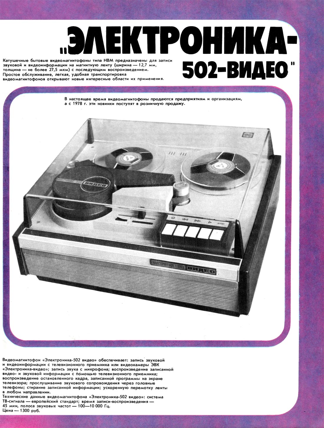 Бытовой катушечный видеомагнитофон *Электроника-502-видео* с 1976 года выпускало Воронежское НПО *Электроника*. Видеомагнитофон **Электроника-502-видео** предназначен для записи видеоинформации и звука на магнитную ленту шириной 12,7 мм и толщиной 27,5 мкм, с их последующим воспроизведением. Видеомагнитофон обеспечивает: запись звуковой и видеоинформации с телевизора не ниже 2 класса или видеокамеры **Электроника-Видео**, запись звука с микрофона, воспроизведение записанного на телевизоре, прослушивание звукового сопровождения на головные телефоны, стирание записанной информации и ускоренную перемотку ленты в любом направлении. Питание от сети переменного тока 127/220 В. Потребляемая мощность 100 Вт. Система звуко и видеозаписи наклонно-строчная, двумя вращающимися видеоголовками, ЧМ-сигнал. Время записи 45 минут, ускоренной перемотки 5 минут. Скорость движения ленты 16,32 см/сек. Разрешающая способность 250 линий. Диапазон воспроизводимых частот звука 100...10000 Гц. Габариты видеомагнитофона - 425х375х202 мм. Масса 15 кг.