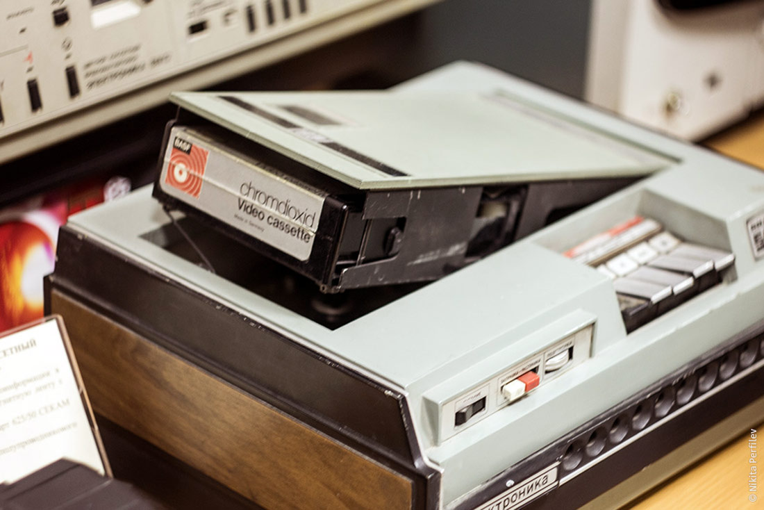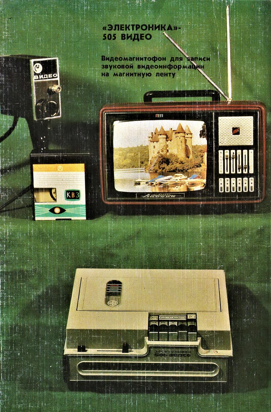 Кассетный видеомагнитофон *Электроника-505-видео* с 1974 года опытно выпускало Воронежское НПО *Электроника*. Он представляет собой транзисторно-интегральный цветной кассетный видеомагнитофон стандарта VCR, с наклонно-строчным способом записи 2-мя видеоголовками. Видеомагнитофон предназначен для записи и воспроизведения цветных и ч/б видеосигналов, а также звукового сопровождения от телевизора с согласующим устройством типа УСЦТ-2. Кроме того, аппарат позволяет производить запись ч/б видеоинформации и звукового сопровождения от видеокамеры. Питается ВМ от сети переменного тока через внешний блок питания или от аккумуляторов. Скорость протяжки ленты 14,29 см/с. Разрешающая способность по горизонтали в канале яркости 250, цветности 200 линий. Отношение сигнал/помеха в канале изображения 40 дБ, звукового сопровождения 38 дБ. Диапазон частот канала звука 80...10000 Гц. Коэффициент детонации ± 0,3 %. Потребляемая мощность 30 Вт. Габариты модели - 318x269x132 мм, блока питания - 119x247x90 мм. Масса модели - 10 кг, блока питания - 3 кг. Цена аппарата - 2500 рублей. Разработка и первые выпуски видеомагнитофонов имели оформление как на основном изображении, а немного позднее уже привычное всем оформление. Предположительно в 1977 году документация по видеомагнитофону была передана Раменскому приборостроительному заводу, на котором с 1979 года видеомагнитофон выпускался под наименованием *Сатурн-505-видео*.