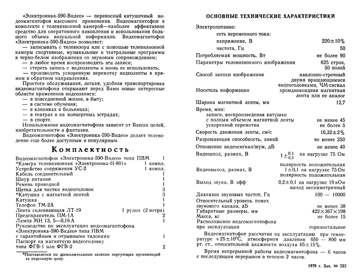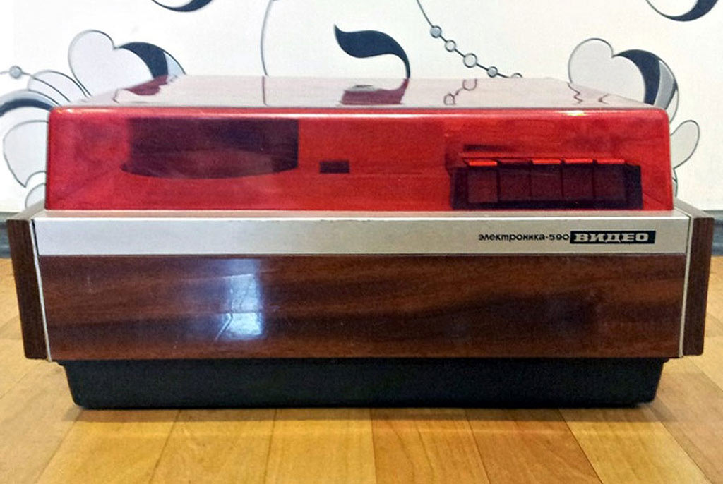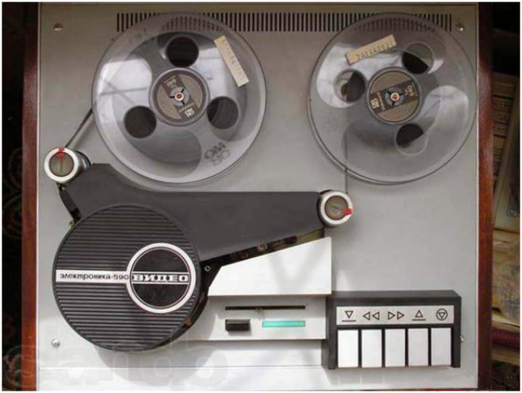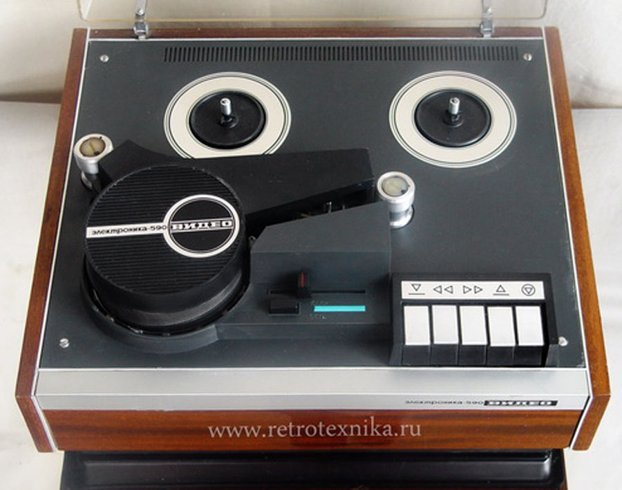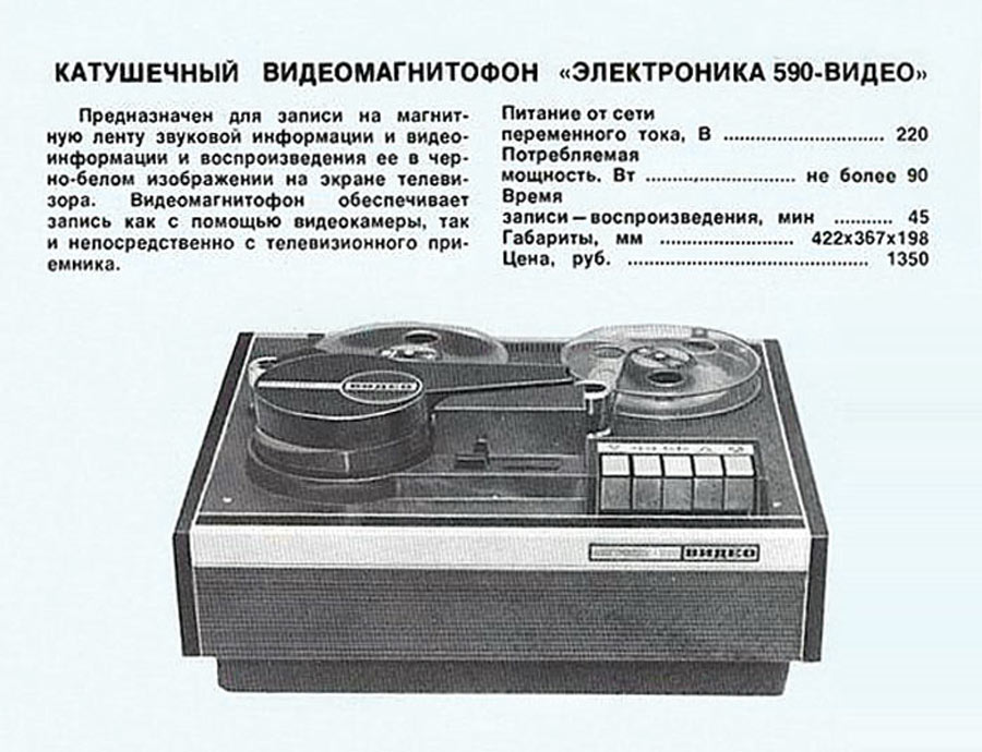 Катушечный видеомагнитофон *Электроника-590-видео* с середины 1978 года выпускал Новгородский завод *Спектр*. Видеомагнитофон предназначен для записи чёрно-белой видеоинформации и звукового сопровождения на специальную магнитную ленту, с последующим воспроизведением. Видеомагнитофон обеспечивает запись звуковой и видеоинформации с телевизора и видеокамеры; запись звука с микрофона или другого источника; воспроизведение записи на телевизоре; прослушивание звукового сопровождения на головные телефоны; стирание ранее уже записанной информации, перемотку магнитной ленты в любом направлении. Электропитание аппарата осуществляется от сети переменного тока напряжением - 220 В ± 10%. Потребляемая мощность не более 90 Вт. Параметры телевизионного изображения - 625 строк, 50 полей. Способ записи изображения наклонно-строчный двумя вращающимися видеоголовками, ЧМ сигнал. Носитель информации хромдиоксидная магнитная лента или ее аналог. Ширина магнитной ленты 12,7 мм. Время записи или воспроизведения не менее 45 минут, при длине ленты около 450 метров. Время ускоренной перемотки не более 5 минут. Скорость движения ленты - 16,32 см/с. Разрешающая способность - 250 линий. Отношение видеосигнал-шум 40 дБ. Диапазон рабочих звуковых частот 100...10000 Гц. Относительный уровень помех звукового канала 33 дБ. Габариты модели - 422x367x198 мм. Масса 15 кг. Рабочее расположение видеомагнитофона *Электроника-590-видео* только горизонтальное.