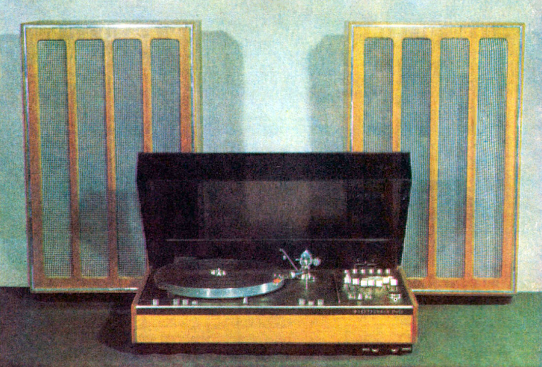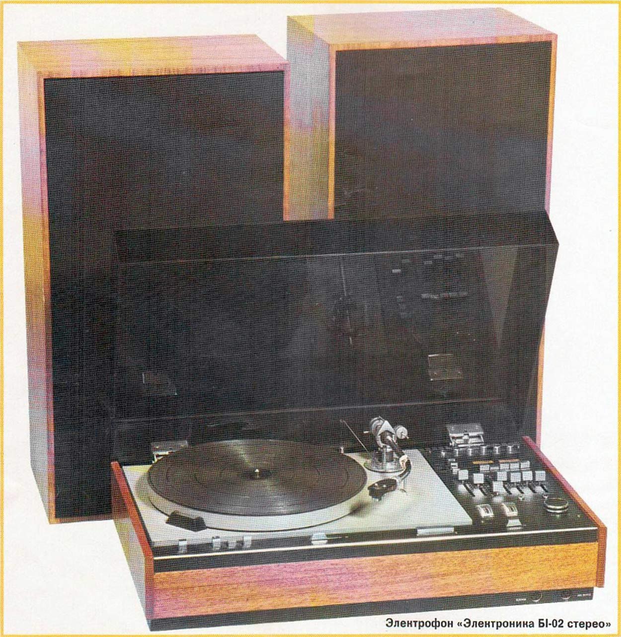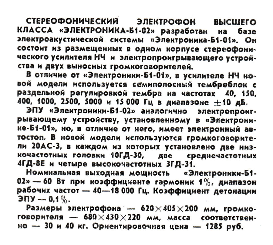 Электрофон *Электроника Б1-02* в 1976 году опытно выпустил Казанский завод радиокомпонентов. ЭФ разработан на базе электроакустической системы **Электроника-Б1-01** и состоит из размещенных в одном корпусе стереофонического усилителя, электропроигрывающего устройства и двух выносных АС. В отличие от ЭАС **Электроники-Б1-01**, в усилителе НЧ используется семиполосный темброблок с раздельной регулировкой тембра на частотах: 40, 150, 400, 1000, 2500, 5000 и 15000 Гц в диапазоне +10/-10 дБ. ЭПУ как и в базовом электрофоне, но имеет электронный автостоп. В электрофоне используются две выносные акустические системы 20АС-3, в каждой из которых установлены громкоговорители: 2 НЧ 10ГД-30, 2 СЧ 4ГД-8Е и 4 ВЧ 3ГД-31. Номинальная выходная мощность электрофона 2х60 Вт при КНИ - 1%. Диапазон воспроизводимых частот 40...18000 Гц. Коэффициент детонации ЭПУ 0,1%. Габариты ЭФ 620х405х200 мм, одной АС - 680х430х220 мм, масса соответственно 20 и 40 кг.