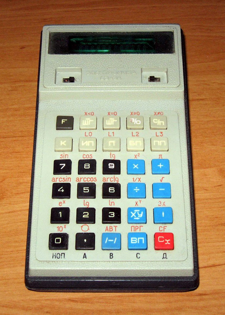 Микрокалькулятор *Электроника Б3-34* выпускался с 1980 года Светловодским заводом *Калькулятор* (Кировоградская область. Украина). *Электроника Б3-34* - программируемый микрокалькулятор с обратной записью для проведения инженерных и научных расчётов. Программируемый микрокалькулятор «Электроника Б3-34» относится ко второму поколению советских программируемых калькуляторов, предназначен для выполнения многократно повторяющихся сложных математических расчетов при решении широкого спектра задач. Выпускался в Украинской ССР на заводе «Калькулятор» в городе Светловодск Кировоградской области. В продаже появился в 1980 году по цене 85 рублей. Калькулятор быстро приобрёл необычайную популярность, благодаря ему программированием на микрокалькуляторах заинтересовались многие научно-популярные журналы того времени. Выпускались книги, посвященные как «серьезному» программированию на Б3-34, так и «развлекательному» — занимательные фокусы, применение калькулятора в быту и в школе, простейшие логические игры (предлагающие игрокам угадать число, «задуманное» калькулятором и т. д.). Демонстрационные стенды, выполненные в виде большого Б3-34, использовались на уроках программирования в школе. Микрокалькулятор позволяет выполнять вычисления тригонометрических функций, умеет работать в радианах или градусах (для этого предусмотрен отдельный переключатель). Память калькулятора составляет 14 регистров. Количество выполняемых автоматических операций — 51. Для составления и автоматизации процесса отладки программ в калькуляторе предусмотрены команды организации циклов, обращения к подпрограммам, пошаговый режим выполнения и просмотра программ с отображением кодов последних трех шагов на индикаторе. Для экономии места разработчики сильно упростили микрокод при обработке ошибок и различных нестандартных ситуаций, что породило множество недокументированных возможностей: например, если в моделях поздних выпусков переключатель «градусы-радианы» поставить в среднее положение, то калькулятор будет считать тригонометрические функции в градах.Множество прочих неожиданных и трудно предсказуемых недокументированных возможностей были объектами регулярных любительских исследований и публикаций в известных журналах; некоторые из них даже использовались в играх и прочих программах, например, в журнале «Наука и Жизнь» (№ 6, 1988 г.) описан эксперимент Н. Смирнова из Челябинска, который подключил к калькулятору Б3-34 внешний тактовый генератор с частотой 200 кГц вместо внутреннего с частотой 120 кГц, в результате чего быстродействие калькулятора увеличилось в 1,8 раза, при этом удвоилась и потребляемая мощность. Для отображения результатов работы программы используется 12-разрядный вакуумный катодолюминесцентный индикатор. Числа могут быть представлены как с естественной, так и с плавающей запятой. Автономное питание калькулятора осуществляется от четырех аккумуляторов типа Д-0,55с или от блока питания типа БП2-3. Время непрерывной работы без замены источников питания составляет от двух до четырех часов.Габаритные размеры модели: 185✕100✕46 мм.Вес калькулятора: 0,39 кг.