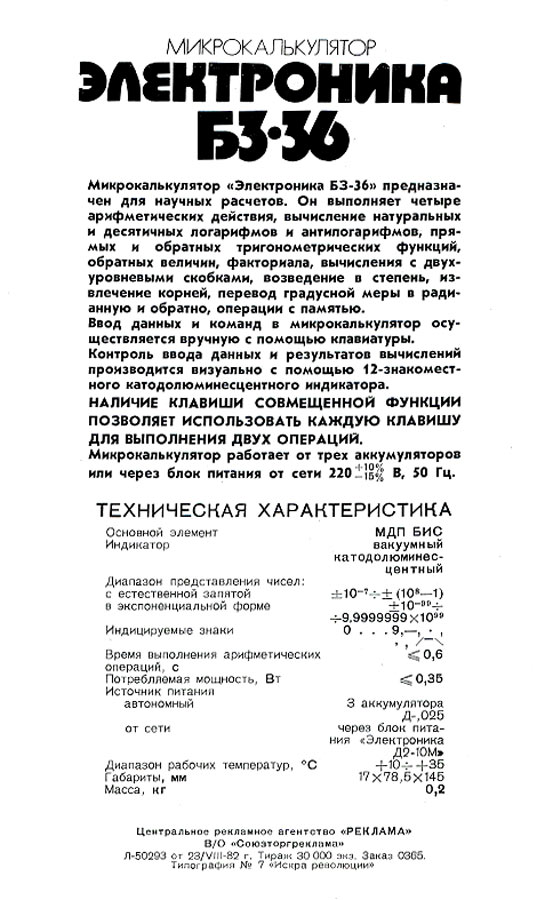 Микрокалькулятор «Электроника Б3-36» — улучшенная версия «Электроники Б3-35» — отличается от своего предшественника габаритными размерами, весом, временем работы без замены источников питания, типом индикатора зеленого свечения, а также материалом корпуса, который был заменен с пластикового на металлический. Микрокалькулятор выпускался с 1979 года на заводах «Ангстрем» в Зеленограде и «Биллур» в Азербайджане. Калькулятор имеет 1 регистр памяти. Процессор - К145ИП15 калькулятора выполняет арифметические операции, вычисление натуральных и десятичных логарифмов и антилогарифмов, прямых и обратных тригонометрических функций, обратных величин, факториала, вычисления с двухуровневыми скобками, возведение в степень, извлечение корней и операции с памятью. Прототипом этого калькулятора является Rockwell THE 74K, дизайн почти одинаковый, а функции - один к одному. До 1980 года продавался по цене 210 рублей, затем по цене 120 рублей, а в декабре 1981 года цена была снижена до 70 рублей. Впоследствии калькулятор выпускался под маркой «Электроника МК-36». Калькулятор предназначен для инженерных и экономических расчетовДля отображения результатов вычисления используется восьмиразрядный вакуумно-люминесцентный индикатор. Питание калькулятора осуществляется от четырех аккумуляторов типа Д-0,25 или от блока питания типа Д2-10М. Время работы без замены источников питания составляет семь часов. Габаритные размеры модели: 148✕78,6✕17,5 мм.Вес калькулятора: 0,2 кг.