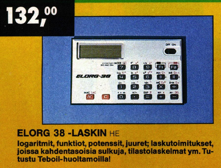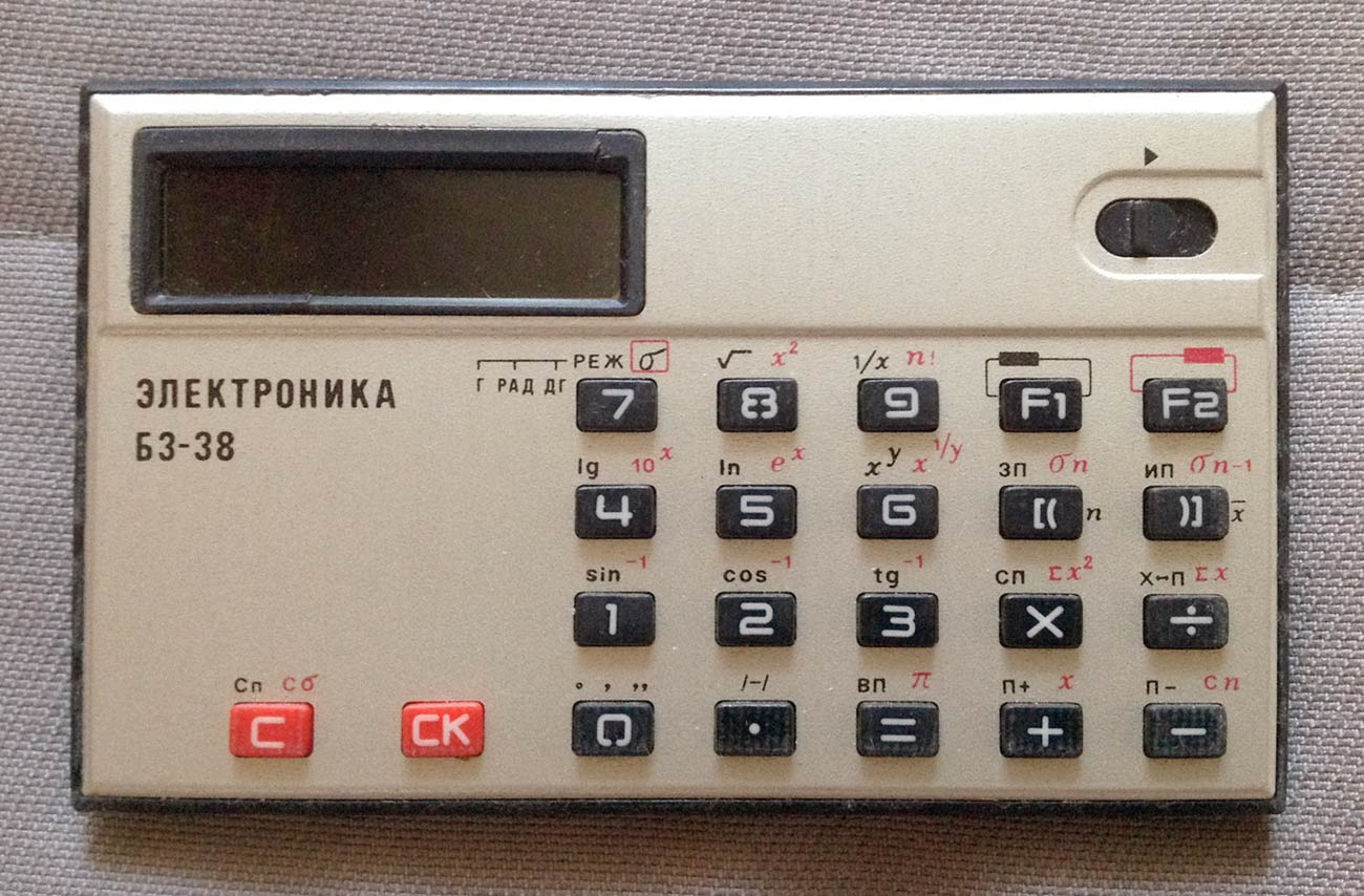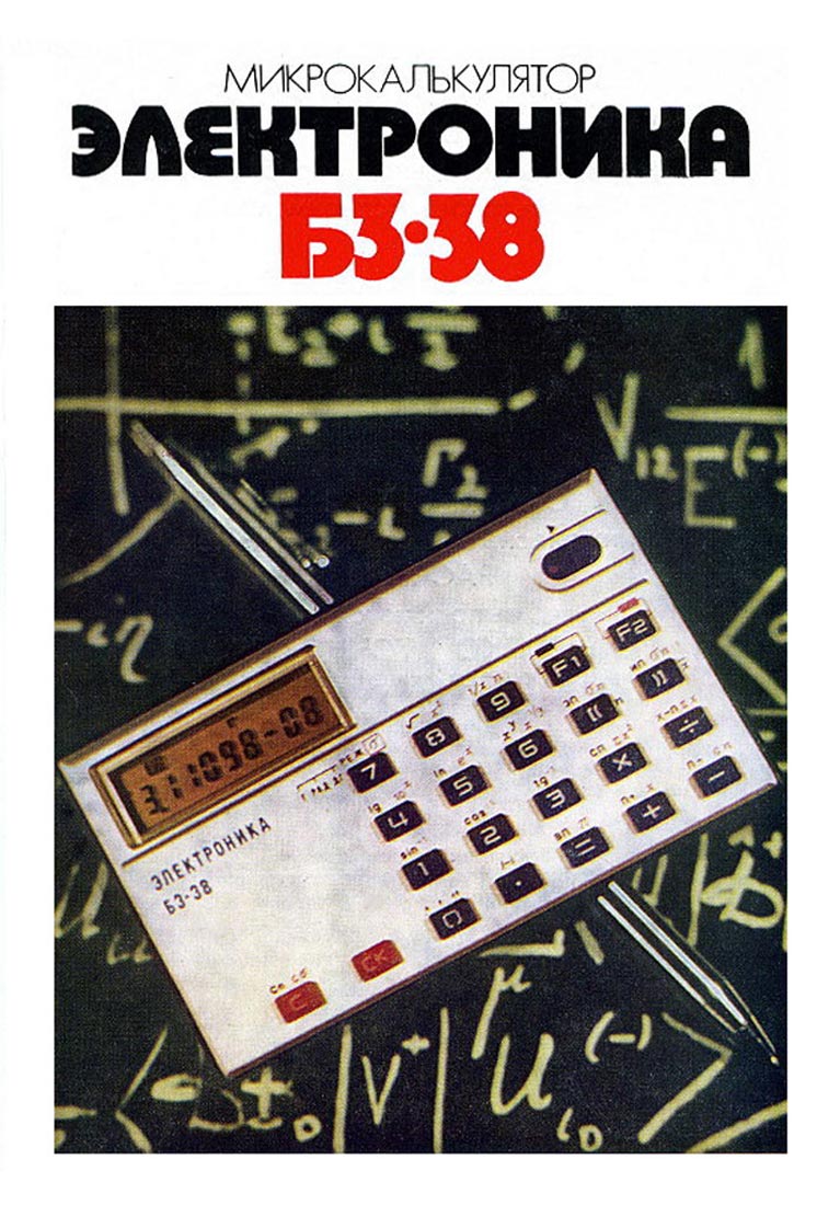 Микрокалькулятор *Электроника Б3-38* 8-разрядный инженерный микрокалькулятор. Питание: 2 элемента типа СЦ-32, выпускался с 1982 года несколькими предприятиями страны. Предназначен для выполнения инженерных и научно-технических расчетов. Калькулятор "Электроника Б3-38", является сверхминиатюрным (91х55х5,5 мм) и одним из самых точных отечественных микрокалькуляторов для выполнения сложных математических расчетов, в том числе широкого спектра элементарных специализированных функций для статистических расчетов. Рекомендован для использования учащимися старших классов и учителями средней школы.Позволяет выполнять: четыре арифметических действия;цепные повторяющиеся операции;изменение знака числа;действия с константой;вычисления с применением скобок;вычисления степенных, показательных, логарифмических, тригонометрических функций (прямых и обратных);представление аргумента в радианах, градусах, градах;преобразование градусов, минут и секунд в доли градуса;вычисления статистических функций;вычисление n!;вызов числа ?;работу с регистром памяти: запись, сложение, вычитание. Характерной особенностью калькулятора является наличие двух клавиш совмещенной функции (F1 и F2), что позволяет использовать клавиши для выполнения трех операций.Формат представления чисел – с естественной и плавающей запятой. Диапазон представления чисел с плавающей запятой +- 1*10-99 до 9,99*10+99.Разрядность чисел 6+2. Тип индикатора – жидкокристаллический. Разрядность числа - 8. Тип индикатора - жидкокристаллический. Питание - 2 элемента СЦ-30. Габариты МК - 55 x 91 x 5,5 мм. Масса 50 гр. Экспортный вариант МК именовался как *Elorg-38*.