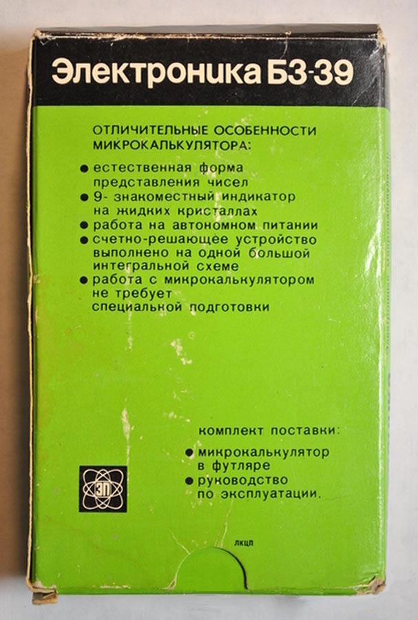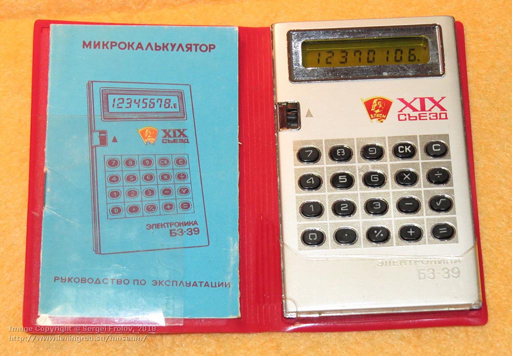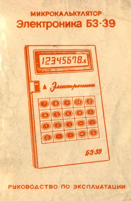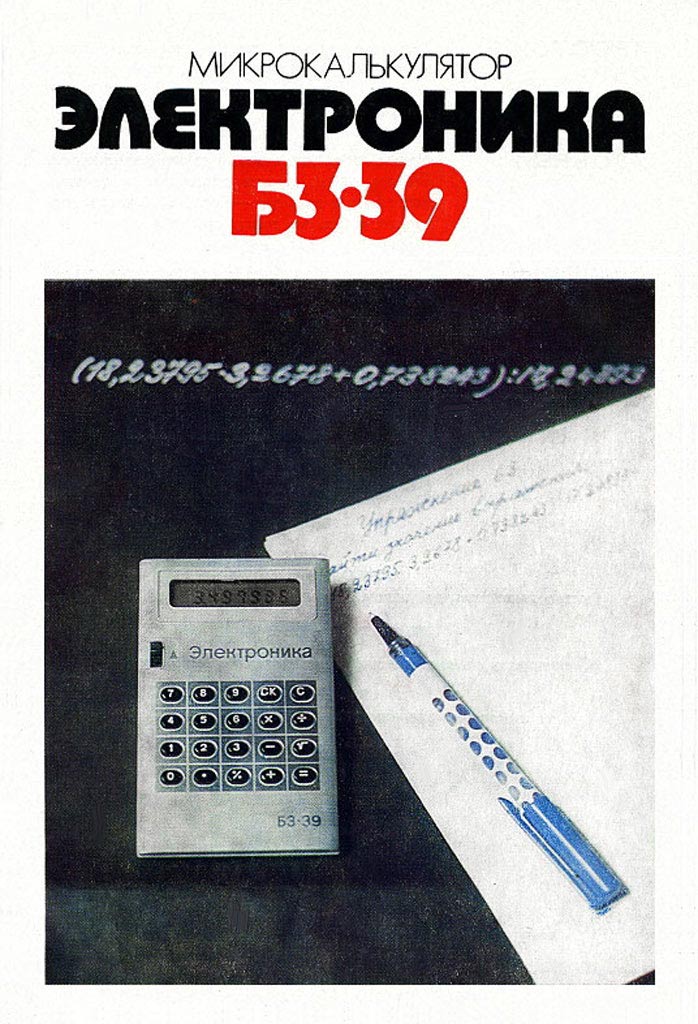 Микрокалькулятор *Электроника Б3-39* выпускался с 1979 году на Зеленоградском заводе *Ангстрем*. Микрокалькулятор "Электроника БЗ-39" является усовершенствованной моделью микрокалькулятора "Электроника БЗ-30", служит для проведения простых расчетов, а также рекомендован для использования учащимися начальных классов средних школ и профессионально-технических училищ. В калькуляторе использовали новую низкопороговую схему, за счет которой потребляемая мощность резко уменьшилась и составила всего один милливатт. Калькулятор служит для проведения простых расчетов, имеет отдельную клавишу для извлечения квадратного корня. Рекомендован для использования учащимися начальных классов средних школ и профессионально-технических училищ. В калькуляторе используется восьмиразрядный жидкокристаллический индикатор. Питание микрокалькулятора осуществляется от трех элементов типа СЦ-32. Форма представления чисел — естественная. Диапазон представляемых чисел ±107 +(108—1). Тип индикатора — жидкокристаллический. Время непрерывной работы от одного комплекта источника питания составляет 800 ч. Габаритные размеры модели 110х66,5х10,5 мм. Масса МК - 65 грамм. Цена 40/45 руб.
