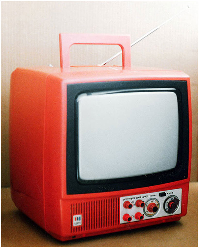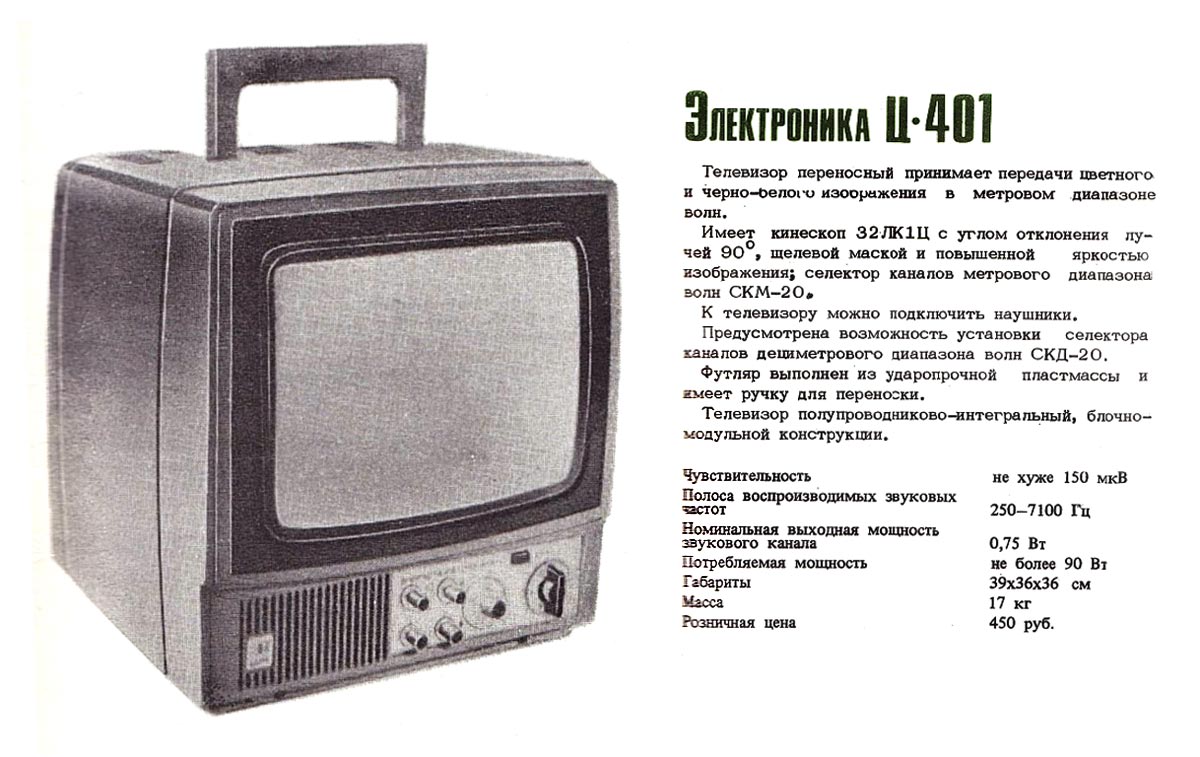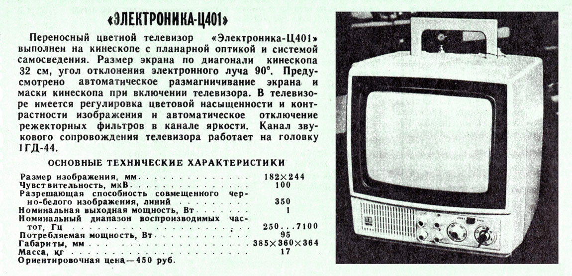 Телевизионный приёмник цветного изображения *Электроника Ц-401* с осени 1978 года выпускал Московский электроламповый завод. Полупроводниковый цветной телевизор **Электроника Ц-401** собран на базе телевизора **Юность Ц-401**. Модель выполнена на кинескопе с планарной оптикой и самосведением. Диагональ экрана 32 см. Имеется авторазмагничивание кинескопа. В АС работает громкоговоритель 1ГД-44. Краткие технические характеристики: размер видимой части экрана 182х244 мм; чувствительность с антенны 100 мкВ; чёткость в центре экрана 400 линий; номинальная выходная мощность УНЧ -1 Вт; диапазон воспроизводимых частот 250...7100 Гц; потребляемая от сети мощность 95 Вт. Габариты модели 385х360х364 мм. Вес 17 кг.
