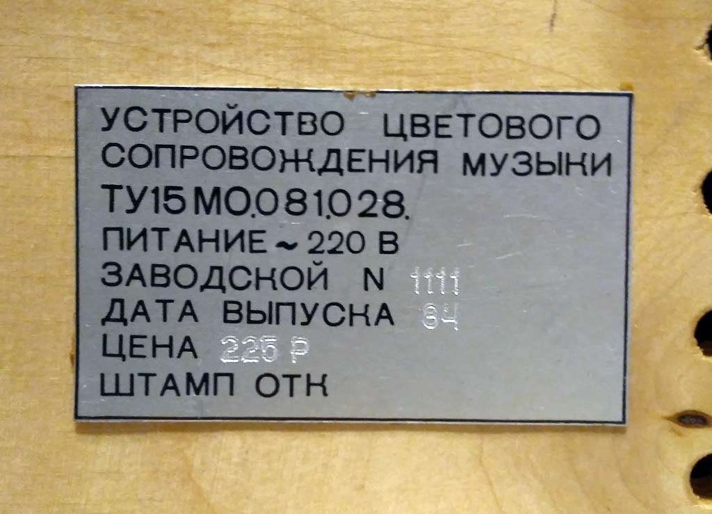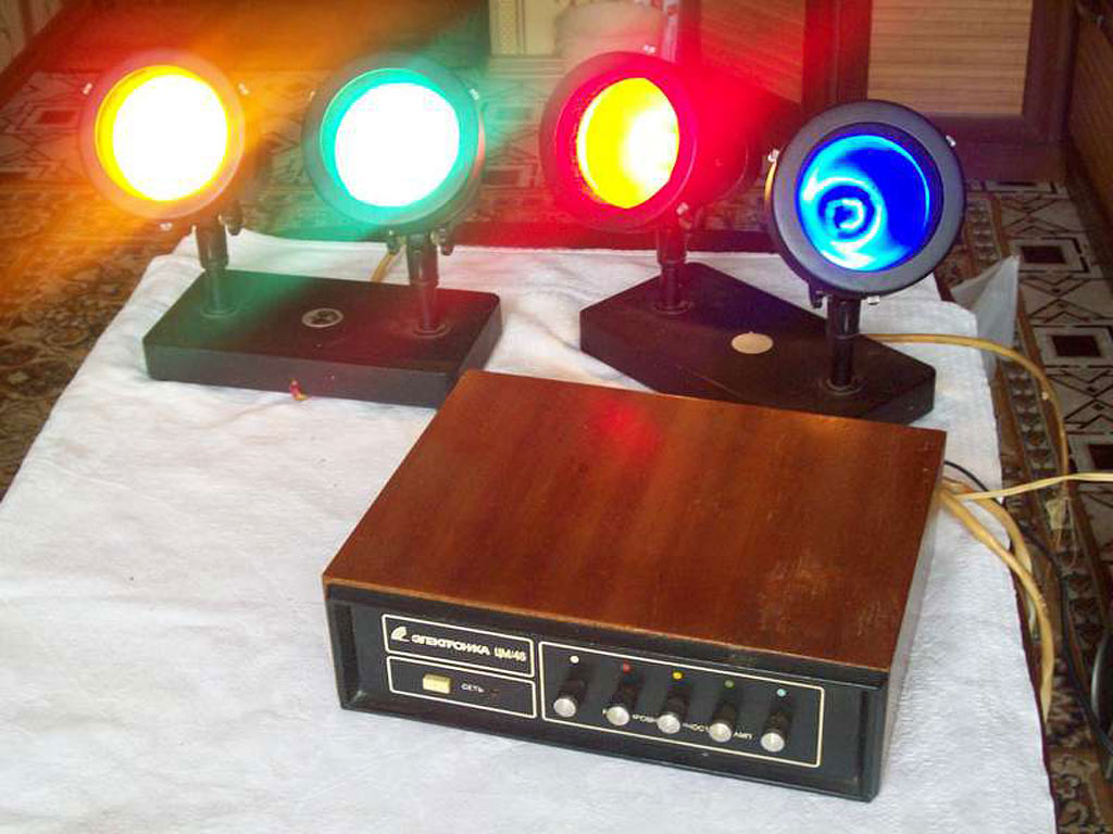 Устройство цветового сопровождения музыки *Электроника ЦМ-46* выпускало с 1984 года Саратовское ПО *Радуга*. Количество каналов 4. Мощность лампы на канал не более 100 Вт. Габариты блока управления - 253х314х100 мм. Габариты одного светильника - 300х232х235 мм. Масса установки 10 кг.