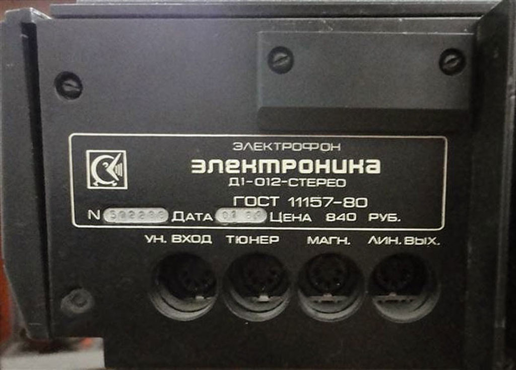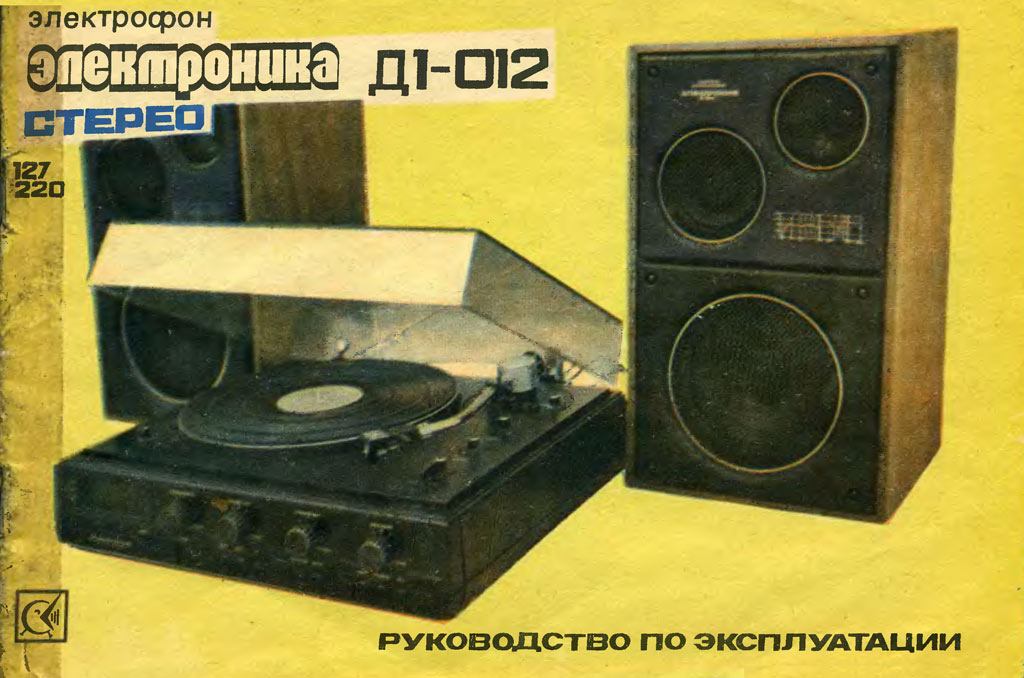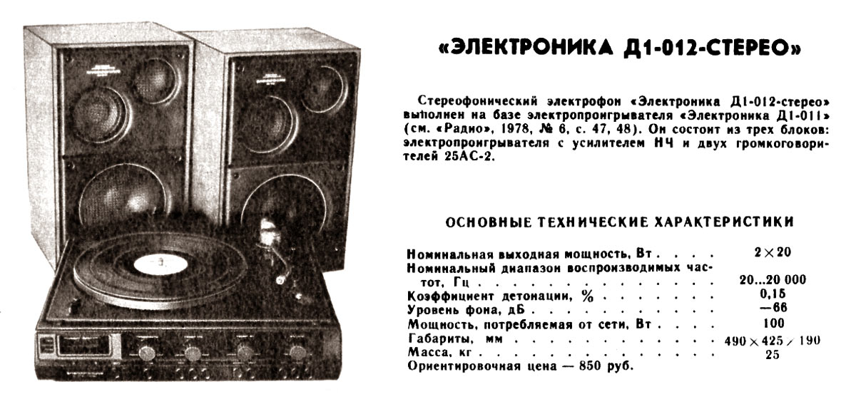Электрофон сетевой транзисторный *Электроника Д1-012-стерео* с 1980 года выпускал Казанский завод радиокомпонентов. Электрофон высшего класса **Электроника-Д1-012-стерео** предназначен для воспроизведения моно или стерео пластинок, воспроизведения сигналов с магнитофона и тюнера. Электрофон собран на базе проигрывателя **Электроника Д1-011**. Он состоит из трёх блоков: электропроигрывателя с усилителем и 2-х АС 25AC-2. Электрофон имеет автоматическое и ручное управление, подстройку скорости; ручной микролифт, регулировку прижима звукоснимателя; регулируемый компенсатор скатывающей силы. Усилитель НЧ имеет плавную регулировку громкости и тембров; фиксированное уменьшение уровня громкости на 20 дБ; тонкомпенсацию; включение ФНЧ. Акустическое воспроизведение обеспечивается трёхполосными АС или стереотелефонами. Номинальная выходная мощность 2х20 Вт. Диапазон рабочих частот 20...20000 Гц. Коэффициент детонации 0,15%. Уровень фона -66 дБ. Потребляемая мощность 100 Вт. Размеры электрофона 490х425х190 мм. Вес 25 кг.