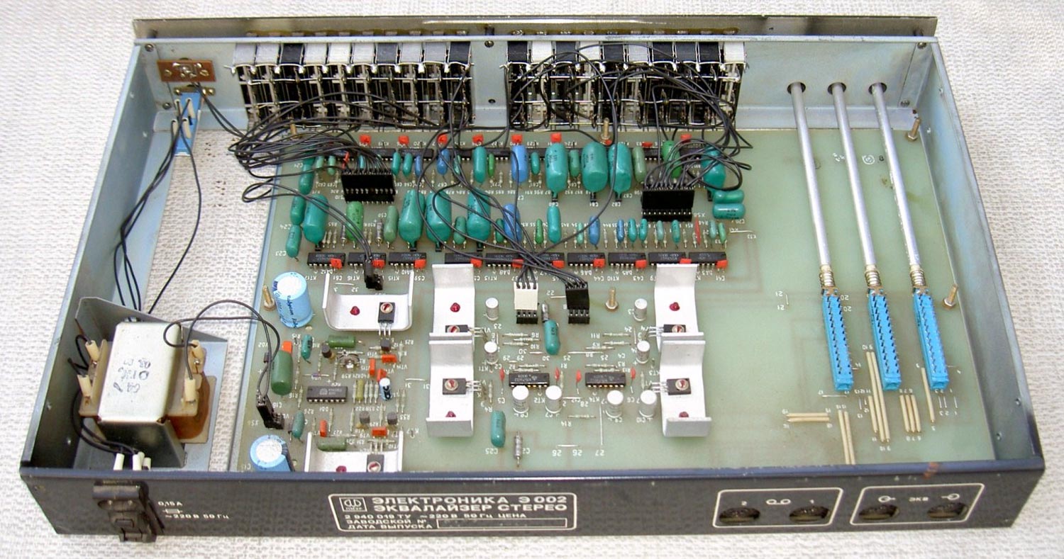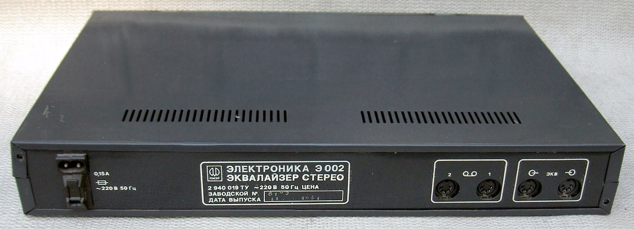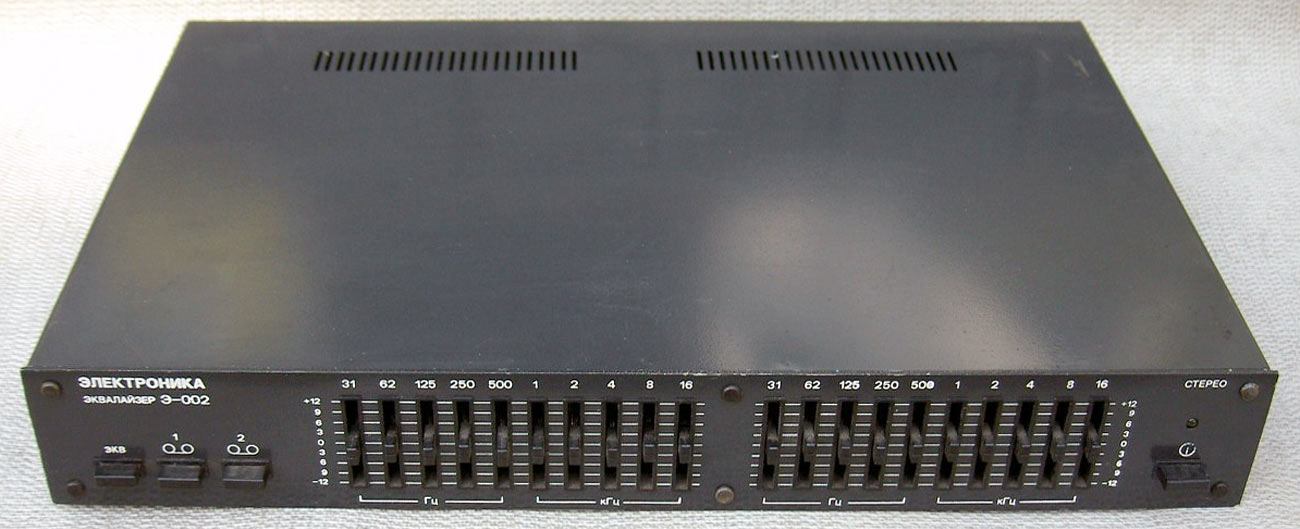 Стереофонический эквалайзер *Электроника Э-002-стерео* выцпускался с 1990 года Первым Московским заводом радиодеталей. Эквалайзер предназначен для оперативной коррекции АЧХ звуковоспроизводящих трактов бытовой звуковоспроизводящей аппаратуры. Диапазон рабочих частот 20...25000 Гц. Число полос регулирования 2х10. Потребляемая мощность 10 Вт. Габариты эквалайзера 430х295х67 мм. Его масса 5 кг.