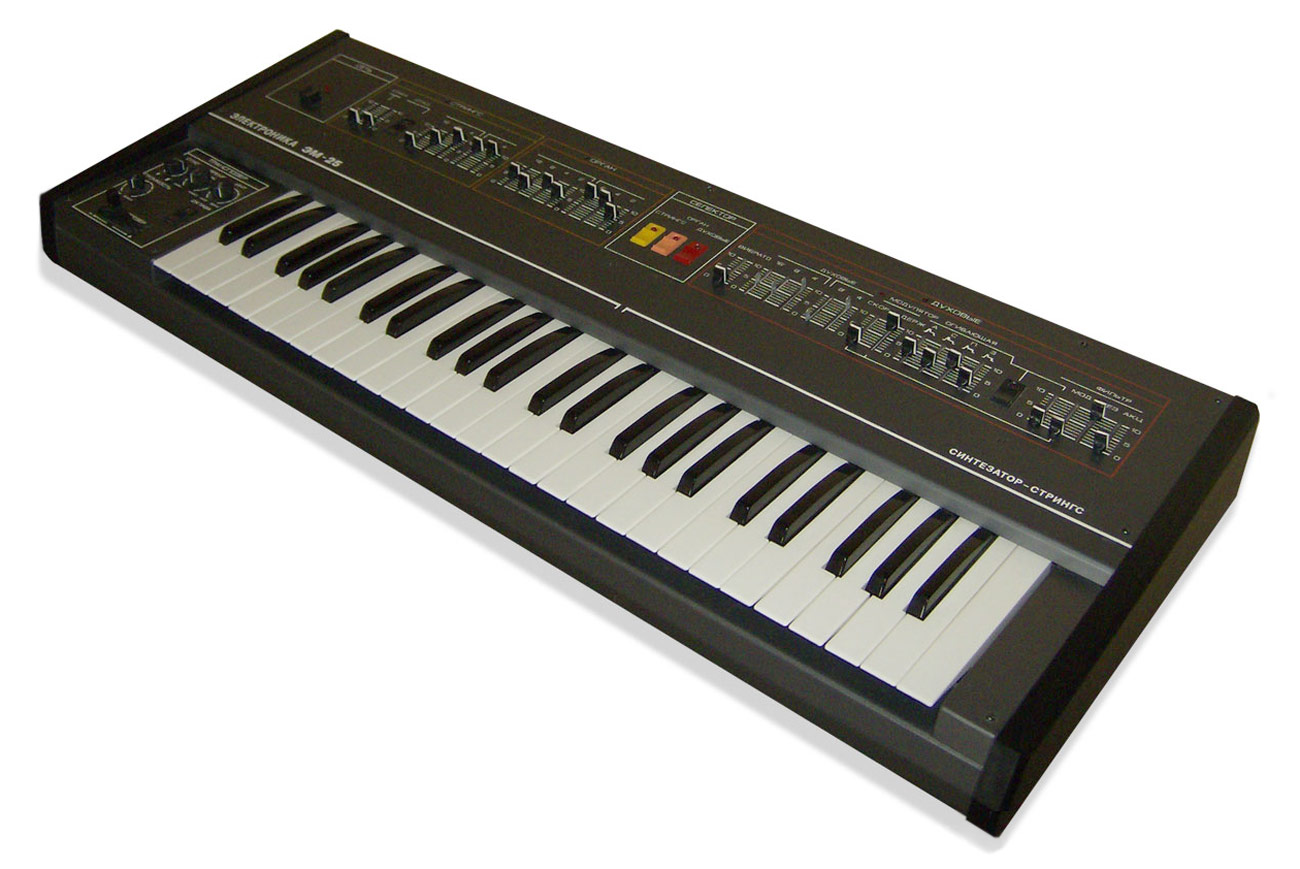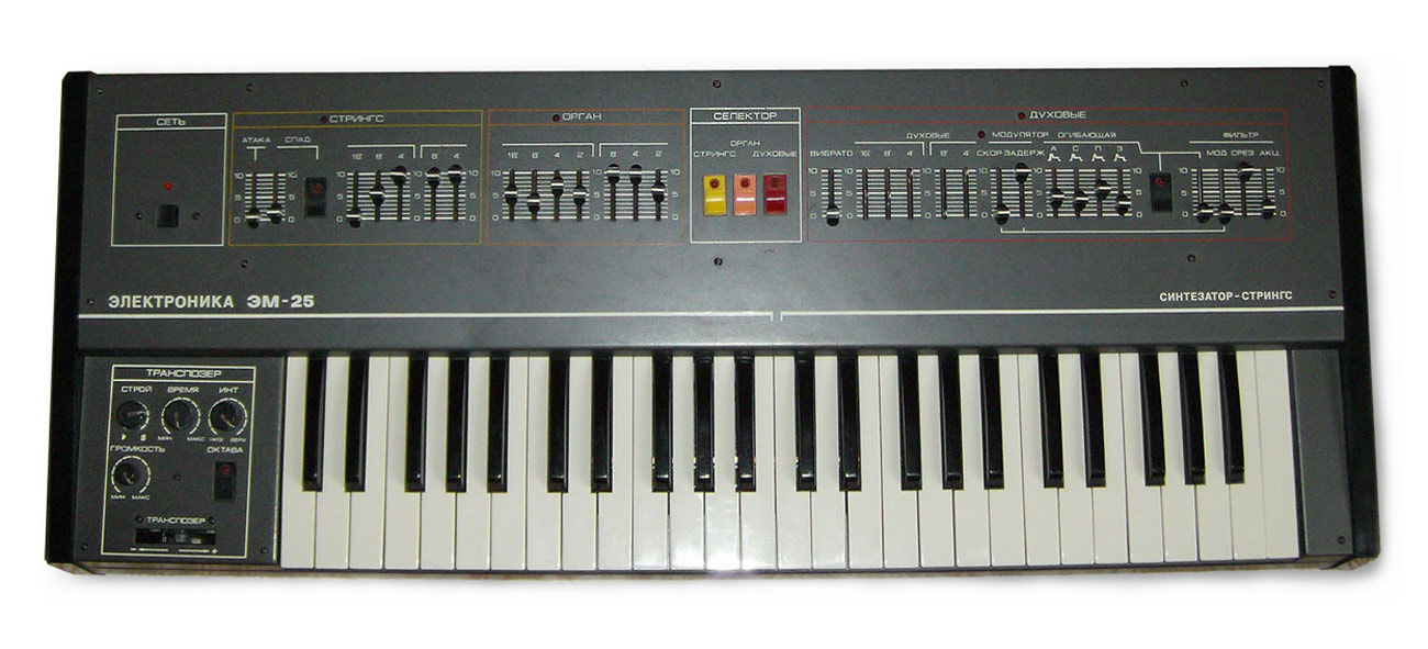 Электронный музыкальный инструмент *Электроника ЭМ-25* выпускался с 1985 года. **Электроника ЭМ-25** имеет 3 секции тембров: стрингс - контрабасы, виолончели, скрипки; орган - регистры 16*, 8*, 4*, 2*; духовые - тромбоны, трубы. 1 и 2 секции стрингс и орган обеспечивают полифоническую атаку и спад звука, с регулировкой длительности; переключение режима спада с наслоением, без наслоения послезвучаний. Третья секция духовые имеет генератор огибающей с регуляторами атака, спад, поддержка, затухание; модулятор с регуляторами скорость, задержка, вибрато; управляемый фильтр с регуляторами огибающая, модулятор, срез, акцент; переключение режима запуска фильтра моно и полифонический. Формирование всех тонов осуществляется от одного генератора, исключая расстройку синтезатора в процессе его эксплуатации. Полный звуковой диапазон, октав 9/1-12. Объём клавиатуры, октав 4/1-12. Габаритные размеры ЭМИ - 850x320x85 мм. Масса 10 кг. Цена 850 рублей.