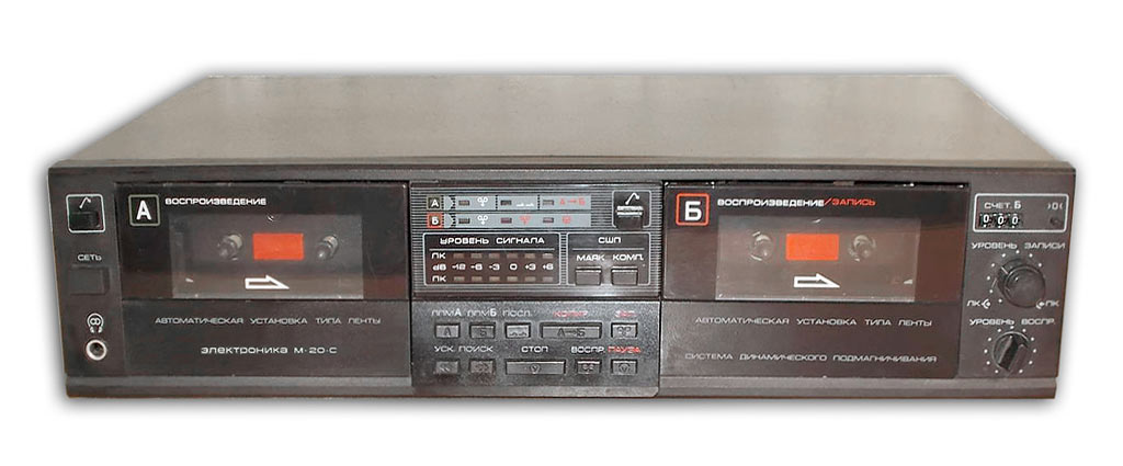 Двухкассетный магнитофон-приставка *Электроника М-20С* из радиоконструктора был подготовлен к выпуску с осени 1988 года. МП задуман для комплектования самодельного радиолюбительского стереокомплекса. Фото МП абстрактное, так как не найдено ничего другого похожего. Краткое упоминание о МП *Электроника М-20* в журнале Юный техник - для умелых рук под № 12 за 1987 год, на странице 16.