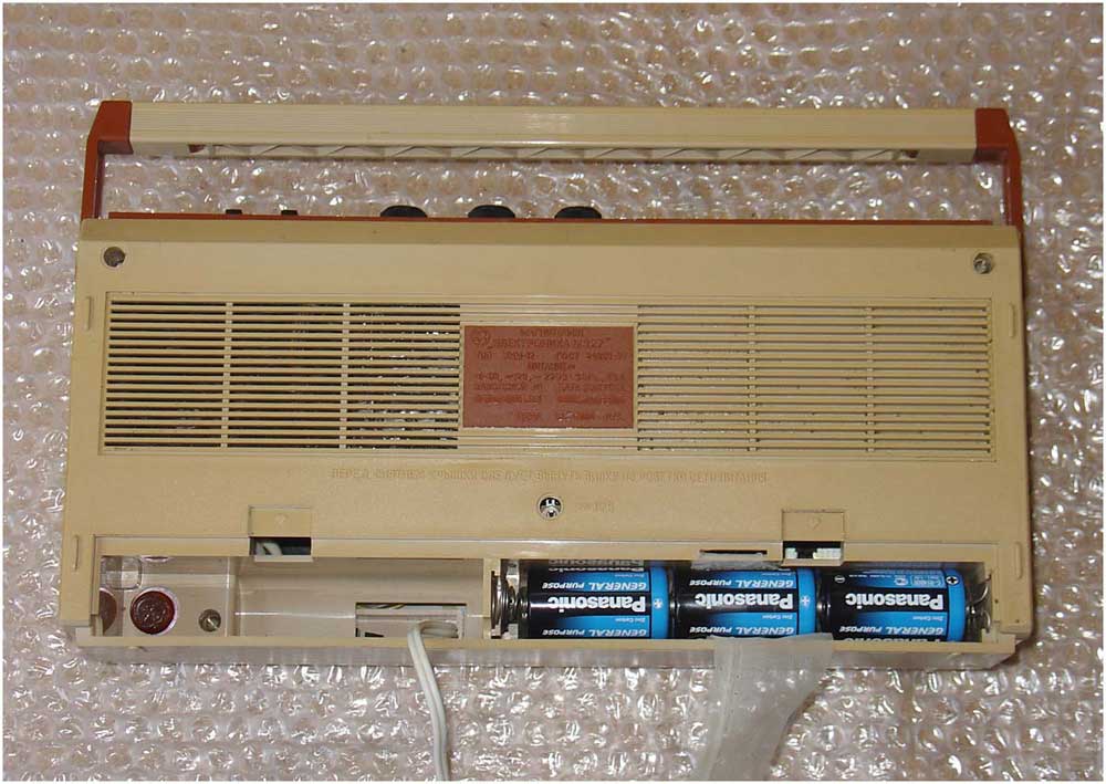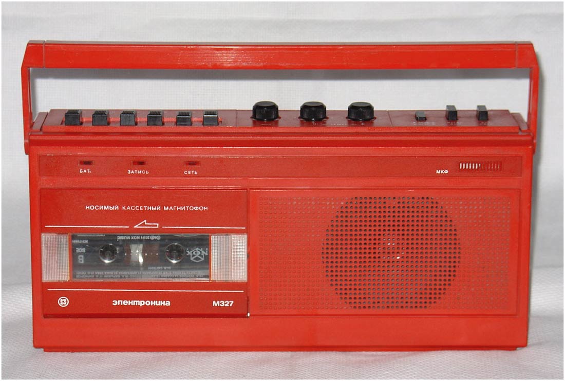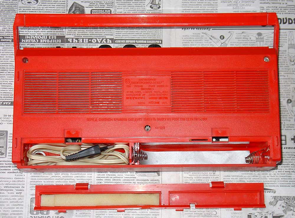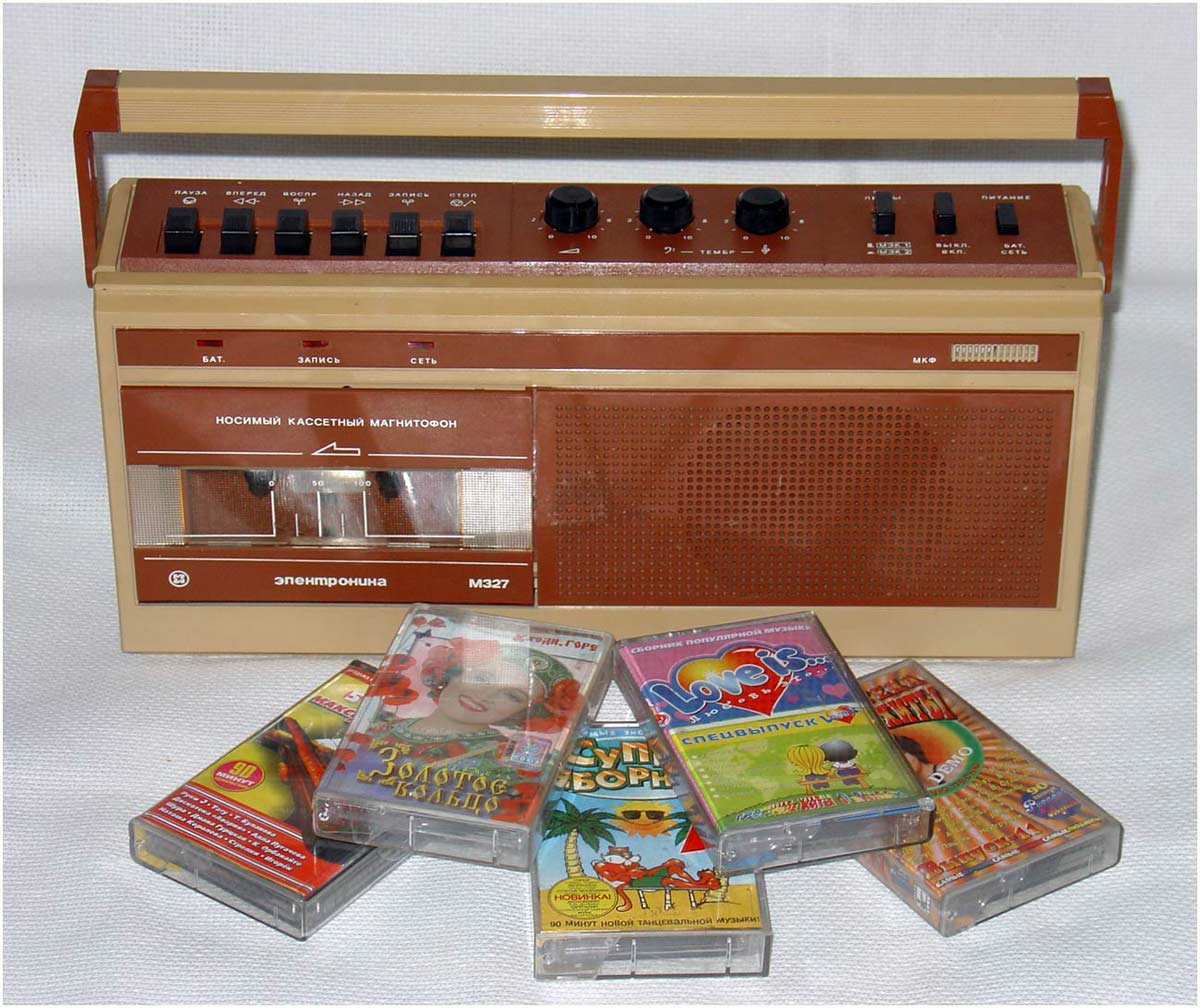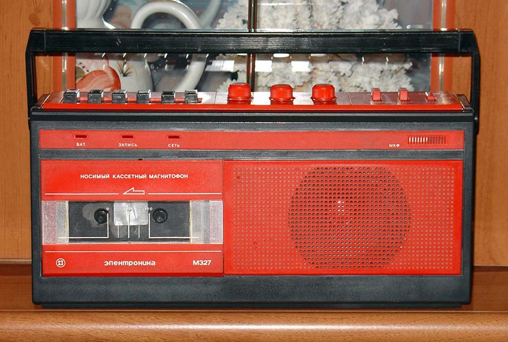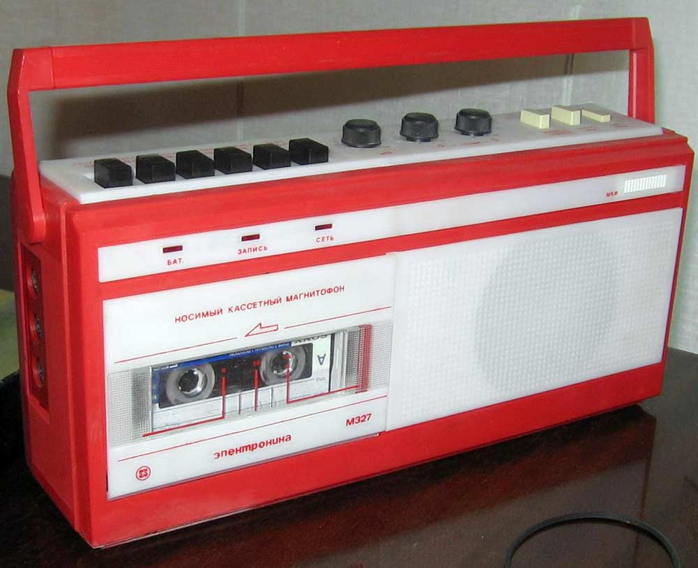Магнитофон *Электроника М-327* с 1987 года выпускал Нововоронежский завод *Алиот*. **Электроника М-327** носимый двухдорожечный магнитофон третьей группы сложности с универсальным питанием. Он позволяет записывать речевые или музыкальные программы на магнитную ленту А4205-3Б и А4206-3Б, в кассетах типа МК-60 и МК-90 с последующим их воспроизведением. В аппарате имеется встроенный электретный микрофон, неотключаемая АРУЗ, автостоп, раздельная регулировка тембра по НЧ и ВЧ. Питание от сети, шести элементов А-343 или бортовой сети автомобиля напряжением 12 В. Скорость движения ленты 4,76 см/с. Коэффициент детонации 0,3 %. Диапазон рабочих частот на ЛВ - 40...10000 Гц. Номинальная выходная мощность 0,6 Вт, а максимальная 1,3 Вт. Относительный уровень шумов и помех -51 дБ. Потребляемая от сети мощность 6 Вт. Габариты магнитофона 330х157х88 мм. Вес 1,9 кг. Цена 168 рублей.