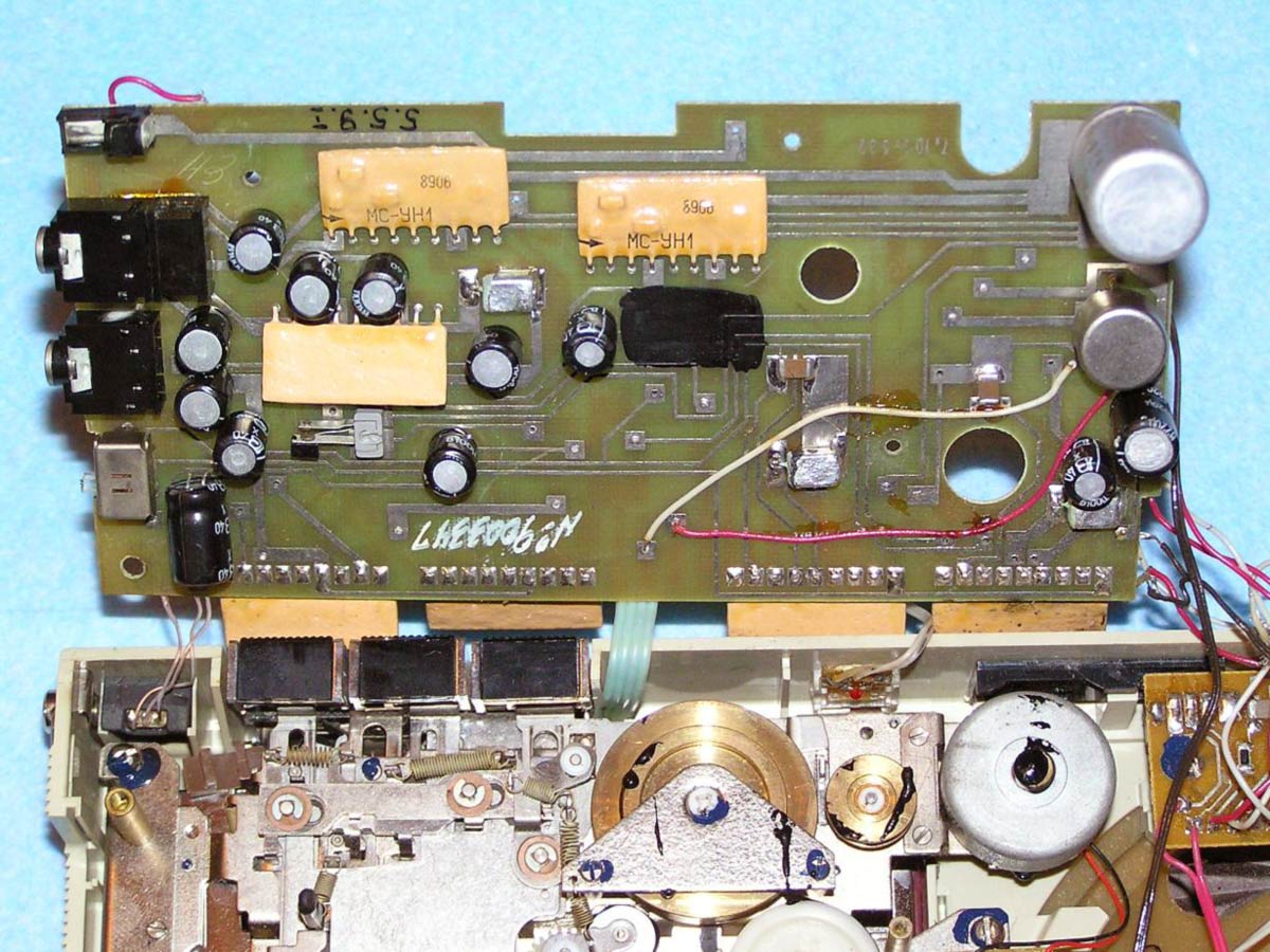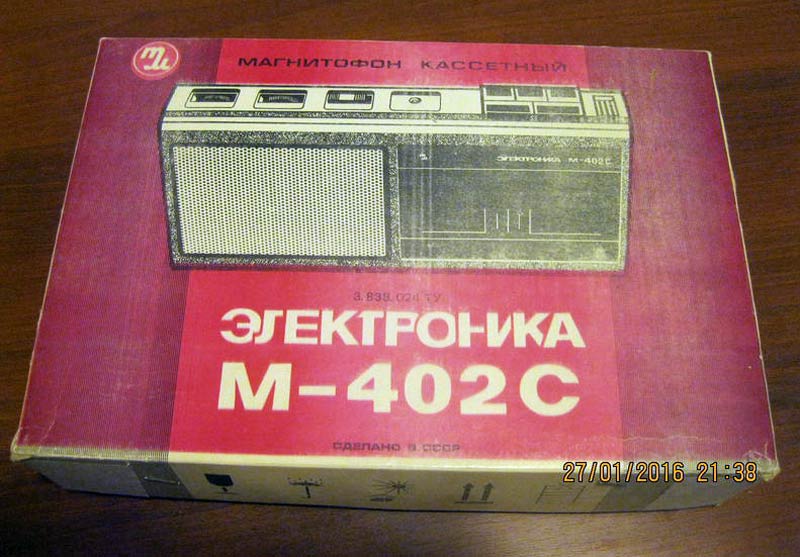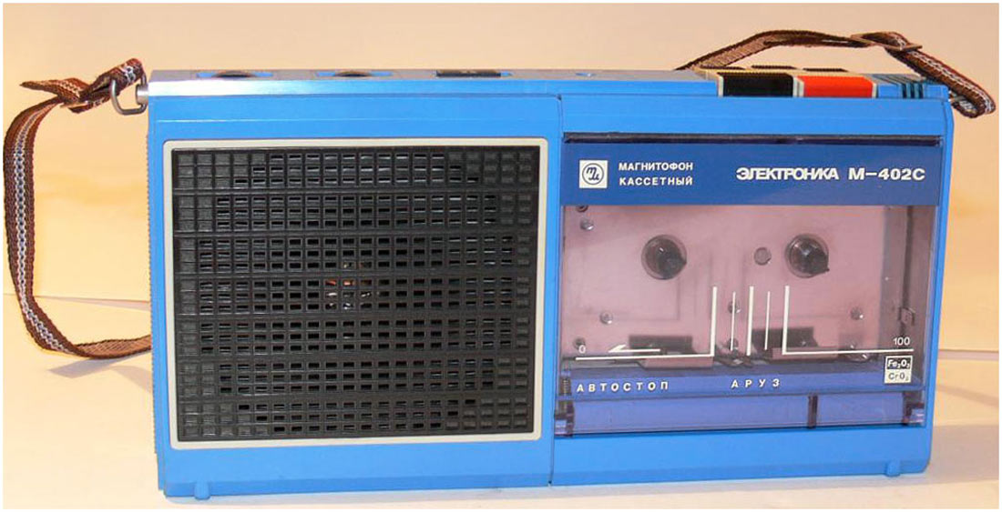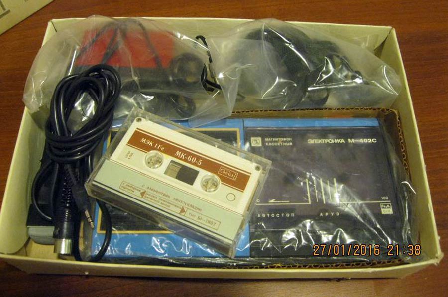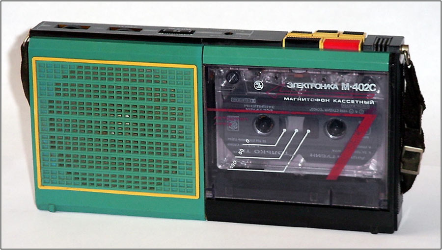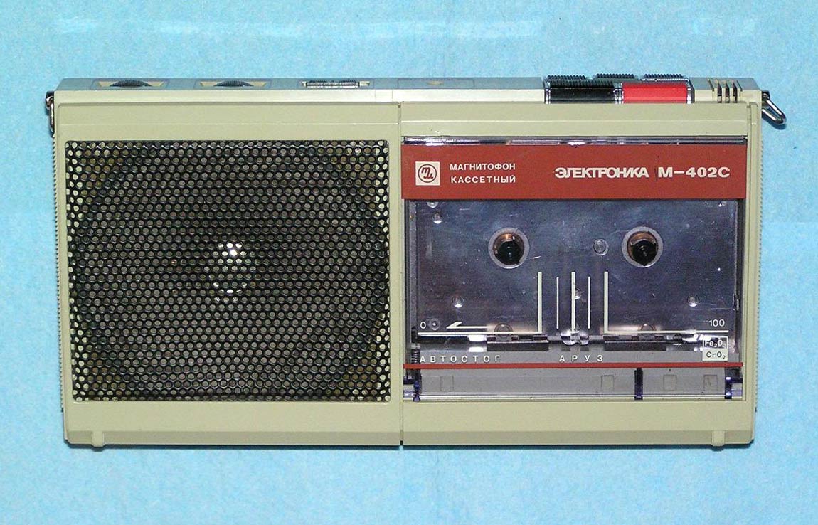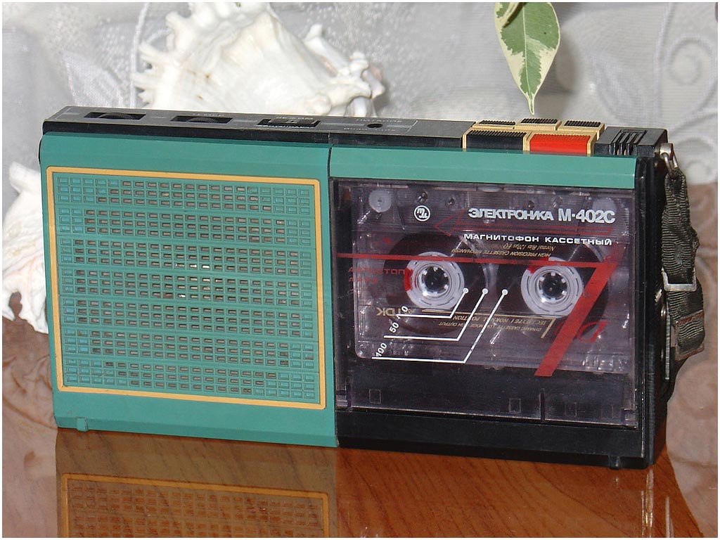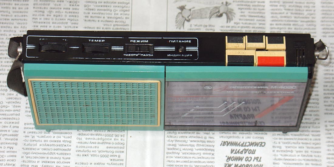 Кассетный стереофонический магнитофон *Электроника М-402С* с 1989 года выпускал Зеленоградский завод ТочМаш. Аппарат предназначен для записи фонограмм на магнитную ленту и их воспроизведения. Запись может производиться со встроенного микрофона или внешних источников. Прослушивание стереофонических фонограмм возможно на стереофонические телефоны или через внешний стереоусилитель с АС. В моно режиме для прослушивания фонограмм можно использовать встроенный громкоговоритель. В аппарате предусмотрены: автостоп при окончании ленты, возможность паузы в режимах записи и воспроизведения, световая индикация питания во всех режимах работы, переключение типа ленты в режиме воспроизведения, автоматическое переключение магнитофона из режима стерео (при работе со стереотелефонами) в режим моно (при работе на встроенный громкоговоритель). Питается магнитофон **Электроника М-402С** от 3-х элементов А-343 или от сети 220 В через БП типа **Электроника Д2-34-2**. Номинальная выходная мощность на стереотелефонах 3 мВт, на громкоговорителе 150 мВт; полный частотный диапазон при работе с лентой: МЭК-1 - 63...12500; взвешенное отношение сигнал/шум 44 дБ; время работы от свежего комплекта элементов не менее 5 часов; габариты магнитофона- 221х40х113 мм; масса без батарей и кассеты 1 кг.
