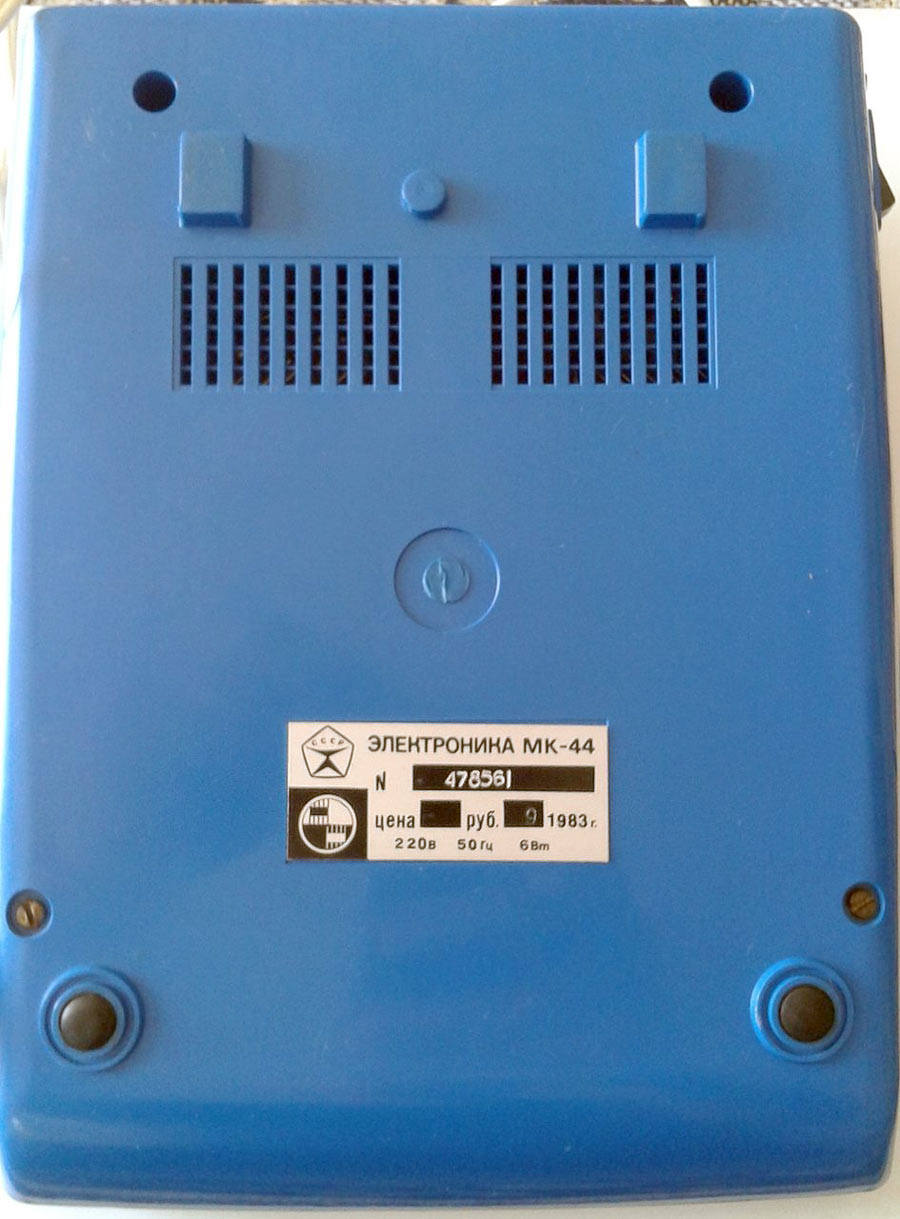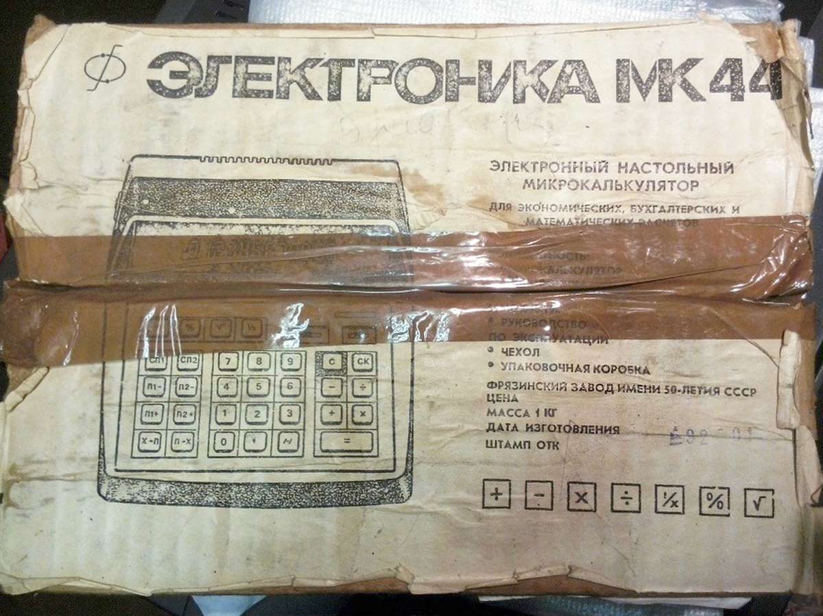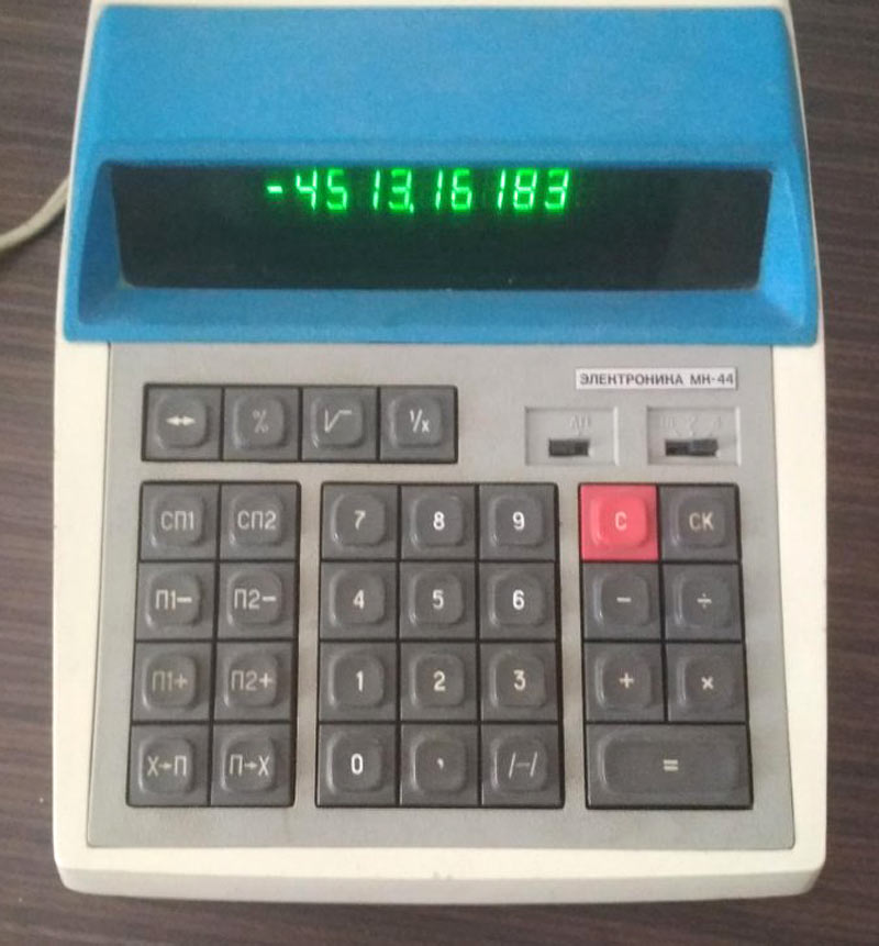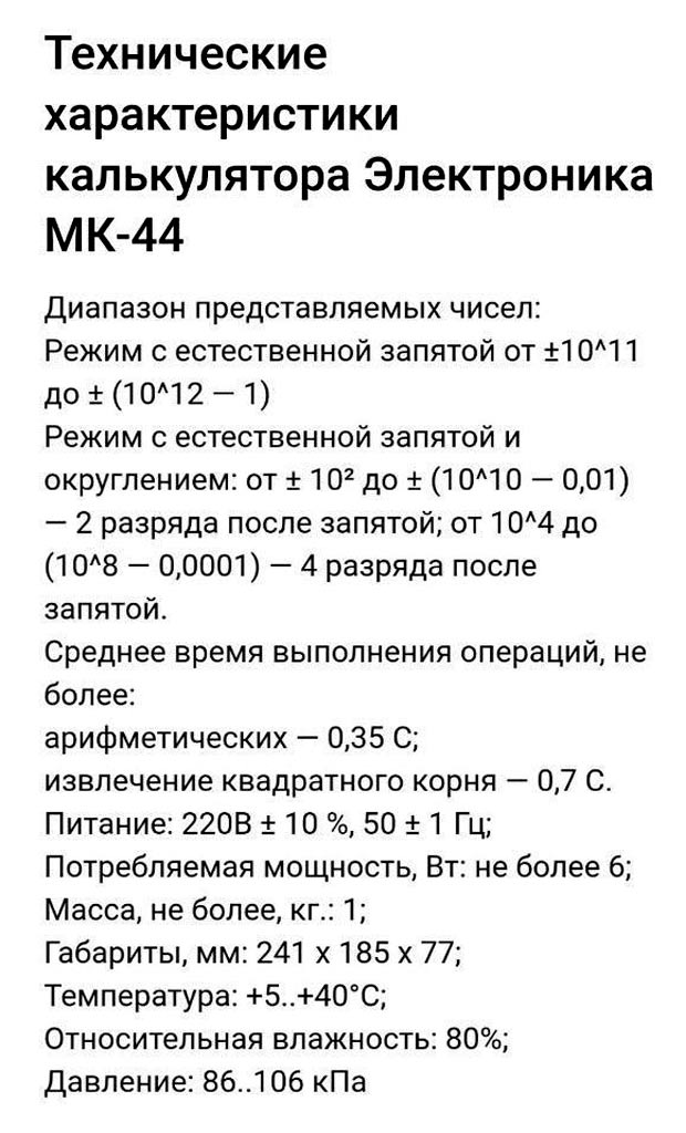 Настольный микрокалькулятор *Электроника МК-44* выпускался с 1982 года Фрязинским заводом имени 50-летия СССР. *Электроника МК-44* - это простой, двенадцатиразрядный микрокалькулятор с питанием от электрической сети. Предназначен для выполнения математических, экономических и бухгалтерских расчетов непрофессиональными счётными работниками. Выполняет четыре арифметические операции, цепочные вычисления, вычисления с константой, вычисление процентов, вычисление квадратного корня, вычисление обратной величины, изменение знака числа и операции с памятью 3 регистра памяти. Диапазон представляемых чисел: Режим с естественной запятой от ±10^11 до ± (10^12 — 1) Режим с фиксированной запятой от ± 10² до ± (10^10 — 0,01) — 2 разряда после запятой;от 10^4 до (10^8 — 0,0001) — 4 разряда после запятой. Габаритные размеры микрокалькулятора 241 х 183 х 77 мм. Масса 1 кг.