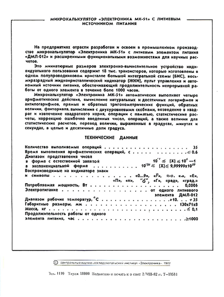Инженерный калькулятор «Электроника МК-51» производился с 1982 года на заводах «Ангстрем» в Зеленограде, «Биллур» в Азербайджане и «Родон» в Украине. Модель производилась аж до 2000 года. Цена составляла 70 руб. «Универсальный», «точный», «практичный» и «удобный», — именно такие эпитеты подобрали производители для своего калькулятора «Электроника МК-51». Известно о двух «юбилейных» выпусках модели: к 50-летию Победы (1995 год) и к 850-летию Москвы (1996 год). Также с 1993 года завод «Родон» выпускал данную модель под собственной маркой «Родон МК-01», а завод «Ангстрем» под маркой «Ангстрем МК-51». В калькуляторе «Электроника МК-51» впервые были применены литиевые элементы питания, а индикаторы в последующих моделях стали применять только жидкокристаллические. Калькулятор способен выполнять автоматически 35 различных математических операций. Модель является аналогом зарубежного калькулятора «Casio fx-2500». Питание калькулятора осуществляется от одного литиевого элемента ДМЛ-0,12 . Потребляемая мощность составляет всего 0,0006 Вт. Габаритные размеры модели 130×71×8 мм.Вес калькулятора: не более 100 г. Центральный научно-исследовательский институт «Электроника» в своём информационно-рекламном бюллетене «Новости бытовой электронной техники»:«Это миниатюрных размеров электронно-вычислительное устройство индивидуального пользования содержит 18 тыс. транзисторов, которые изготовлены в одном полупроводниковом кристалле большой интегральной схемы (БИС), восьмиразрядный жидкокристаллический индикатор (ЖКИ), пульт управления и автономный источник питания, обеспечивающий продолжительность непрерывной работы от одного элемента в течение 1000 часов».