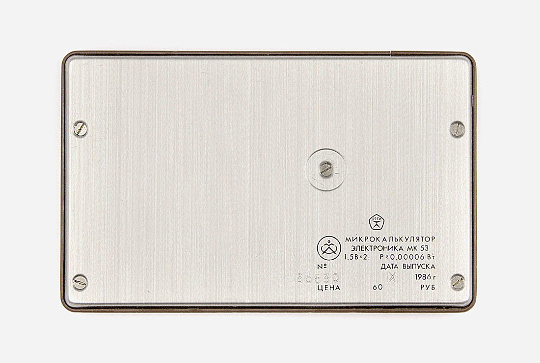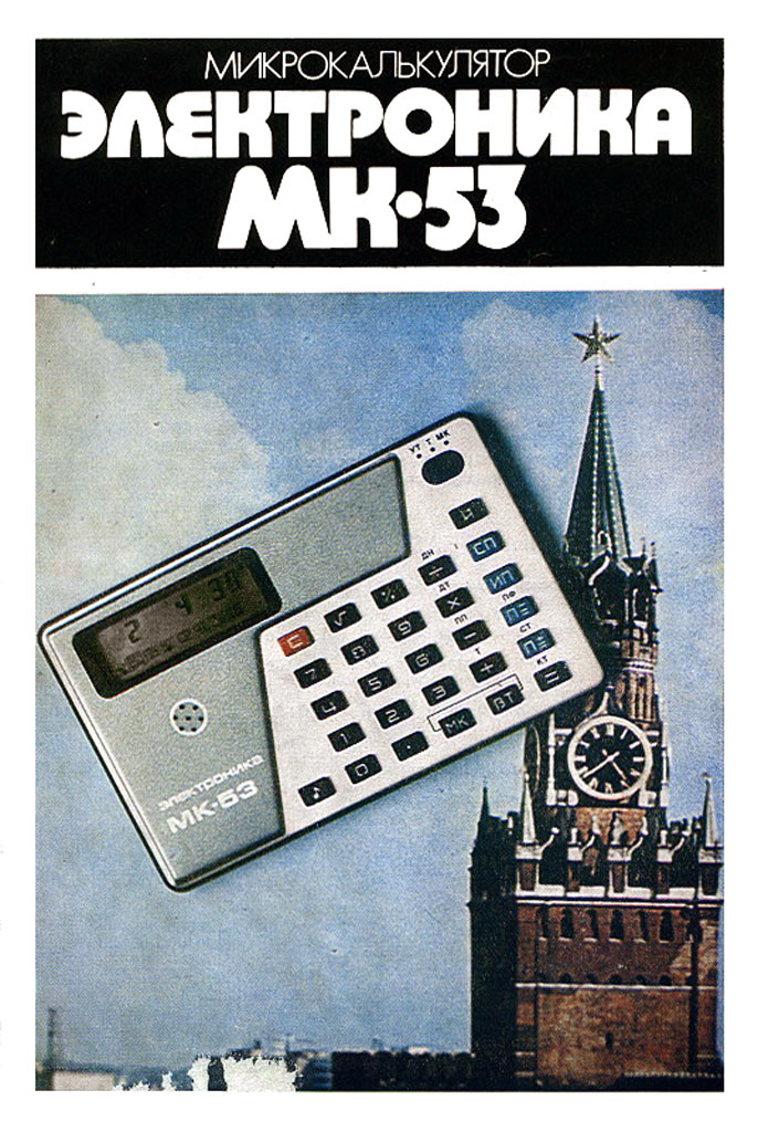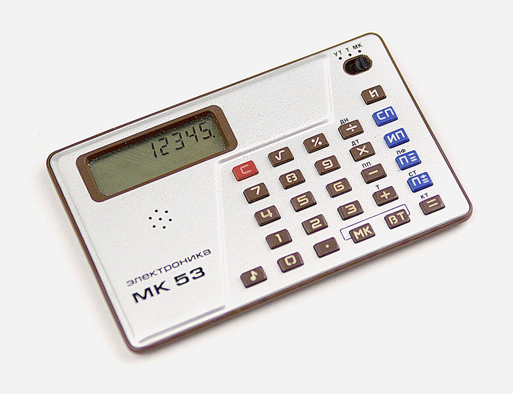 Электронный микрокалькулятор с индикатором на ЖК *Электроника МК-53*. Этот калькулятор - единственный в СССР калькулятор с часами, секундомером и неким подобие календаря. Предположительно с 1981 года выпускал Зеленоградский завод *Ангстрем*. Простой арифметический восьмиразрядный калькулятор c жидкокристаллическим экраном «Электроника МК-53» выпускался с 1986 года на заводе «Ангстрем» в Зеленограде и является первым калькулятором со встроенными секундомером, календарем, часами и будильником. Возможность работы с памятью и способность быстро решать математические задачи в сочетании с миниатюрными размерами делают данную модель незаменимым помощником всех школьников и студентов. Режим работы калькулятора изменяется с помощью трехпозиционного переключателя в правом верхнем углу:УТ — режим настройки часов, будильника и работы с секундомером;Т — режим просмотра времени (клавиатура при этом блокируется);МК — режим калькулятора и часов. По некоторым данным калькулятор является копией модели «Monroe M112». «Электроника МК-53» продавался и на экспорт, для чего информацию на задней стороне писали на английском языке, также переводилась и инструкция. Питание калькулятора осуществляется с помощью двух элементов типа СЦ-32 (современный аналог — LR-54). Время работа от одного комплекта элементов питания: более 8 000 часов.Габаритные размеры модели: 60×95×7 мм.Вес калькулятора: не более 50 г.