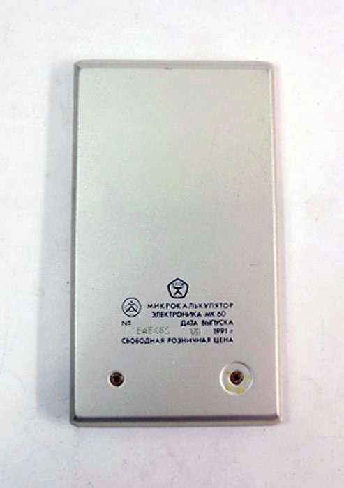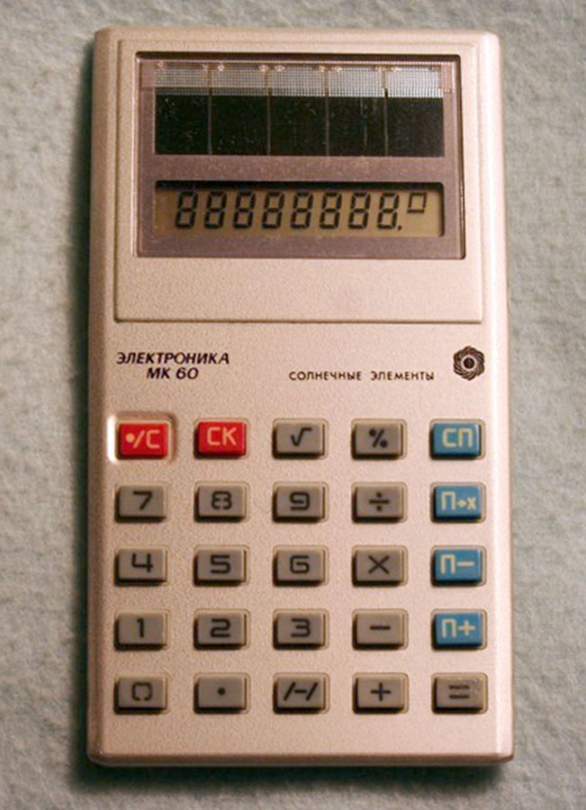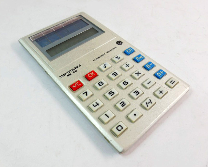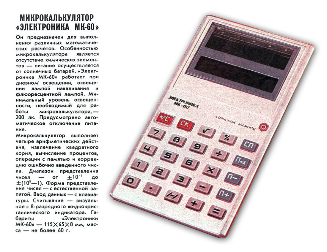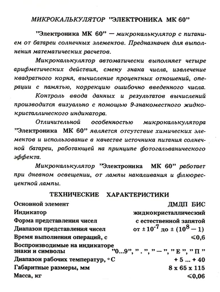 Микрокалькулятор *Электроника МК-60* выпускался с 1982 года одним из Московских оборонных заводов. Это - первый отечественный калькулятор с питанием на солнечных элементах. Калькулятор выполняет четыре арифметические операции: это смена знака числа, извлечение квадратного корня, вычисление процентных отношений, операции с памятью, коррекцию ошибочно введенного числа. Предусмотрено отключение через 10 минут простоя. Цена МК до 1991 года - 45 рублей. Калькулятор является первой моделью, в которой источником питания выступают солнечные элементы. В качестве индикатора используется восьмиразрядный жидкокристаллический дисплей, корпус модели выполнен из металла. «Электроника МК-60» относится к классу простых арифметических и умеет выполнять автоматически 11 операций, каждая операция выполняется менее чем за 0,6 секунды. «Микрокалькулятор выполнен на однокристальной БИС, содержащей 8 тысяч транзисторов и работает как при естественном освещении, так и при искусственном — от лампы накаливания мощностью 100 Вт на расстоянии не более 2 м. Отличительной особенностью микрокалькулятора „Электроника МК-60“ является наличие устройства автоматического отключения питания через 10–12 минут после последней операции» — так описывал калькулятор ЦНИИ (Центральный научно-исследовательский институт) «Электроника» в брошюре «Новости бытовой электронной техники». Существует также и модификация «Электроника МК-60М» функционально ничем не отличающаяся от рассматриваемой модели. Также у калькулятора была и экспортная модель — «ELORG-60». Габаритные размеры калькулятора: 115,2×65,2×9 мм.Вес калькулятора: не более 60 г.