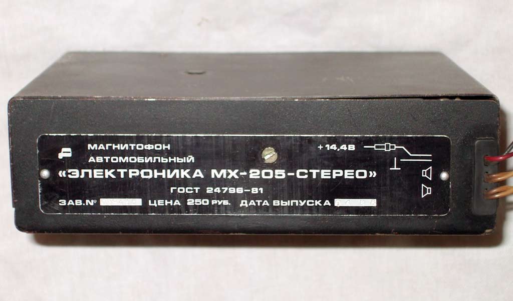 Автомобильное воспроизводящее устройство **Электроника МХ-205 стерео** выпускалось с I-кв 1985 года. АВУ предназначено для установки в отечественные легковые автомобили и обеспечивает; воспроизведение моно и стерео фонограмм звука; световую индикацию направления движения ленты; снижение ВЧ шумов; применения магнитной ленты из двуокиси хрома; автоматическое воспроизведение после перемотки кассеты. Номинальная выходная мощность 2x3 Вт. Потребляемая мощность (при номинальной выходной) 16 Вт. Диапазон рабочих частот на выходе к АС - 63...10000 Гц. Коэффициент детонации 0,3%. Относительный уровень шумов и помех с системой шумопонижени 54, без 48 дБ. Габариты АВУ - 190x170x55 мм. Габариты одной АС - 174x140x145. Масса АВУ - 2 кг. Масса одной АС - 1,05 кг. Цена комплекта АВУ - 250 рублей.