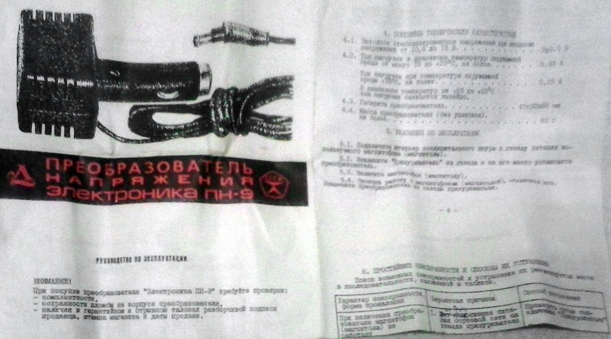 Преобразователь напряжения *Электроника ПН-9* выпускался предположительно с 1985 года Ленинградским заводом *Магнетон*. Прибор преобразует напряжение бортовой сети автомобиля 12 вольт в напряжения 9 вольт, необходимое для питания переносных магнитофонов, а так же для других целей.