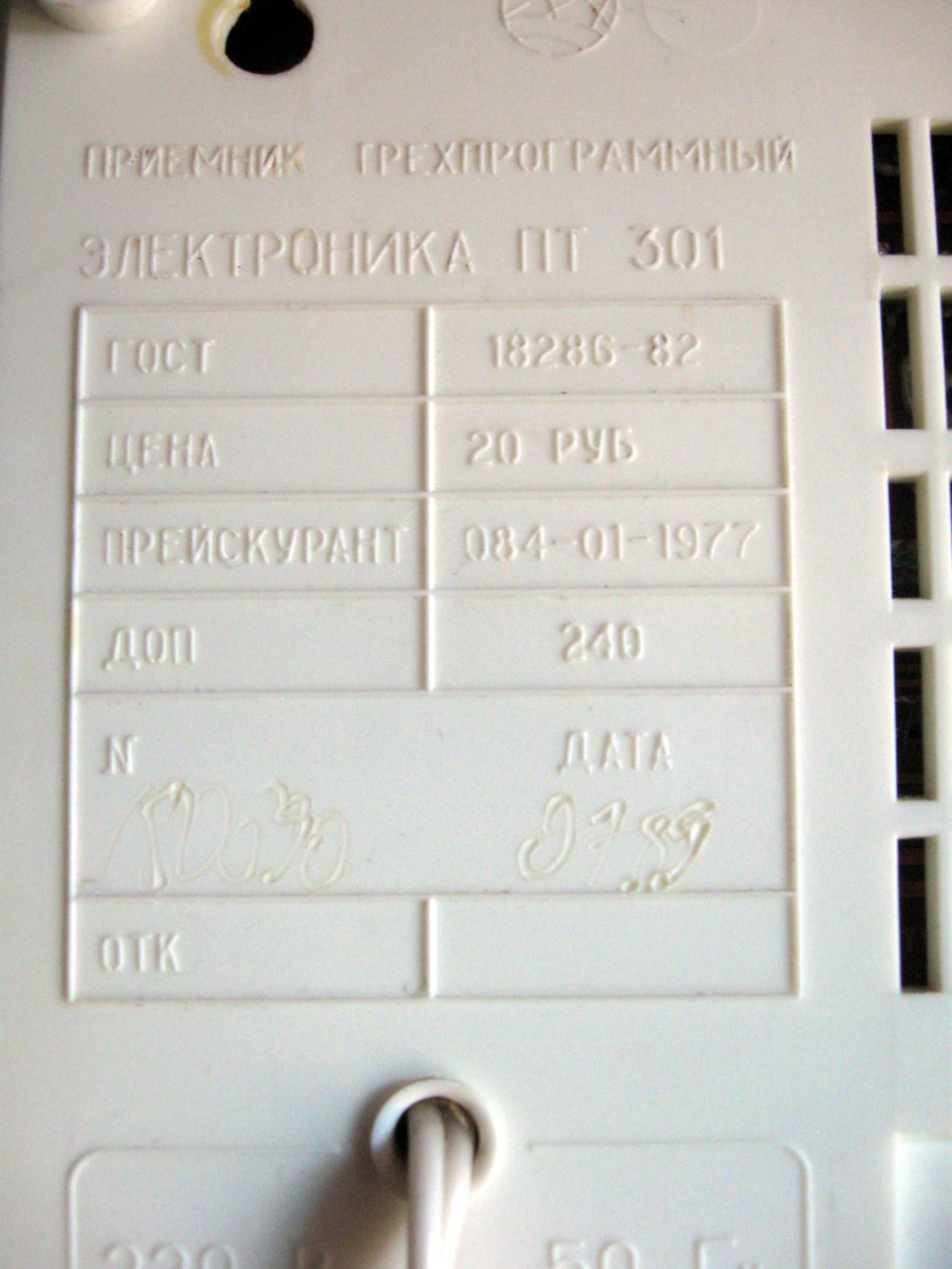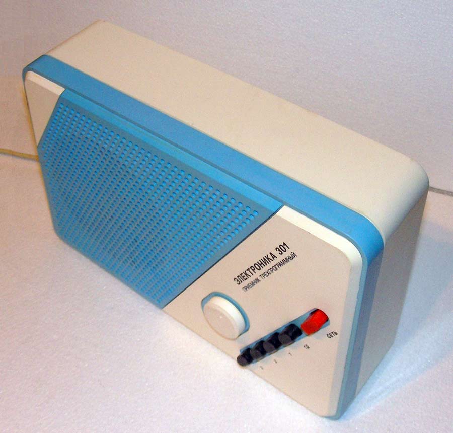 Приёмник трёхпрограммный *Электроника-301* с 1985 года выпускал Ставропольский завод *Изумруд*. ПТ предназначен для работы в радиосети трехпрограммного вещания с напряжением 30 вольт, обеспечивая приём НЧ программы с усилением и без и двух ВЧ программ. ПТ имеет гнездо для записи программ на магнитофон. Диапазон воспроизводимых звуковых частот по НЧ и ВЧ каналам - 160...6300 Гц. Номинальная выходная мощность 0,5 Вт. Потребляемая от сети мощность 4 Вт. С начала 1987 года приёмник трёхпрограммный именовался как *Электроника ПТ-301*.