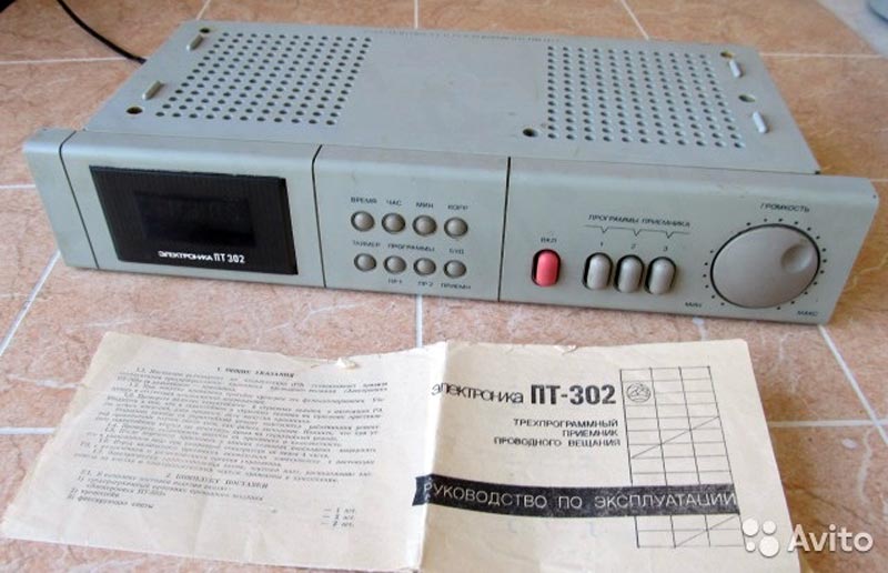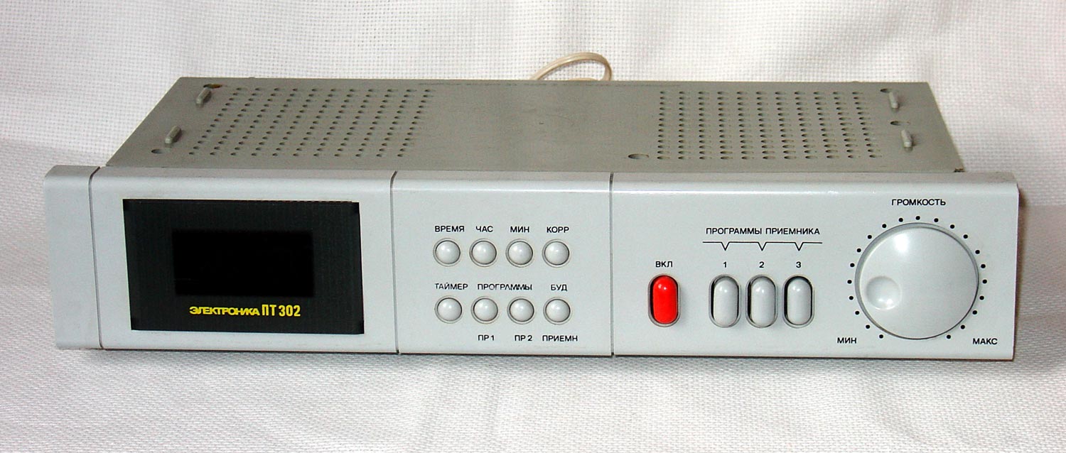 Приёмник трёхпрограммный *Электроника ПТ-302** с 1989 года выпускал Ставропольский завод *Изумруд*. ПТ предназначен для работы от сети трехпрограммного проводного вещания с напряжением НЧ тракта 30 вольт. ПТ обеспечивает приём сигнала ЗЧ с усилением и без и 2-х ВЧ сигналов с несущими частотами 78 кГц (II программа) и 120 кГц (III программа). ПТ имеет выход для записи на магнитофон. Диапазон частот по НЧ каналам 160...6300 Гц, по ВЧ - 160...6300 Гц. Номинальная выходная мощность 0,5 Вт. Мощность, потребляемая от сети 4 Вт. ПТ имеет встроенные электронные часы и таймер, позволяющий включать его в заранее установленное время.