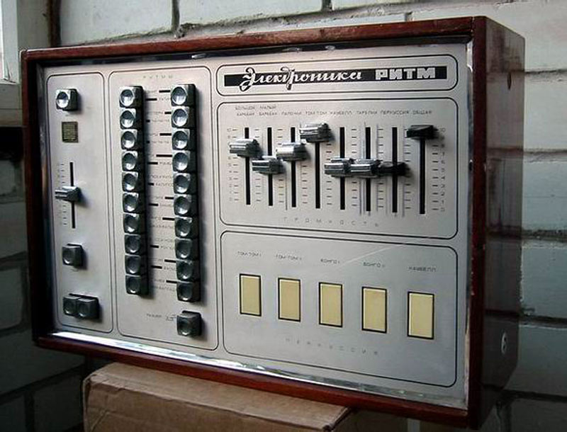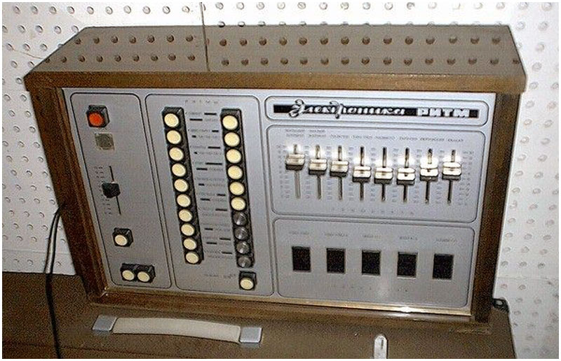 Ритмический электромузыкальный инструмент *Электроника-Ритм* выпускался с 1981 года. Он предназначен для ритмичного сопровождения танцевальных мелодий и используется в составе эстрадных инструментов, ансамблей и оркестров. *Электроника Ритм* это аналоговый драм бокс с 30-ю пресетными стилями и базовыми звуками, такими как: большой барабан, малый, рим, том, тарелки с некоторой перкуссией. Барабанные звуки имеют индивидуальный контроль (8 ползунков), также имеются 5 конопок (пэдов) для реальной игры. Ручки управления: общая громкость, темп, старт/стоп, 3/4, 4/4. Отдельная громкость для большого барабана, малого, рим, том, ковбэл, тарелок, перкуссии, общая. Пресетные ритмы: Свинг, Латин, Вестерн, Ча-ча-ча, Рок, Румба, Ритм блюз, Калипсо, Полька, Мамбо, Танго, Джаз, Вальс, Боссанова, Рок 6/8, Бегин, Вальс, Самба, Рок баллада. Питание - сеть 220 В. Потребляемая мощность 20 Вт. Габариты инструмента 500x320x180 мм. Масса 9 кг. Цена 290 рублей.