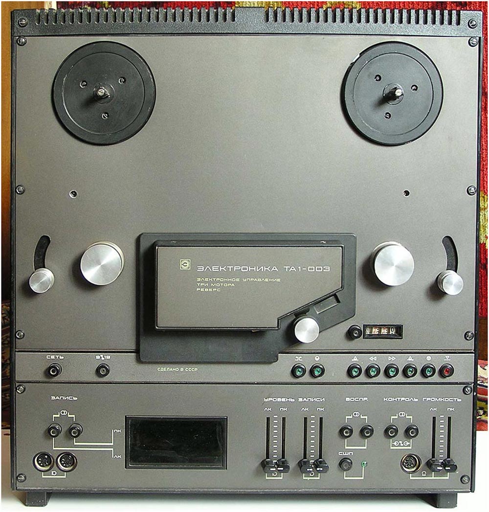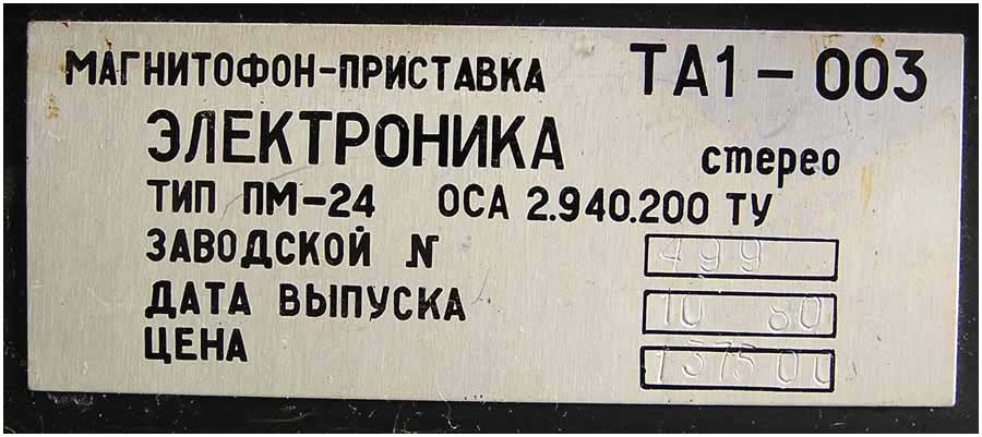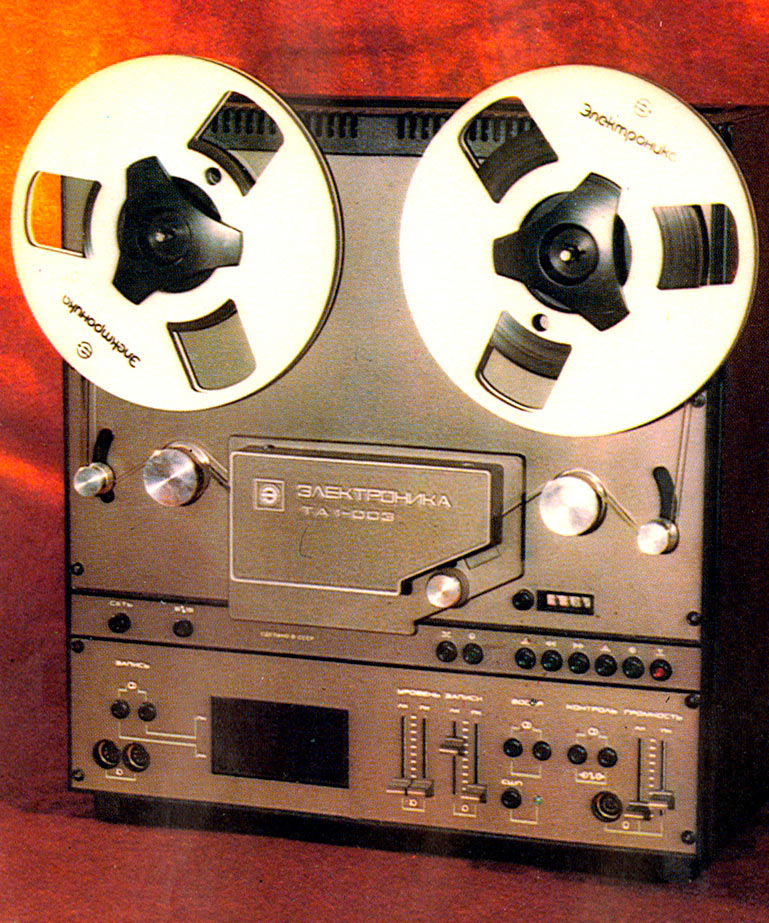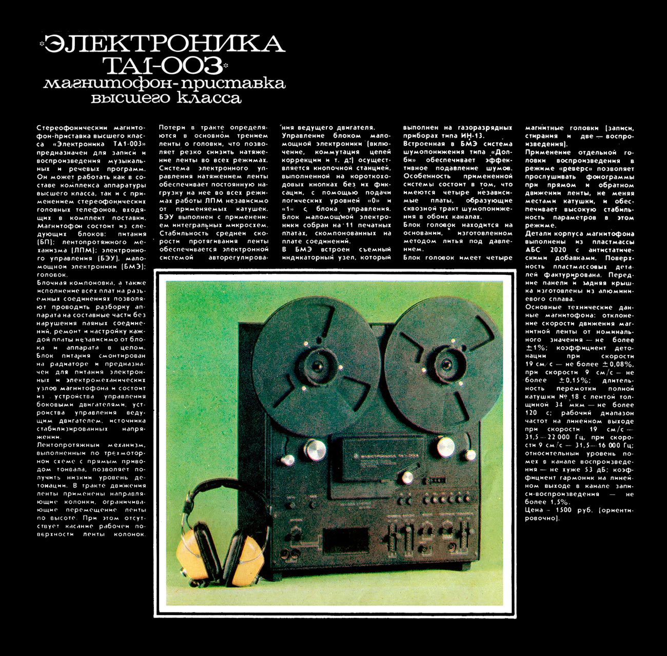 Стереофонический магнитофон-приставка *Электроника ТА1-003* с 1979 года выпускалась Фрязинским заводом *Рений* при НПО *Исток*, а с 1980 года и Кировским электромашиностроительным производственным объединением имени Лепсе. МП со сквозным каналом *Электроника ТА1-003* предназначена для высококачественной записи фонограмм на магнитные ленты типа А4409-6Б и А4309-6Б с последующим или одновременным воспроизведением через внешний усилитель с АС или на стереофонические телефоны. От подобных аппаратов высшего класса эту модель отличает блочно-модульная конструкция, широкое использование электронной коммутации и высокая автоматизация 3-х двигательного блока ЛПМ. В МП имеется: система автоматического управления ведущим двигателем прямого привода; устройство для электронного торможения; система стабилизации натяжения магнитой ленты во всех режимах работы; фотоэлектрический автостоп. Имеются следующие режимы: воспроизведение вперед и назад (реверс); ускоренная перемотка ленты в обоих направлениях; *Запись*; *Стоп*; *Пауза*; *Откат*. Перевод из одного режима в другой осуществляется электронным устройством с псевдосенсорным управлением, исключающим деформацию ленты при нажатии кнопки выбранного режима, минуя кнопку *Стоп* при случайном нажатии на несколько кнопок и в других случаях. Имеется: система шумопонижения, работающая в сквозном канале; 4-х разрядный счетчик ленты с автономным датчиком; газоразрядный индикатор уровня записи и воспроизведения; беспровоной пульт ДУ с подключением стереотелефонов. МП собрана на 40 микросхемах, 132 транзисторах, 80 диодах, 4 оптронах и 2 симисторах. Краткие характеристики: диаметр катушки 270 мм; скорость ЛПМ - 19,05; 9,53 см/сек; коэффициент детонации при скорости ленты 19,05 см/сек - ±0,08%, 9,53 см/сек - ±0,15%; рабочий диапазон частот на ЛВ при скорости ленты 19,05 см/сек - 31,5...22000 Гц; 9,53 см/с - 31.5...16000 Гц; относительный уровень помех в канале воспроизведения -53 дБ; записи/воспроизведения -62 дБ; снижение относительного уровня помех при включении СШП до 8 дБ; коэффициент гармоник 1,2%; номинальное напряжение сигнала на ЛВ - 0,4...0,6 В; номинальная выходная мощность усилителей стереотелефонов на нагрузке 8 Ом - 1 мВт; потребляемая мощность 130 Вт. Габариты МП - 491х220х456 мм, масса 27 кг.