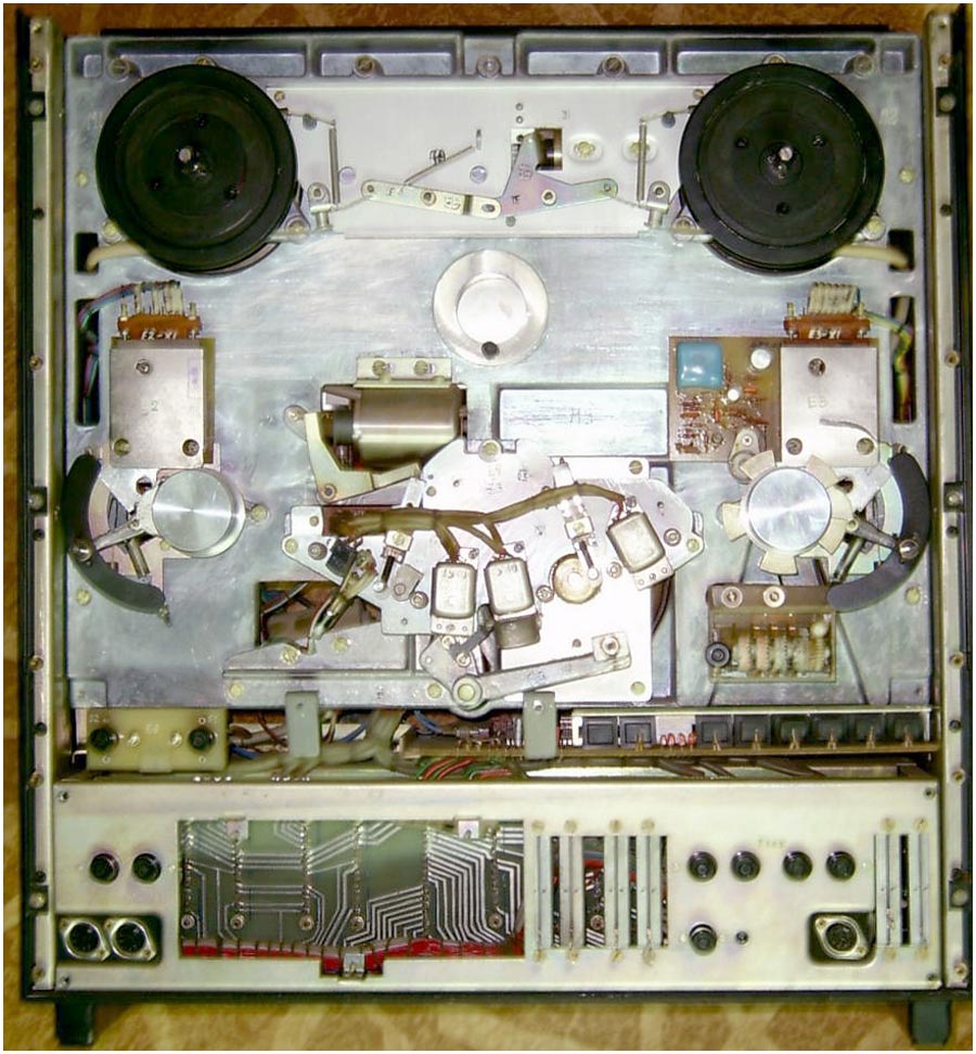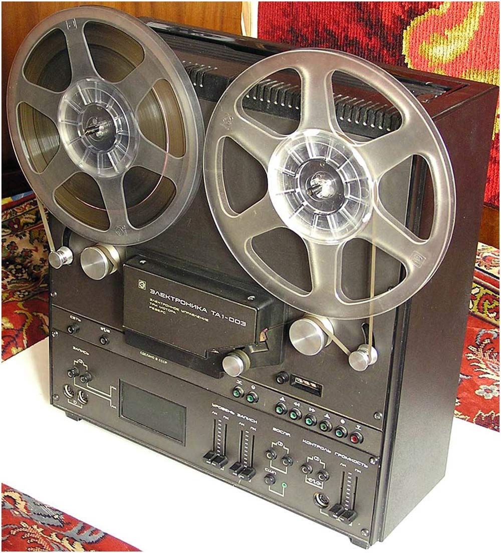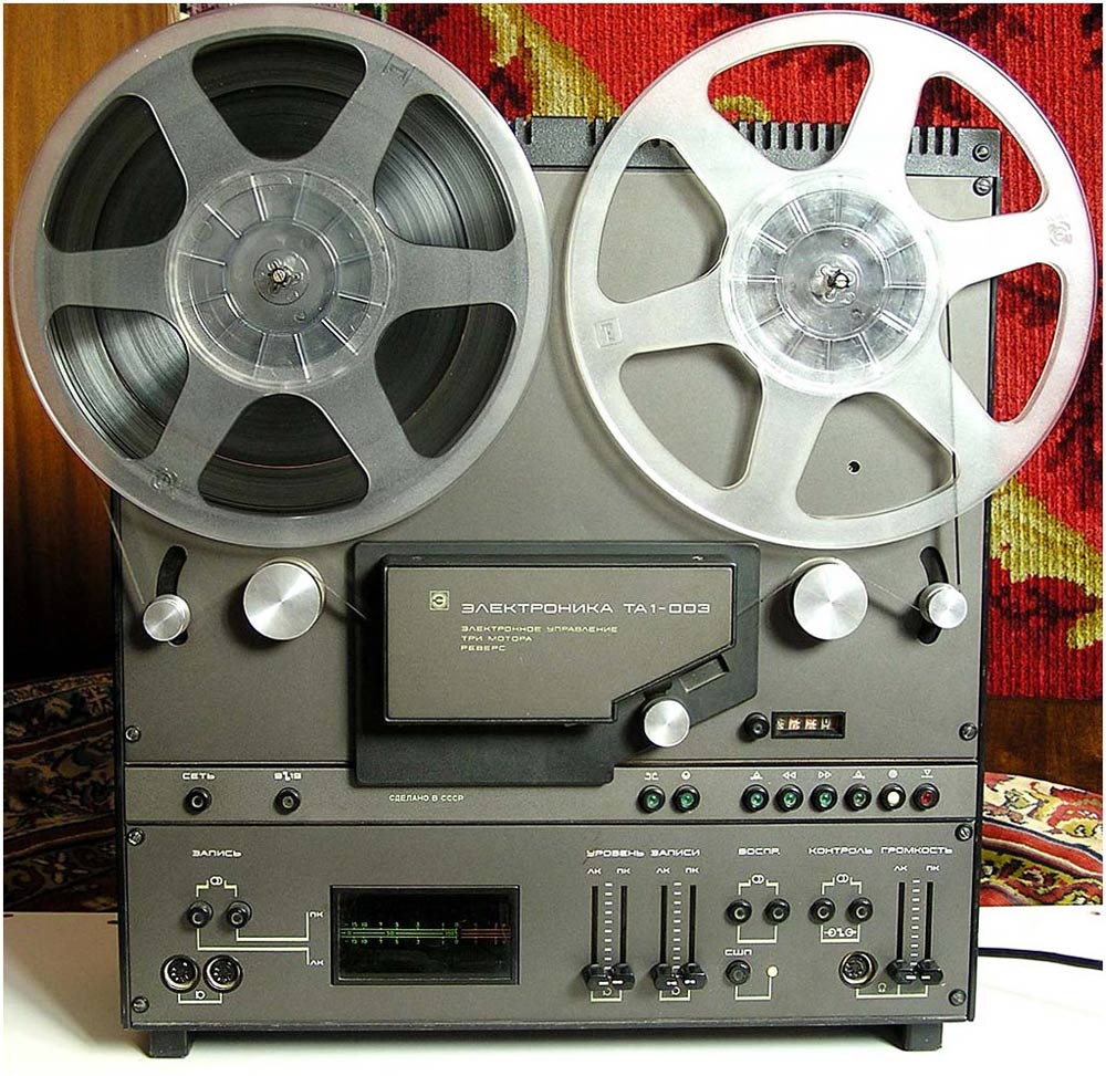 Стереофонический магнитофон-приставка *Электроника ТА1-003* с 1979 года выпускалась Фрязинским заводом *Рений* при НПО *Исток*, а с 1980 года и Кировским электромашиностроительным производственным объединением имени Лепсе. МП со сквозным каналом *Электроника ТА1-003* предназначена для высококачественной записи фонограмм на магнитные ленты типа А4409-6Б и А4309-6Б с последующим или одновременным воспроизведением через внешний усилитель с АС или на стереофонические телефоны. От подобных аппаратов высшего класса эту модель отличает блочно-модульная конструкция, широкое использование электронной коммутации и высокая автоматизация 3-х двигательного блока ЛПМ. В МП имеется: система автоматического управления ведущим двигателем прямого привода; устройство для электронного торможения; система стабилизации натяжения магнитой ленты во всех режимах работы; фотоэлектрический автостоп. Имеются следующие режимы: воспроизведение вперед и назад (реверс); ускоренная перемотка ленты в обоих направлениях; *Запись*; *Стоп*; *Пауза*; *Откат*. Перевод из одного режима в другой осуществляется электронным устройством с псевдосенсорным управлением, исключающим деформацию ленты при нажатии кнопки выбранного режима, минуя кнопку *Стоп* при случайном нажатии на несколько кнопок и в других случаях. Имеется: система шумопонижения, работающая в сквозном канале; 4-х разрядный счетчик ленты с автономным датчиком; газоразрядный индикатор уровня записи и воспроизведения; беспровоной пульт ДУ с подключением стереотелефонов. МП собрана на 40 микросхемах, 132 транзисторах, 80 диодах, 4 оптронах и 2 симисторах. Краткие характеристики: диаметр катушки 270 мм; скорость ЛПМ - 19,05; 9,53 см/сек; коэффициент детонации при скорости ленты 19,05 см/сек - ±0,08%, 9,53 см/сек - ±0,15%; рабочий диапазон частот на ЛВ при скорости ленты 19,05 см/сек - 31,5...22000 Гц; 9,53 см/с - 31.5...16000 Гц; относительный уровень помех в канале воспроизведения -53 дБ; записи/воспроизведения -62 дБ; снижение относительного уровня помех при включении СШП до 8 дБ; коэффициент гармоник 1,2%; номинальное напряжение сигнала на ЛВ - 0,4...0,6 В; номинальная выходная мощность усилителей стереотелефонов на нагрузке 8 Ом - 1 мВт; потребляемая мощность 130 Вт. Габариты МП - 491х220х456 мм, масса 27 кг.