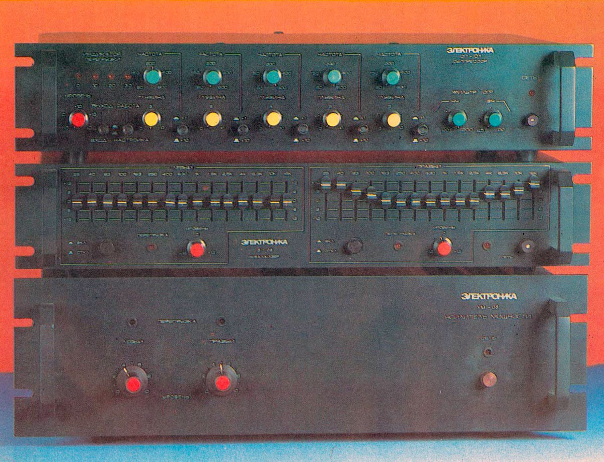 Двухканальный усилитель мощности *Электроника УМ-08* планировалось выпускать с 1988 года Брянским заводом полупроводниковых приборов. УМ предназначен для работы с любыми акустическими системами с электрическим сопротивлением 4 Ом и мощностью не менее 100 Вт. Усилитель мощности предназначен для любительских эстрадных коллективов, совместно с эквалайзером *Электроника Э-06* и режектроным фильтром *Электроника СП-01*. Технические характеристики УМ: диапазон воспроизводимых частот - 20...20000 Гц; отношение сигнал/помеха - 80 дБ; номинальная выходная мощность - 2x100 Вт; коэффициент гармоник - 0,15 %. Размеры УМ - 485x410x150 мм. Масса 18 кг.