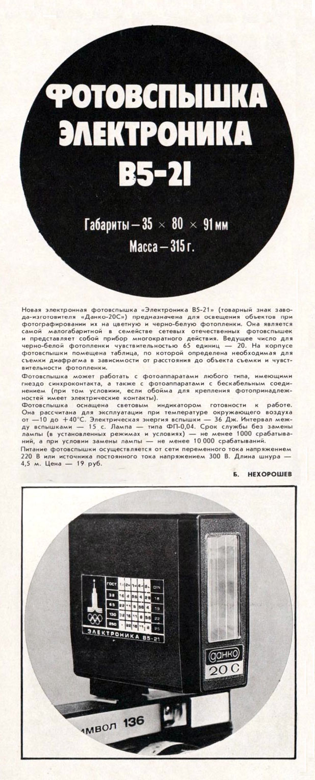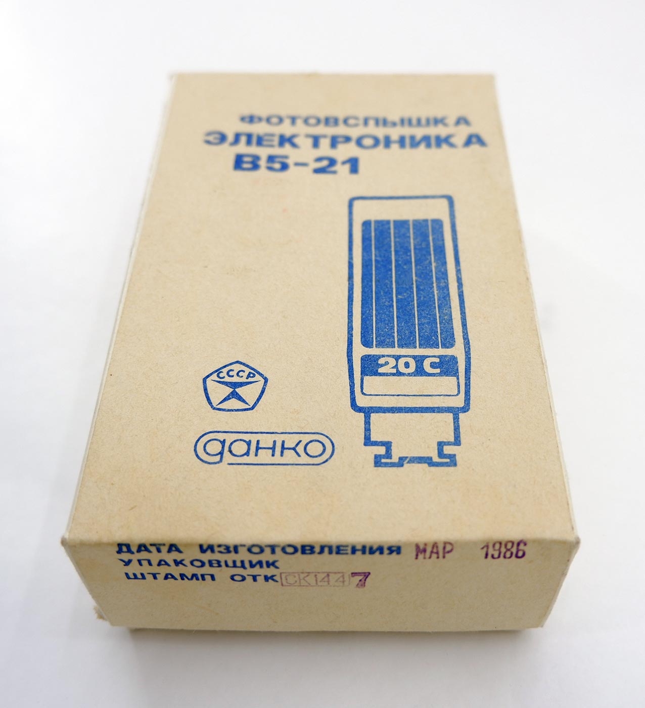 Фотовспышка *Электроника В5-21* выпускалась с 1979 года предприятием, с товарным знаком *Данко-20*. Фотовспышка предназначена для мгновенного освещения объектов при фотографировании на цветную и чёрно-белую фотопленку. Фотовспышка может работать с фотоаппаратами, имеющими гнездо для синхроконтакта или обойму с электрическим контактом для крепления различных фотопринадлежностей. Питание от электрической сети. Длина шнура питания 3,5 метра. Ведущее число для плёнки чувствительностью 65 ед, ГОСТ 5554-70 20. Электрическая энергия вспышки 38 Дж. Углы излучения в горизонтальной и вертикальной плоскостях 50...70 градусов. Интервал между вспышками от 15 до 60 секунд. Габариты фотовспышки 35x95x91 мм. Масса 320 грамм. Цена фотовспышки в разное время 16 и 19 рублей.