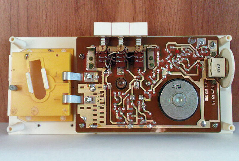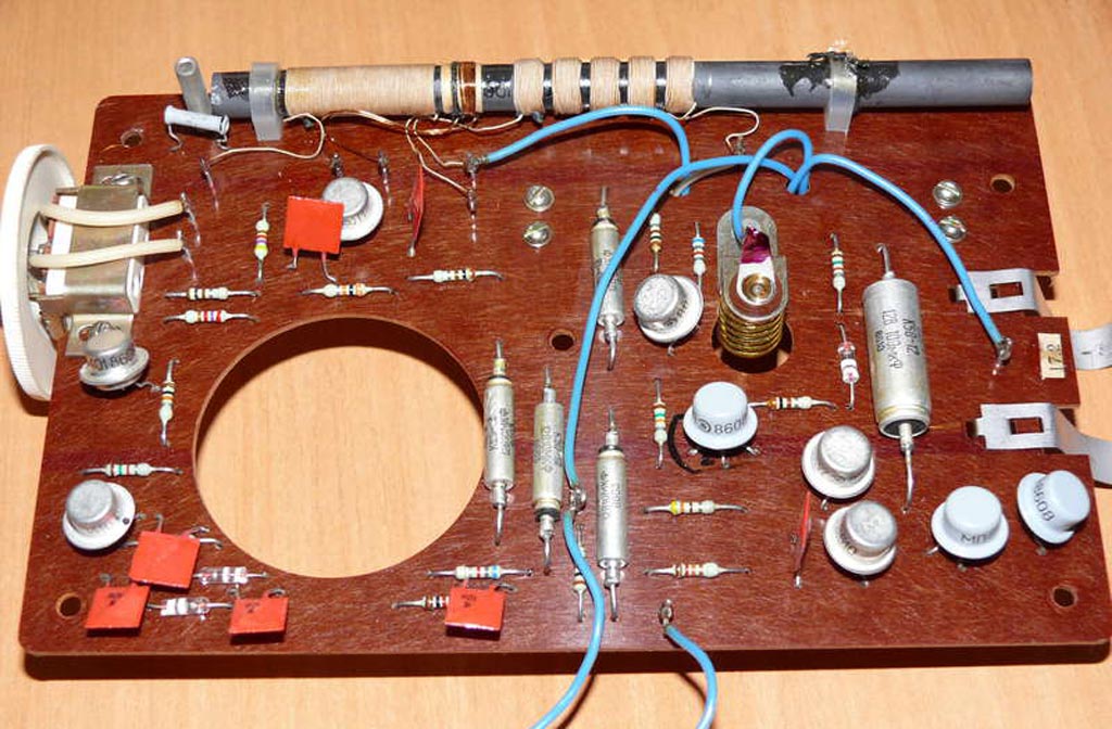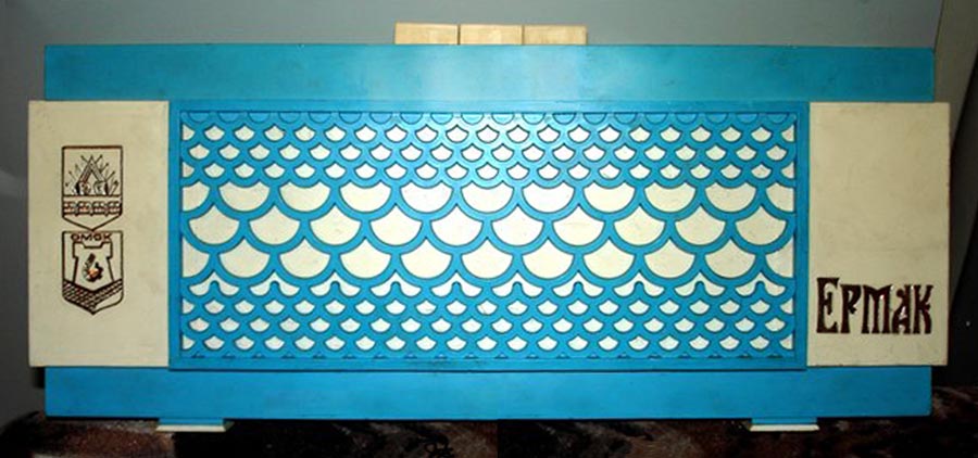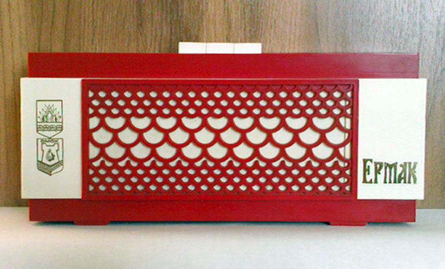 Стационарный транзисторный радиоприёмник *Ермак* с начала 1979 года выпускал Омский приборостроительный завод имени Козицкого. Настольный сувенир *Ермак* с гербами города Омска представляет собой радиоприёмник прямого усиления, который работает в диапазонах длинных (ДВ) и средних (СВ) волн. Сувенир может использоваться так же и в качестве кратковременного маломощного светильника. Радиоприёмник собран на девяти германиевых транзисторах. Сувенир *Ермак* имеет переключатель рода работ и ручку для настройки на радиовещательные станции. Регулятор громкости в сувенире не предусмотрен. Диапазоны принимаемых радиочастот: длинные волны 145...700 кГц, средние волны 500...1700 кГц. Избирательность по соседним каналам в диапазоне ДВ - 8..10 дБ, СВ - 6...8 дБ. Чувствительность на магнитную антенну в диапазонах ДВ, СВ - 5..7 мВ/м. Номинальная выходная мощность - 100 мВт, максимальная - 150 мВт. Диапазон воспроизводимых звуковых частот 250...5000 Гц, достаточно качественное звучание которое несколько портится расположением громкоговорителя на задней стенке сувенира, с выходом звукового давления туда же. Питание осуществляется от батареи типа *КБС-Л*, напряжением - 4,5 В. В 1988 году электрическая схема сувенира переведена на кремниевые транзисторы в том же количестве. Технические характеристики приёмника - прежние.