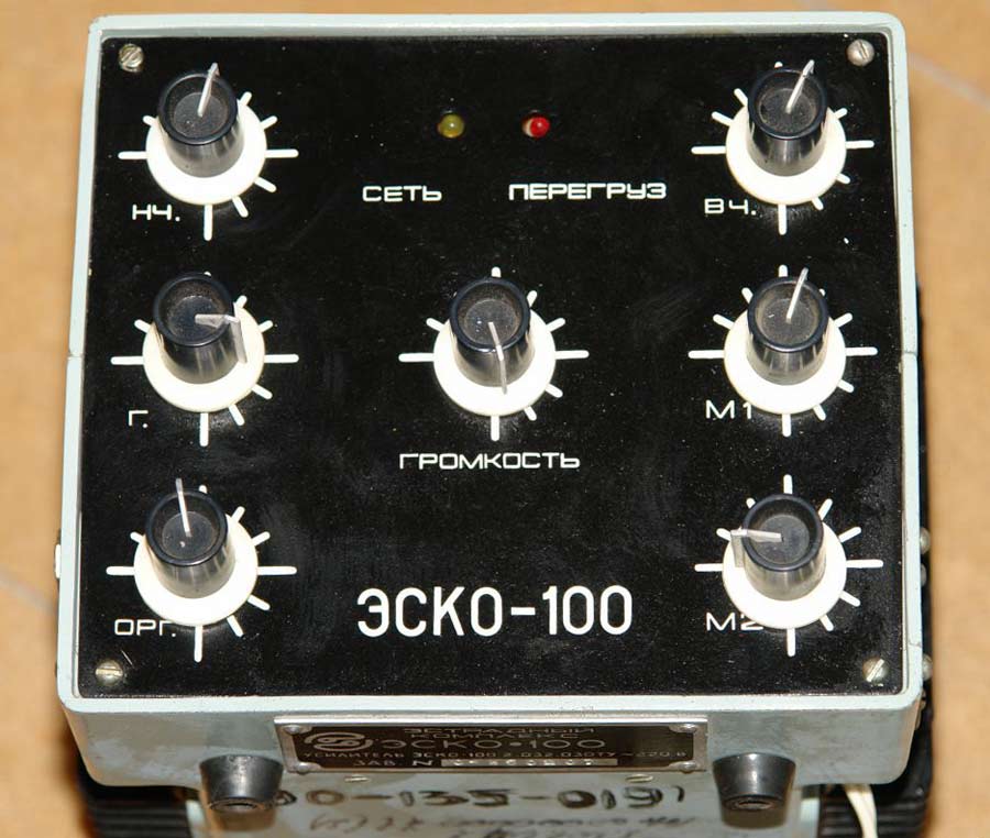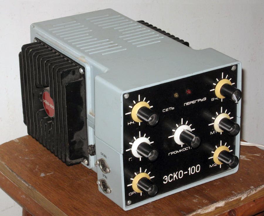 Эстрадный усилитель *ЭСКО-100* с 1980 года выпускал а/я 95, г. Качканар, Свердловской области. Усилитель эстрадный для ЭМИ и солиста с громкоговорителем *ЭСКО-100* предназначен для усиления и воспроизведения через АС электрических сигналов. Рабочий диапазон частот по электрическому напряжени. 40...20000 Гц. Номинальное сопротивление нагрузки 5 Ом. Номинальная выходная мощность 50 Вт, максимальная 65 Вт. Потребляемая от сети мощность достигает 120 Вт. Паспортная мощность громкоговорителя (Форманта-1) 50 Вт. Габариты усилителя 290х190х160 мм. Масса 8 кг.