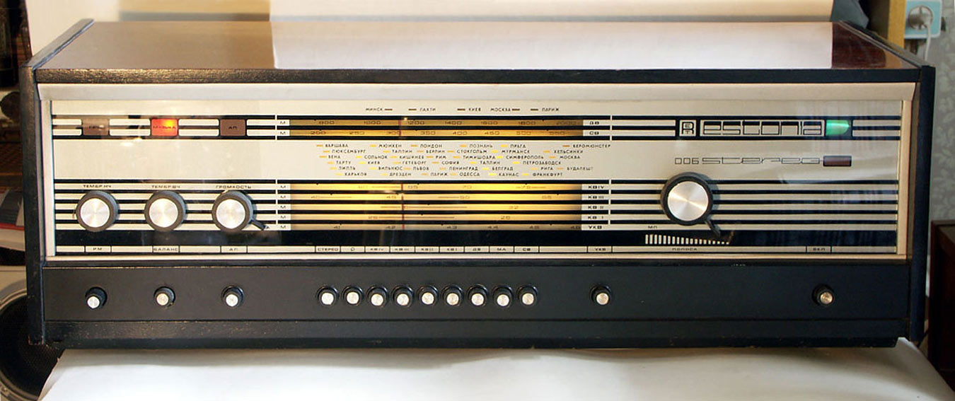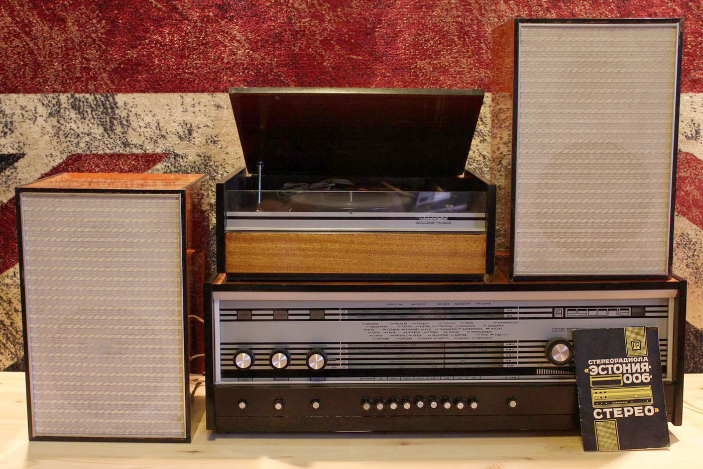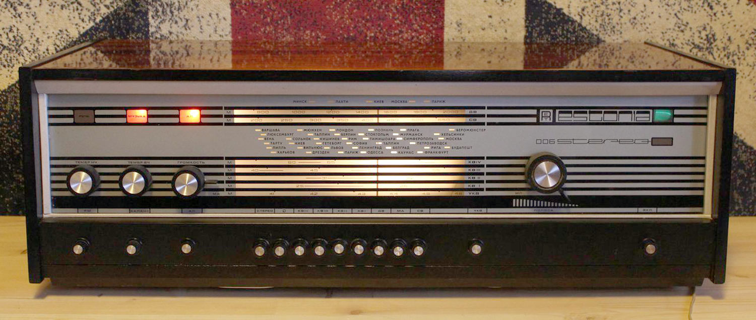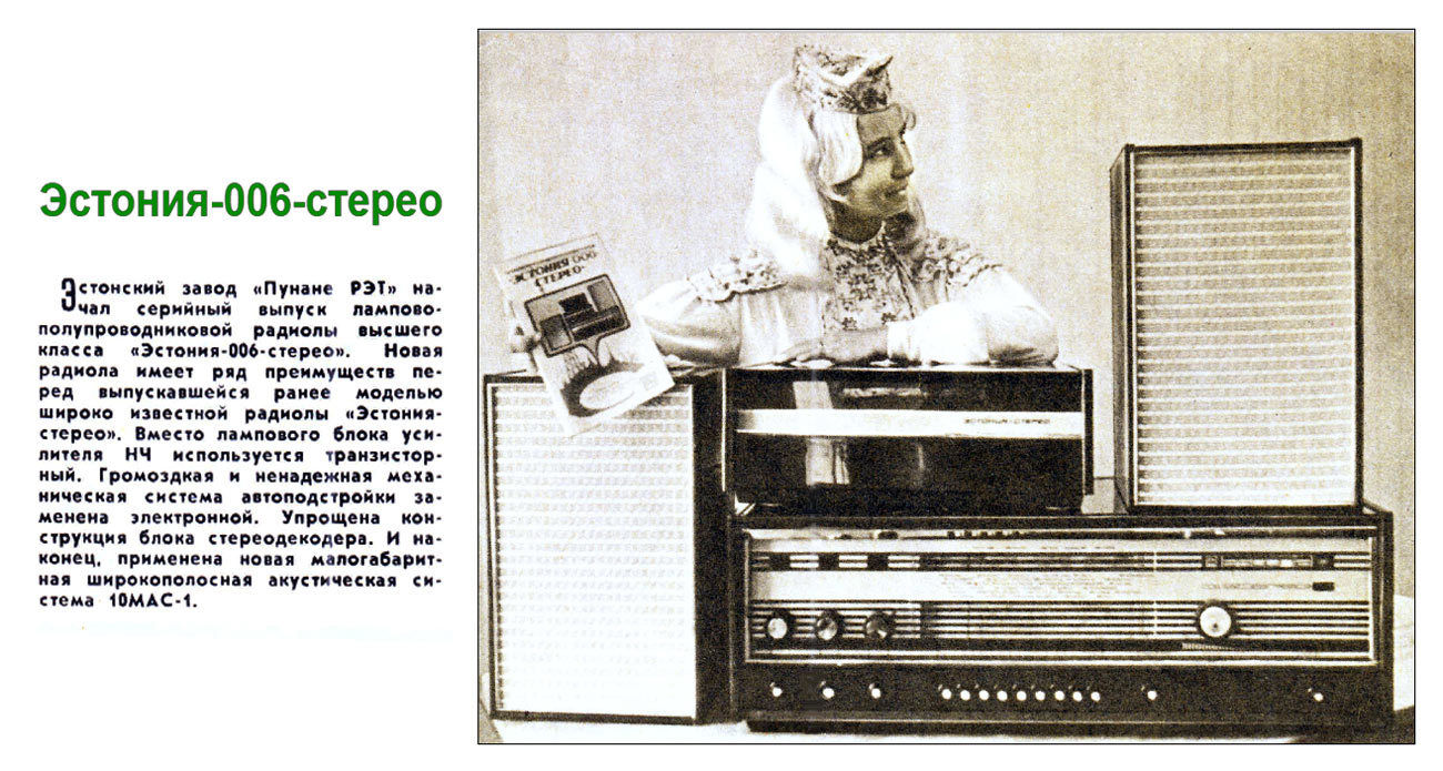 Радиола сетевая ламповая *Эстония-006-стерео* с 1973 года выпускалась Таллинским заводом Пунане-РЭТ. Разработана на основе радиолы **Эстония-стерео** и имеет ряд эксплуатационных преимуществ. Ламповый усилитель заменен транзисторным. Электромоторная система АПЧ в диапазоне УКВ заменена электронной. Использованы широкополосные малогабаритные АС *10МАС-1*. Радиола состоит из всеволнового вещательного приёмника, электропроигрывающего устройства II-ЭПУ-52С и двух АС. Приёмник работает в диапазонах ДВ, СВ, КВ и УКВ-ЧМ. Чувствительность с антенны в диапазонах АМ - 50 мкВ, ЧМ - 5 мкВ. Избирательность в диапазонах АМ 60 дБ. Ослабление сигнала зеркального канала в диапазонах ДВ 60 дБ, СВ 50 дБ, KB 26 дБ и УКВ 30 дБ. АРУ позволяет получить изменение выходного сигнала не более 6,5 дБ при изменении входного сигнала на 60 дБ. Номинальная выходная мощность - 2х10 Вт при КНИ - 2%, максимальная - 2х25 Вт. Диапазон частот по звуковому давлению 63...16000 Гц при неравномерности АЧХ 14 дБ. Пределы регулировки тембра 14 дБ. Уровень фона со входа УНЧ не хуже 60 дБ. Переходные затухания между каналами 30 дБ с антенного входа и 40 дБ со входа УНЧ. ЭПУ имеет 3 скорости 33, 45 и 78 об/мин, автостоп и микролифт. Размеры радиоприёмника 790х270х340 мм, масса 25 кг, размеры ЭПУ 450х160х330 мм, масса 10 кг, размеры одной АС 420х247х270 мм, масса одной АС - 9 кг. Цена комплекта - 470 рублей. Реклама РЛ в Радио №1 за 1973 год.