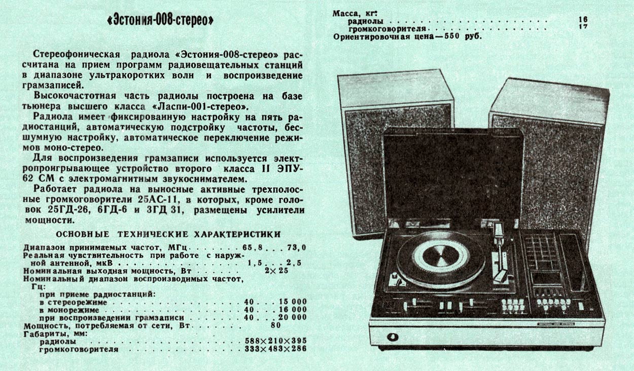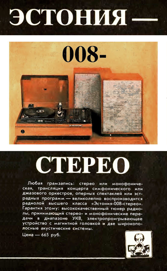 Стереофоническая радиола высшего класса *Эстония-008-стерео* с 1979 года выпускалась Таллинским заводом *Пунане-РЭТ*. Радиола принимает моно и стереофонические передачи в диапазоне УКВ, воспроизводит моно и стереофонические грампластинки. К ней можно подключать магнитофон на записи с тюнера или ЭПУ и воспроизведения фонограмм. Есть АПЧ, БШН, фиксированная настройка на пять радиостанций, регулировка тембров, отключаемая система тонкомпенсации, регулировка стереобаланса. Для контроля есть стрелочный и световой индикаторы настройки, индикатор стереопередачи, два индикатора уровня выходной мощности в трактах НЧ, контрольный динамик. В радиоле применены активные АС. Диапазон 65,8...73 МГц. Чувствительность 2,5 мкВ. Номинальная выходная мощность 2х25, максимальная 2х35 Вт. Диапазон рабочих частот при приёме в режимах: *стерео* - 40...15000 Гц, *моно* - 40...16000 Гц, при работе ЭПУ - 40...20000 Гц. Потребляемая мощность 80 Вт. Габариты РЛ - 588x210x395 мм, одной АС - 330х483х386 мм. Масса радиолы 16 кг, АС 17 кг.