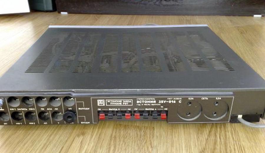 Стереофонический полный усилитель *Эстония 35У-016-стерео* с 1987 года выпускал Таллинский завод *Пунане РЭТ*. Усилитель предназначен для высококачественного усиления звуковых фонограмм с различных источников. В усилителе применены: индикаторы перегрузки; фильтры ограничения высоких и низких частот; селектор входов; отключаемая тонкомпенсация; устройство защиты УМ от короткого замыкания, перегрева и постоянного напряжения на выходе; электронные индикаторы выходной мощности; встроенный корректирующий усилитель для подключения электропроигрывателя. Технические характеристики: номинальная выходная мощность 2х35 Вт; диапазон воспроизводимых частот 20...25000 Гц; коэффициент нелинейных искажений 0,04%; уровень фона -85 дБ. Потребляемая мощность 130 Вт. Габариты усилителя 430х80х360 мм. Вес 11 кг.