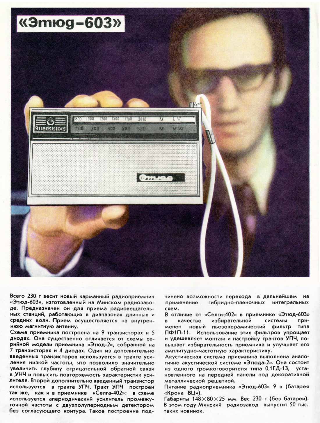 Портативный транзисторный радиоприёмник *Этюд-603* с октября 1971 года выпускал Минский радиозавод. Сначала приёмник назывался **Этюд-3**, по варианту разработки, позже **Этюд-603**. Цифры 603, означают что приёмник вне класса. Радиоприёмник является модернизацией модели **Этюд-2**, но его схема отличается от предшественника. Для переноски применён ремень в виде петли одеваемой на кисть руки. В приёмнике использованы новые кремниевые транзисторы КТ315 и пьезокерамический фильтр ПФ1П-11. Схема представляет возможность в дальнейшем перейти на интегральные МС (не сложилось). Диапазоны ДВ и СВ. Чувствительность 3,0 и 2,5 мВ/м. Селективность 16 дБ. Номинальная мощность УЗЧ - 60 мВт. Громкоговоритель 0,1ГД-13. Питание от батареи *Крона*. Ток покоя 10 мА. Габариты модели 148х80х25 мм. Масса 230 гр. Экспортный приёмник назывался *COMIX-102*.