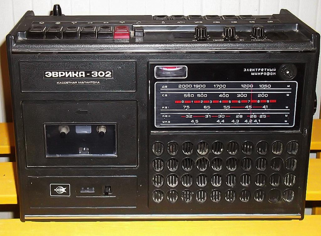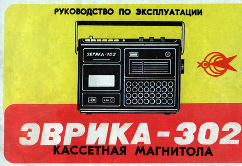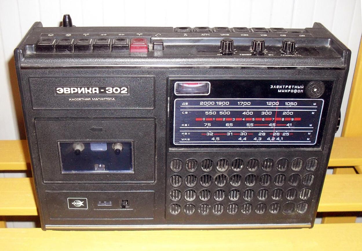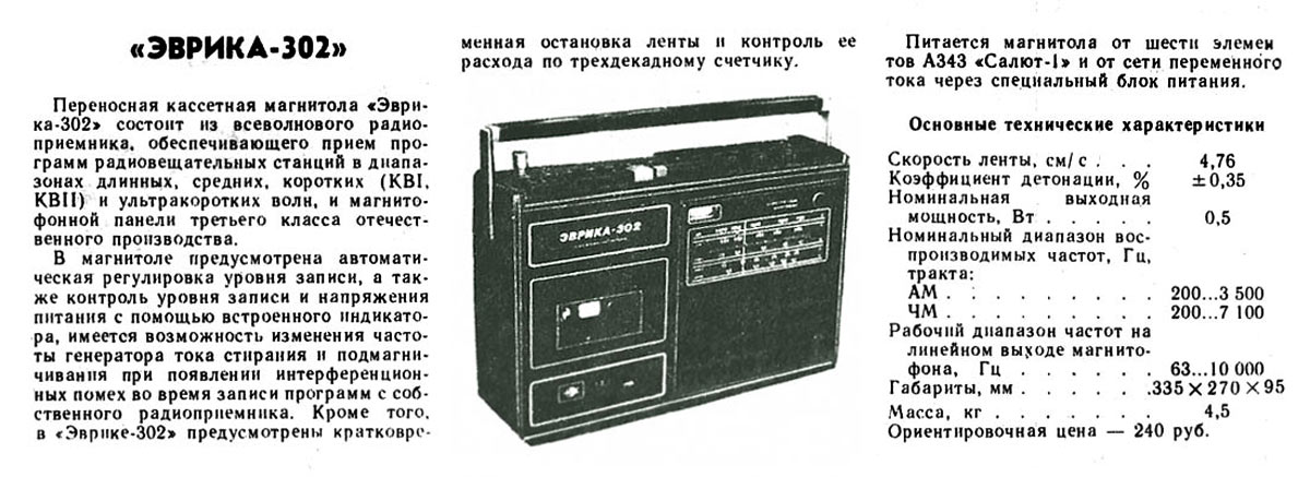 Переносная кассетная магнитола *Эврика-302* с 1980 года выпускалась Арзамасским приборостроительным производственным объединением. Магнитола 3-й группы сложности с AM-ЧМ трактами 3-й группы сложности и магнитофонной панелью 4-й группы сложности предназначена для приёма в диапазонах ДВ, СВ, KB и УКВ и для записи и воспроизведения звука с применением кассет типа МК. Магнитола позволяет производить запись с встроенного микрофона, внешнего микрофона, приёмника, телевизора, радиолинии, звукоснимателя или внешнего магнитофона. Качественную запись обеспечивает неотключаемая система АРУЗ. Уровень напряжения питания контролируется индикатором. Расход ленты осуществляется счётчиком. В модели имеется устройство временной остановки ленты. К магнитоле можно подключить усилитель с АС. В ДВ, СВ приём ведется на внутреннюю магнитную антенну, в KB и УКВ на телескопическую. Имеется гнездо для подключения внешней антенны. Питание магнитолы осуществляется от 6-ти элементов А-343 или от сети через БП. Время работы магнитолы от комплекта батарей ~ 10 часов. Номинальная выходная мощность 0,5 Вт, максимальная 0,8 Вт. Диапазон принимаемых волн: ДВ - 2027...1050 м, СВ - 571,4...186,7 м, KB-1 - 75,9...40,5 м, КВ-2 31,9...24,8 м, УКВ - 4,56...4,06 м. Чувствительность в диапазонах ДВ - 2,2 мВ/м, СВ - 1,2 мВ/м, KB-1,2 - 0,5 мВ/м, УКВ - 0,1 мВ/м. Диапазон воспроизводимых частот в диапазонах АМ - 200...3550 Гц, УКВ-ЧМ - 200...7100 Гц. Диапазон воспроизводимых частот при работе МП на линейном выходе 63...10000 Гц. Скорость протяжки ленты 4,76 см/с. Коэффициент детонации 0,4%. Габариты модели - 335х270х95 мм. Масса 4,5 кг. Цена магнитолы 250 рублей.