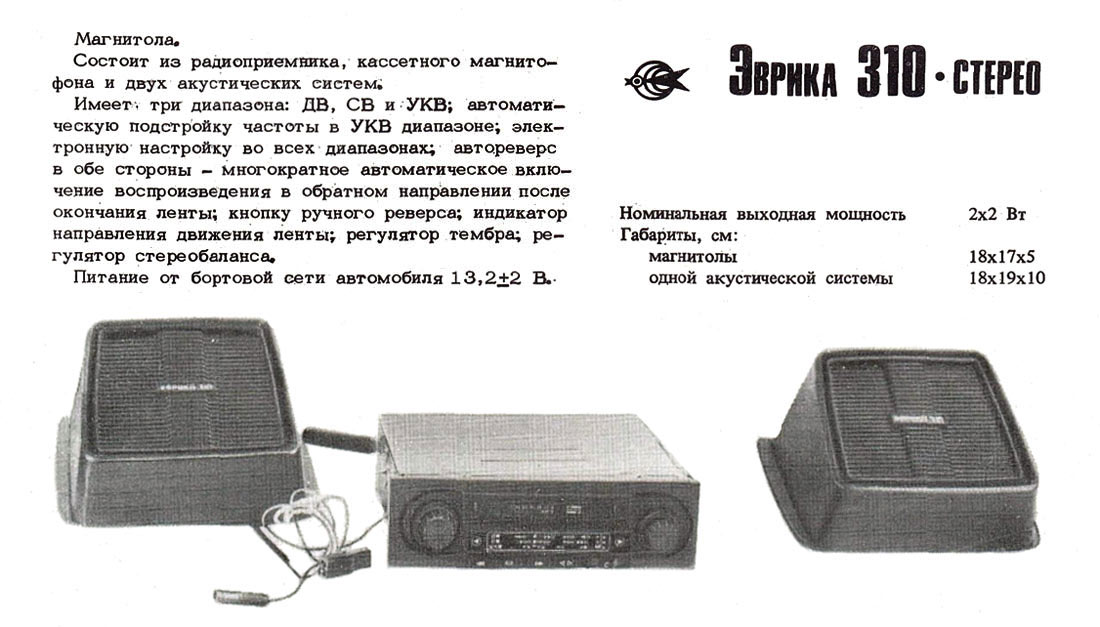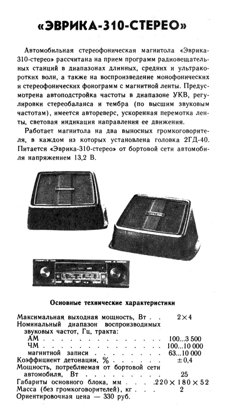 Автомобильная стереофоническая магнитола *Эврика-310-стерео* с 1980 года выпускалась Арзамасским приборостроительным заводом им. 50-летия СССР. Магнитола рассчитана на приём программ радиовещательных станций в диапазонах ДВ, СВ и УКВ, а также на воспроизведение моно и стереофонических фонограмм с магнитной ленты. Предусмотрена автоподстройка частоты в диапазоне УКВ, регулировки стереобаланса и тембра по ВЧ, имеется автореверс, ускоренная перемотка магнитной ленты, световая индикация направления ее движения. Работает магнитола на два выносных громкоговорителя, в каждом из которых установлена головка 2ГД-40. Питание от бортовой сети автомобиля. Максимальная выходная мощность 2х4 Вт. Номинальный диапазон звуковых частот в тракте: AM - 100...3500 Гц, ЧМ - 100...10000 Гц, магнитной записи - 63...10000 Гц. Коэффициент детонации ±0,4%. Мощность, потребляемая от бортовой сети автомобиля 25 Вт. Габариты основного блока 220х180х52 мм. Масса без АС 2 кг. Цена 330 рублей.
