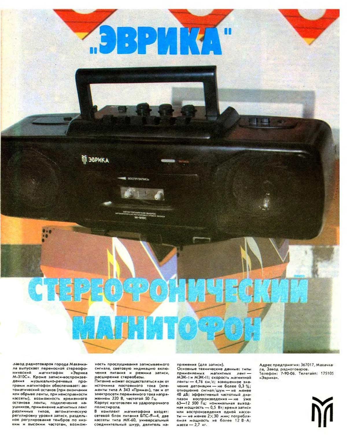 Стереофонический магнитофон *Эврика М-310С* с 1992 года выпускал Махачкалинский завод радиотоваров. В магнитофоне имеется автостоп при окончании и обрыве ленты в кассете и её заедании, АРУЗ, регулировка тембров, световая индикация включения питания и режима записи, пауза, расширения стереобазы, подключение стереотелефонов. Питание от сети через выносной БП или от элементов А-343. Коэффициент детонации ± 0,3 %. Диапазон частот на ЛВ - 63...12500 Гц. Номинальная выходная мощность 0,5 Вт. Потребляемая от сети мощность 12 Вт. Габариты магнитофона - 428 х 132 х 85 мм. Масса - 2,7 кг.