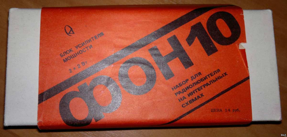 Радиоконструктор *Фон-10* с I-кв 1989 года выпускал Московский завод *Эллинг*. Блок стереофонического усилителя мощности выполнен в виде набора и предназначен для самостоятельного конструирования и модернизации радиоаппаратуры. Усилитель может работать с любой АС, имеющей сопротивление не менее 4 Ом. Блок является функционально законченным узлом, собранным с использованием линейных ИС серии К174, в виде модуля. Номинальная выходная мощность - 2х2 Вт. Диапазон усиливаемых частот - 40....20000 Гц. Чувствительность усилителя 0,25 В. Коэффициент гармоник 1%. Напряжение питания 15 В. Используя набор *Фон-10* совместно с наборами Фон-6, 7, 8, 9, 11 можно собрать высококачественный стереофонический УКВ-ЧМ приёмник.