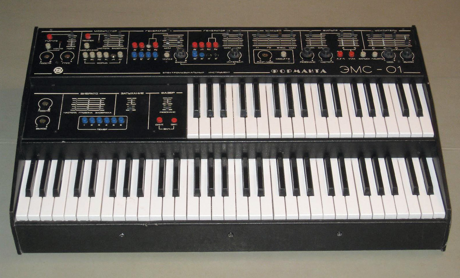 Электронный музыкальный инструмент *Форманта ЭМС-01* выпускался с 1985 года. ЭМИ состоит из полифонического органа и трехоктавного музыкального синтезатора. ЭМИ позволяет имитировать звучание клавесина, органа, вибрафона и пианино. При исполнении музыкального произведения можно изменять звучание ЭМИ с помощью таких эффектов, как трехточечный унисон, тембровое, частотное и фазовое вибрато, глубокое глиссандо, стереофейзер, хорус. Есть возможность и безмикрофонной записи исполнения на магнитофон и прослушивания собственной игры с помощью головных телефонов. Инструмент рассчитан на работу с внешним УКУ и АС. Звуковой диапазон полифонического органа от «фа» большой октавы до «ми» третьей октавы, синтезатора девяти октав; объём клавиатуры соответственно 5 и 3 октавы; номинальное выходное напряжение 1 В; габариты ЭМИ 860х210х480 мм; вес 30 кг. Цена 2800 рублей.